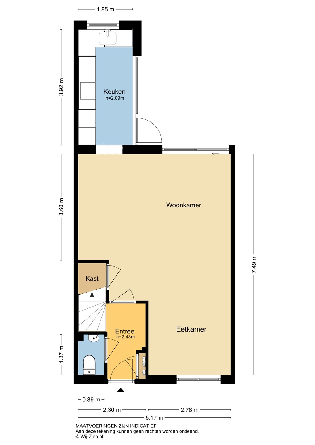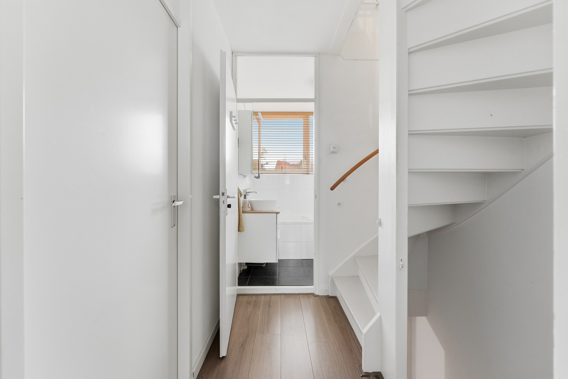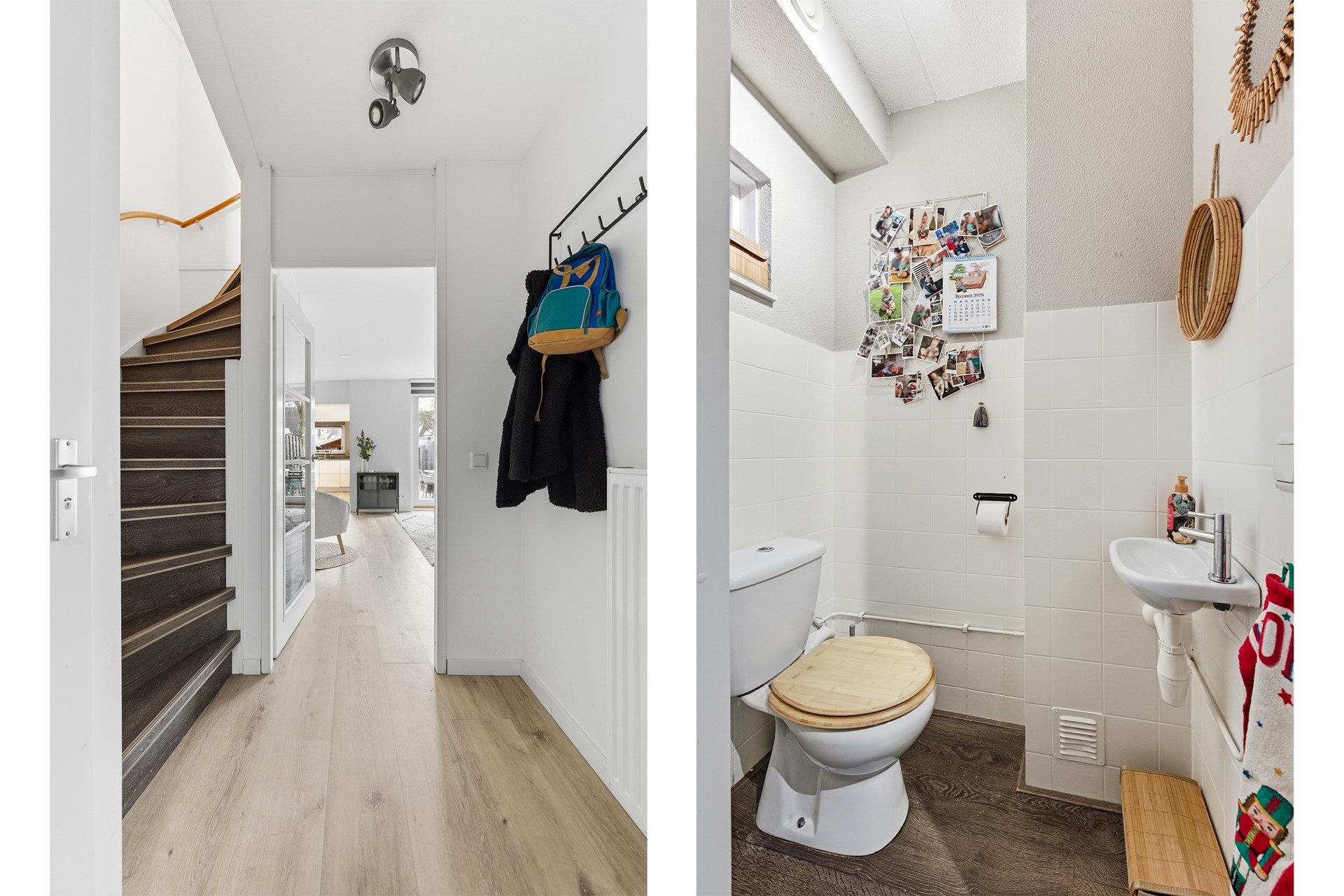 Entree: De hal biedt toegang tot de toiletruimte, de woonkamer, de meterkast en de trap naar de eerste verdieping. De hal is afgewerkt met een PVC-vloer, gestuukte wanden en een spuitwerk plafond.
