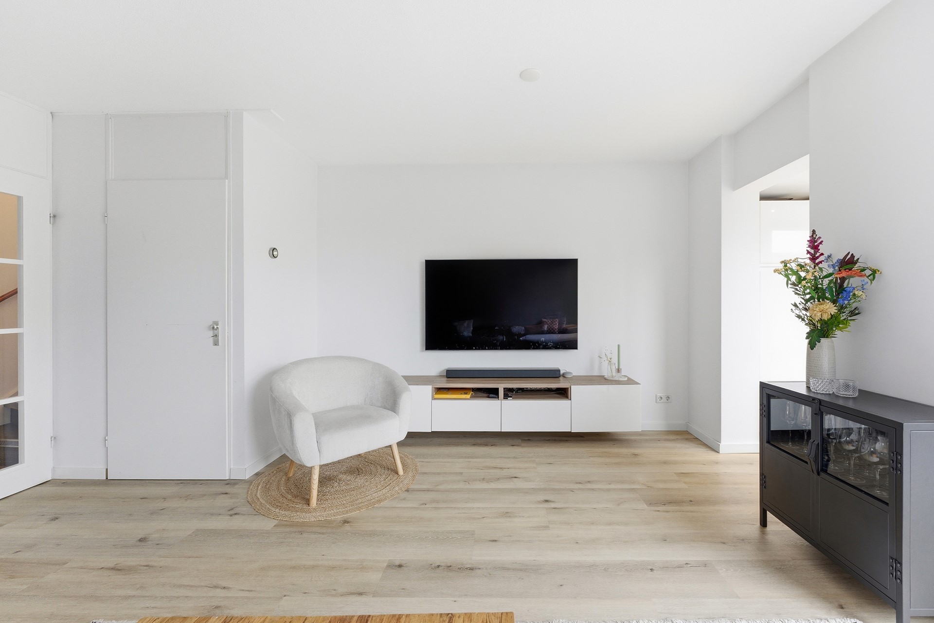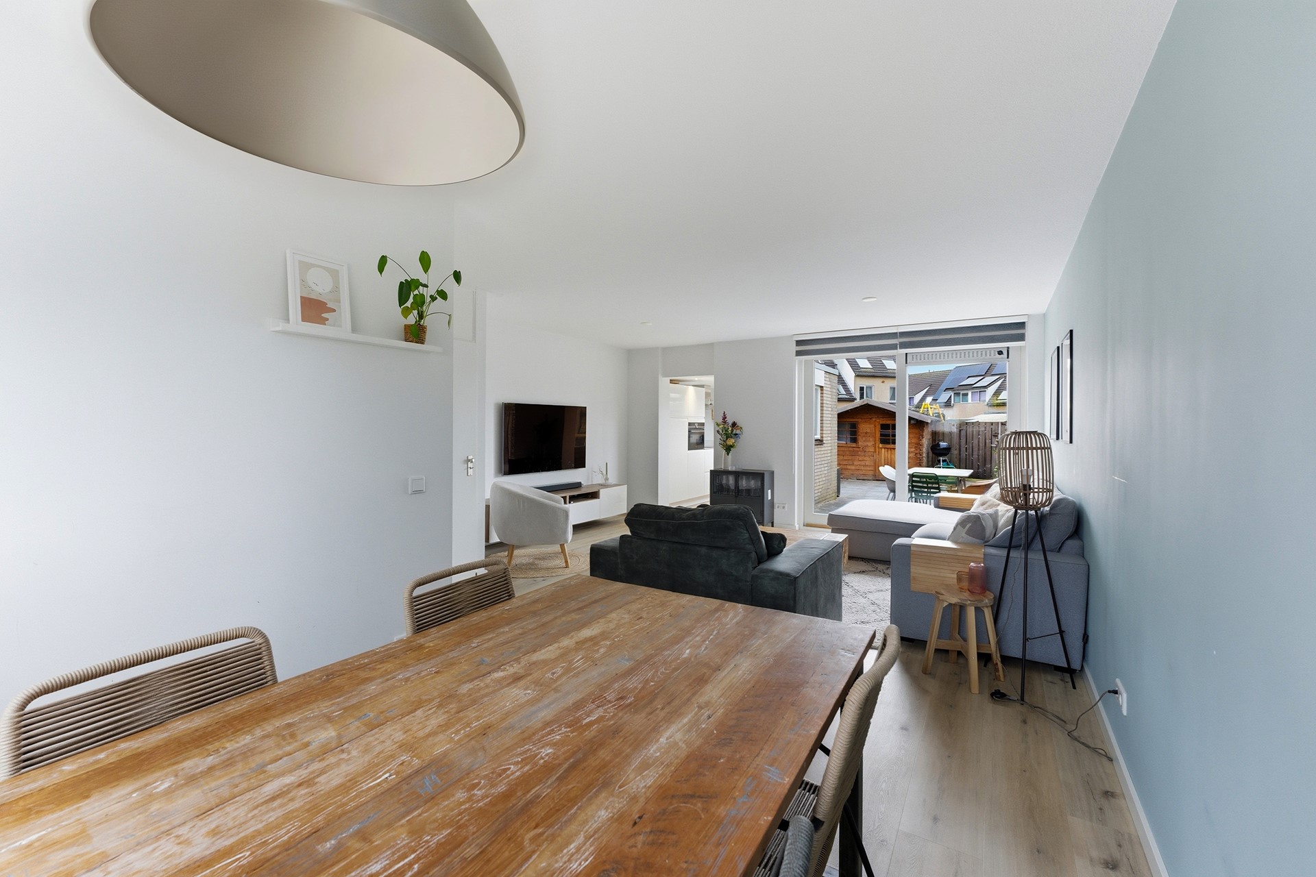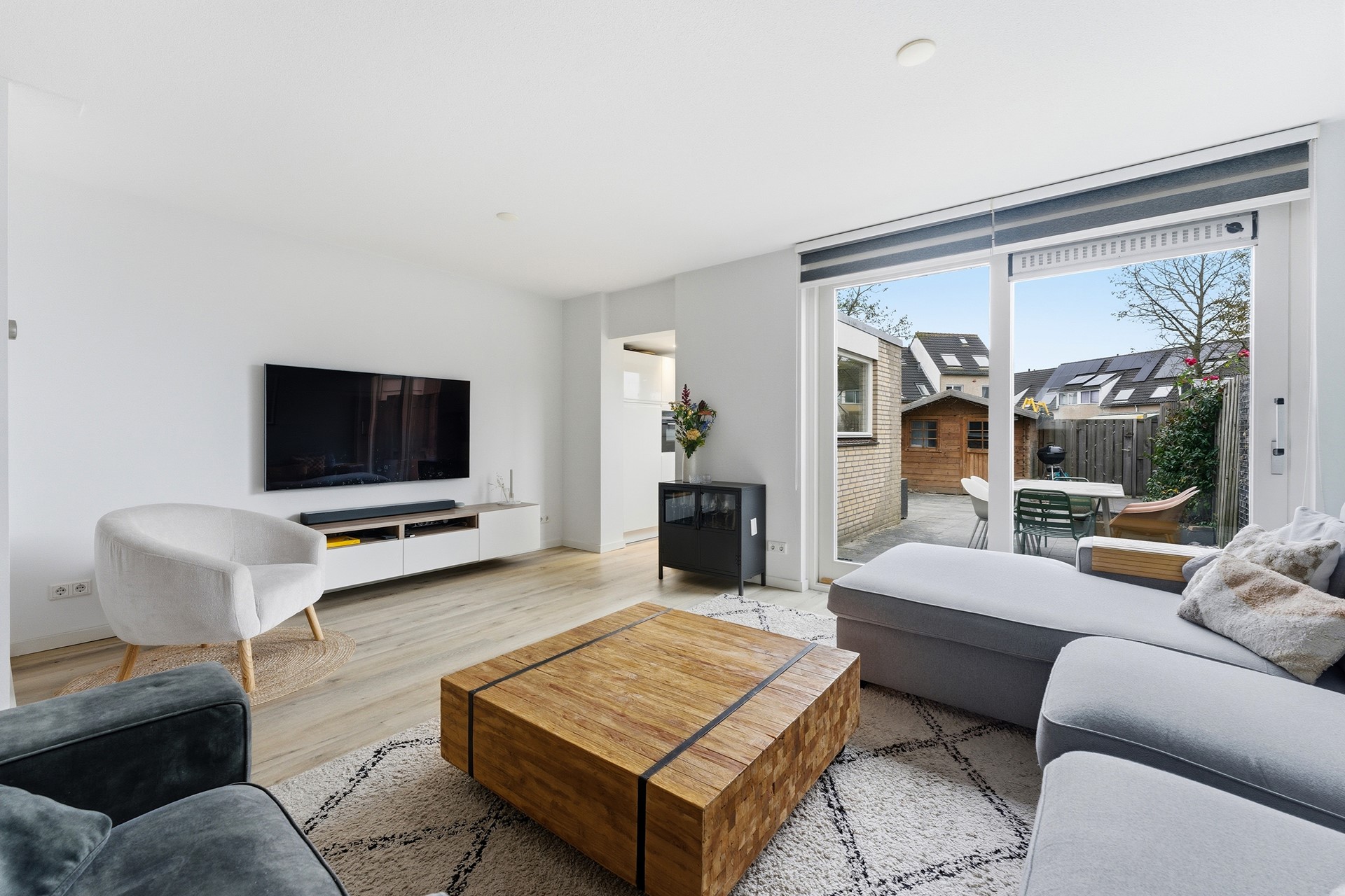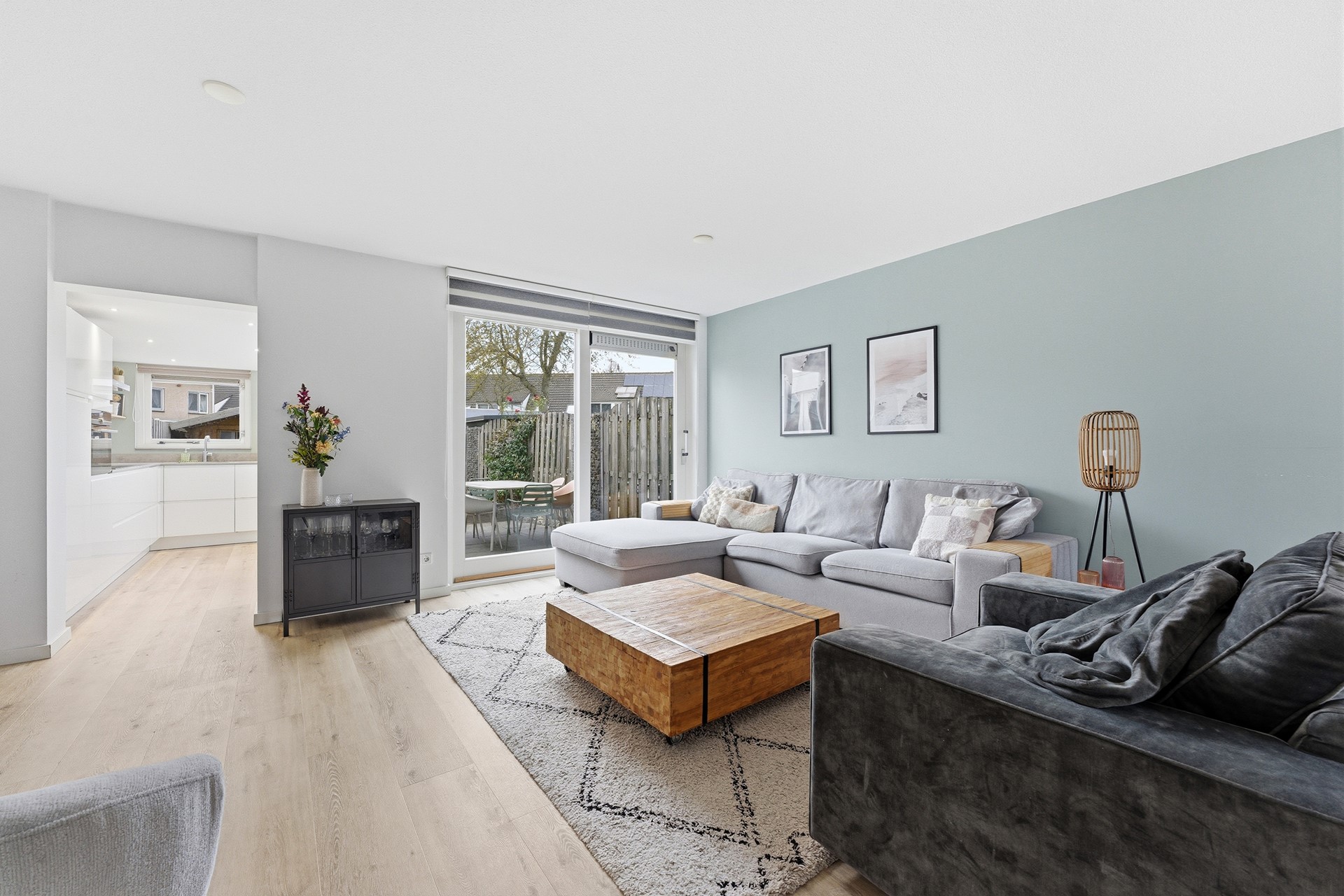 Woonkamer: De woonkamer is ruim opgezet en biedt daardoor een open en lichte sfeer. Een grote schuifpui aan de achterzijde geeft direct toegang tot de achtertuin en zorgt voor veel natuurlijk licht. Vanuit deze ruimte kijk je door naar de aanbouw waar de keuken is geplaatst. De begane grond is voorzien van vloerverwarming wat het extra comfortabel maakt. Daarnaast is er een praktische trapkast aanwezig die zorgt voor voldoende opbergruimte, waardoor alles netjes en georganiseerd kan blijven. De woonkamer is volledig afgewerkt met een PVC-vloer, gestuukte wanden en een gestuukt plafond.