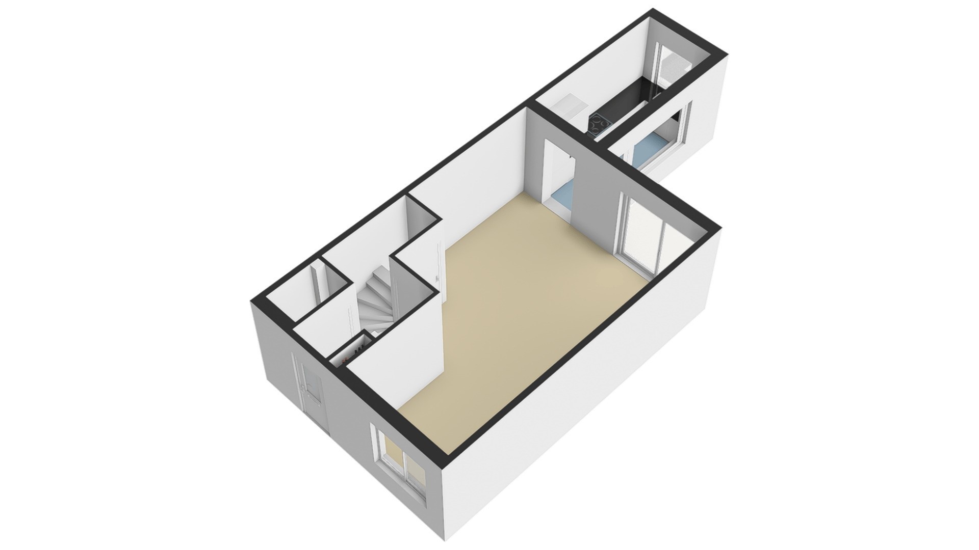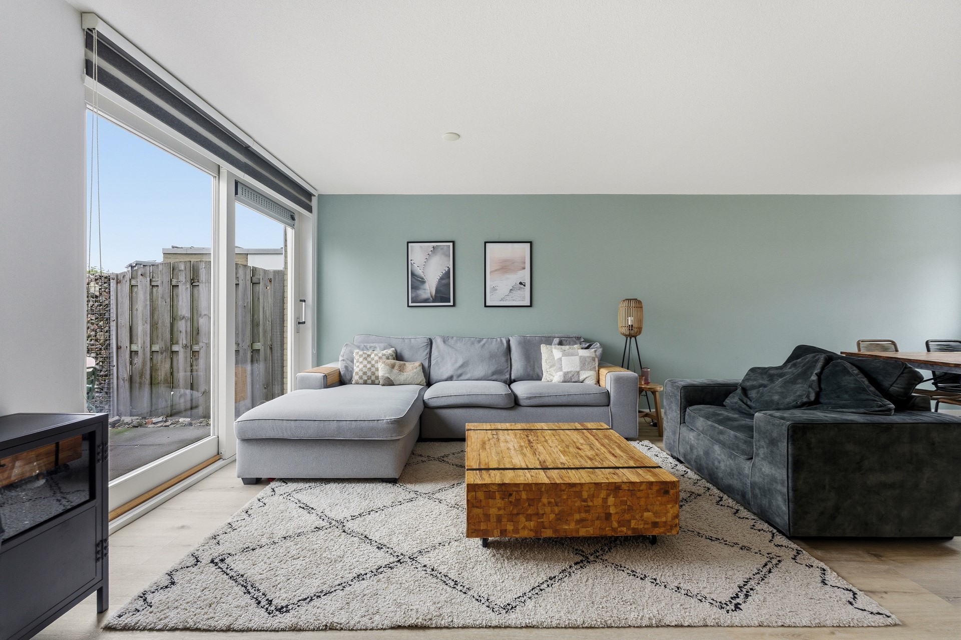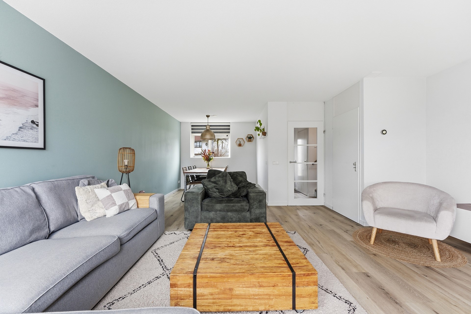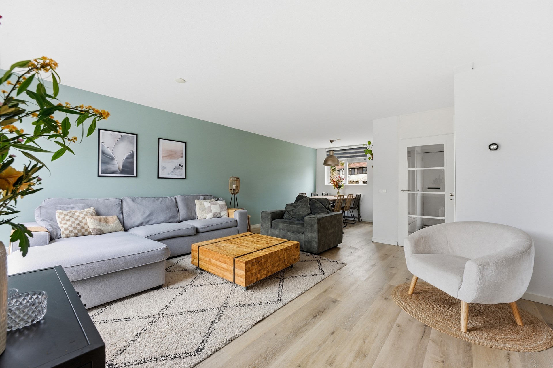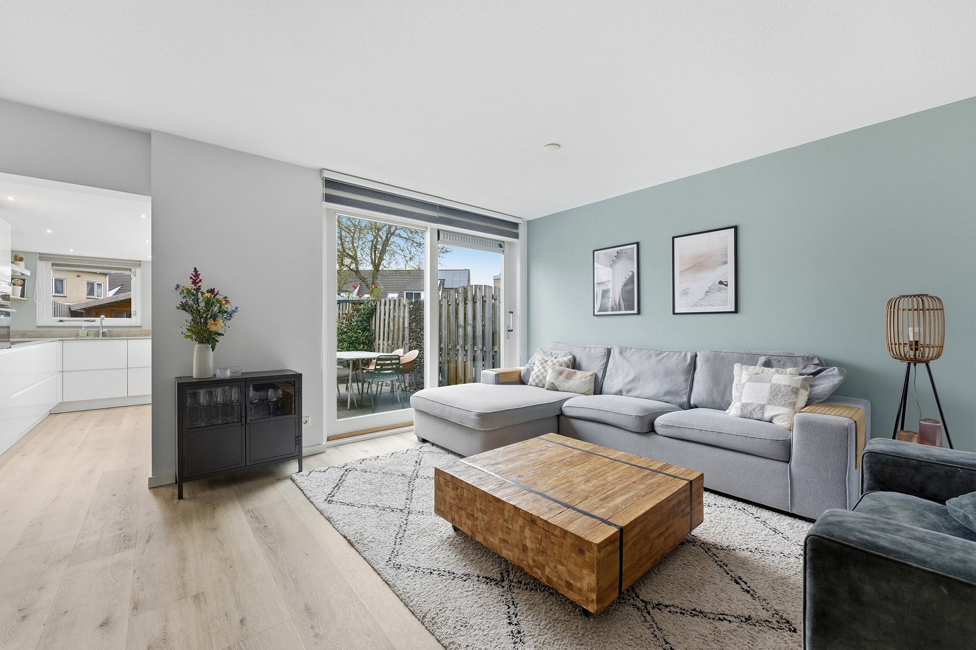 Woonkamer: De woonkamer is ruim opgezet en biedt daardoor een open en lichte sfeer. Een grote schuifpui aan de achterzijde geeft direct toegang tot de achtertuin en zorgt voor veel natuurlijk licht. Vanuit deze ruimte kijk je door naar de aanbouw waar de keuken is geplaatst. De begane grond is voorzien van vloerverwarming wat het extra comfortabel maakt. Daarnaast is er een praktische trapkast aanwezig die zorgt voor voldoende opbergruimte, waardoor alles netjes en georganiseerd kan blijven. De woonkamer is volledig afgewerkt met een PVC-vloer, gestuukte wanden en een gestuukt plafond.