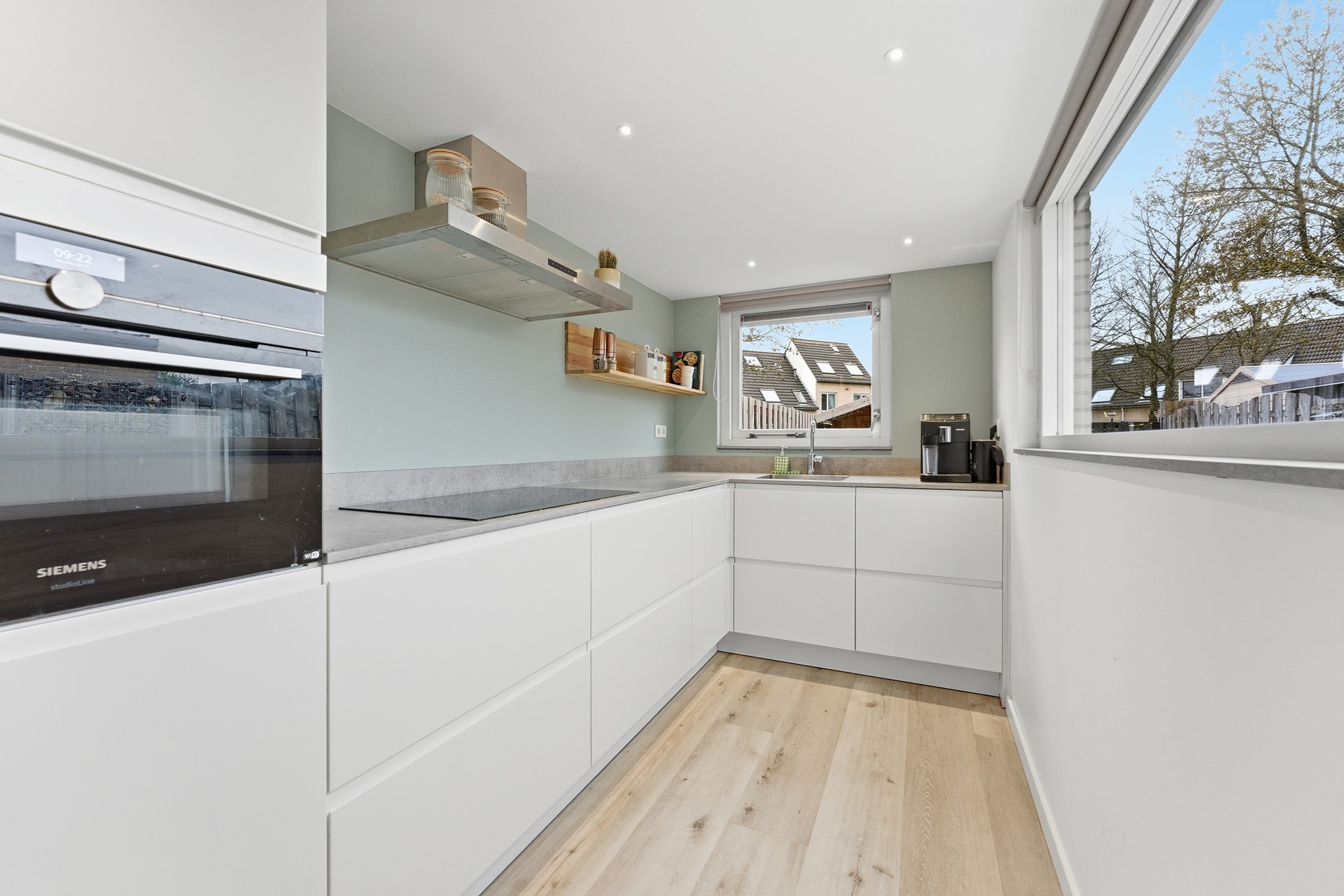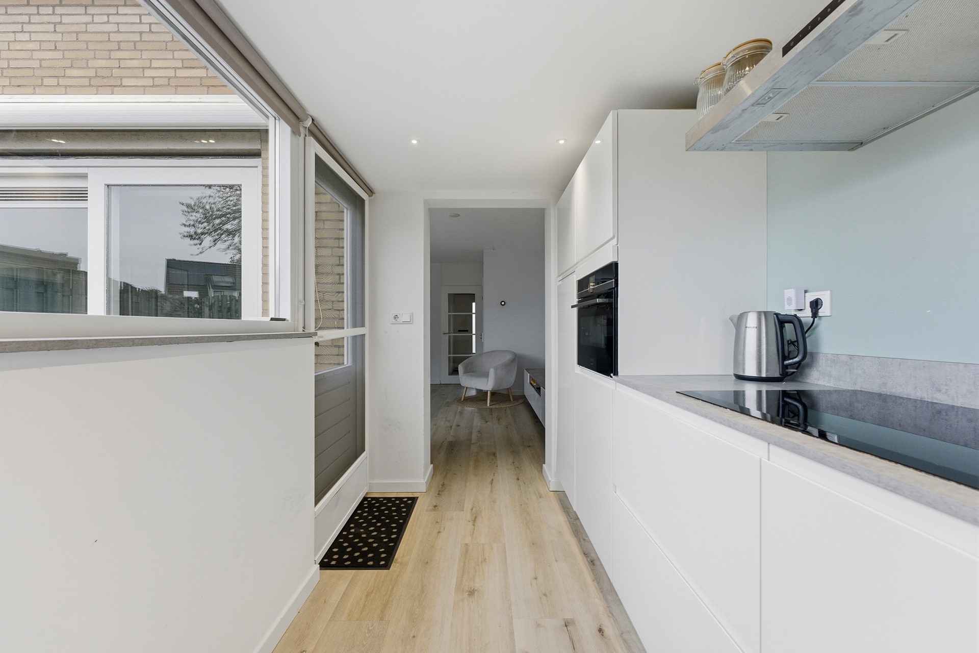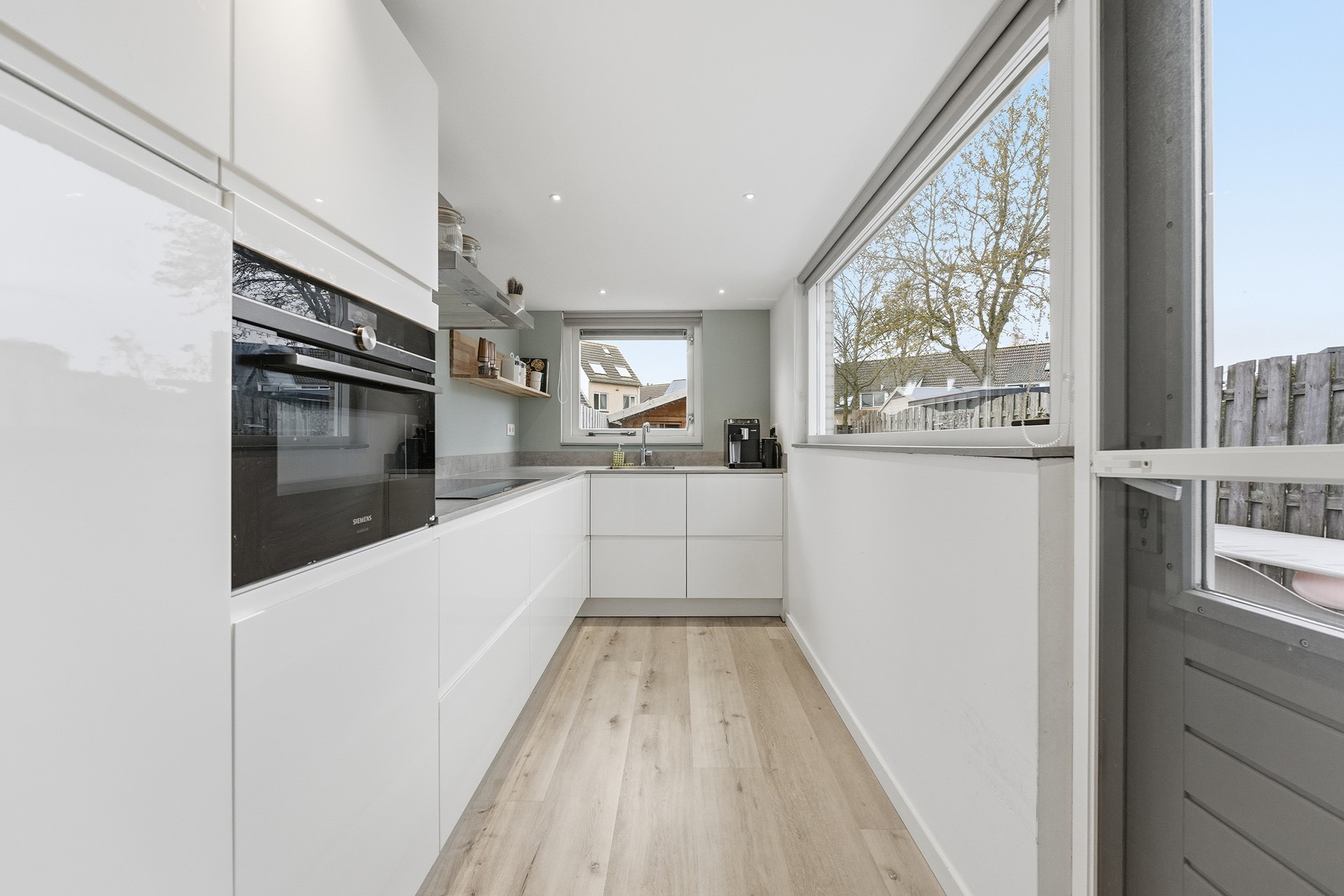 Keuken: De open keuken bevindt zich in de aanbouw en heeft twee grote ramen waardoor er veel licht binnenkomt. De keuken is ingericht met een praktische hoekopstelling en is uitgerust met diverse A-merk inbouwapparatuur, zoals een combi-oven, inductiekookplaat, afzuigkap, vriezer, koelkast en vaatwasser. Via een deur is er directe toegang tot de achtertuin, wat een handige en praktische verbinding tussen binnen en buiten biedt. De afwerking sluit aan op de woonkamer en heeft een verlaagd plafond in de aanbouw.