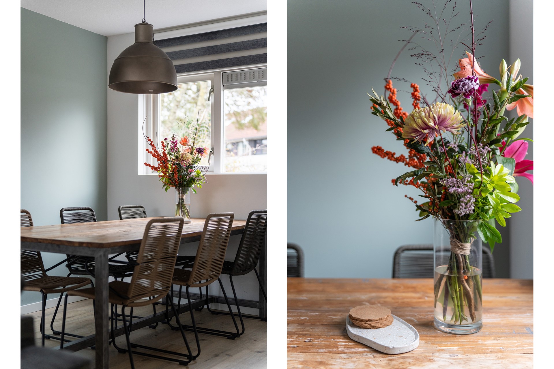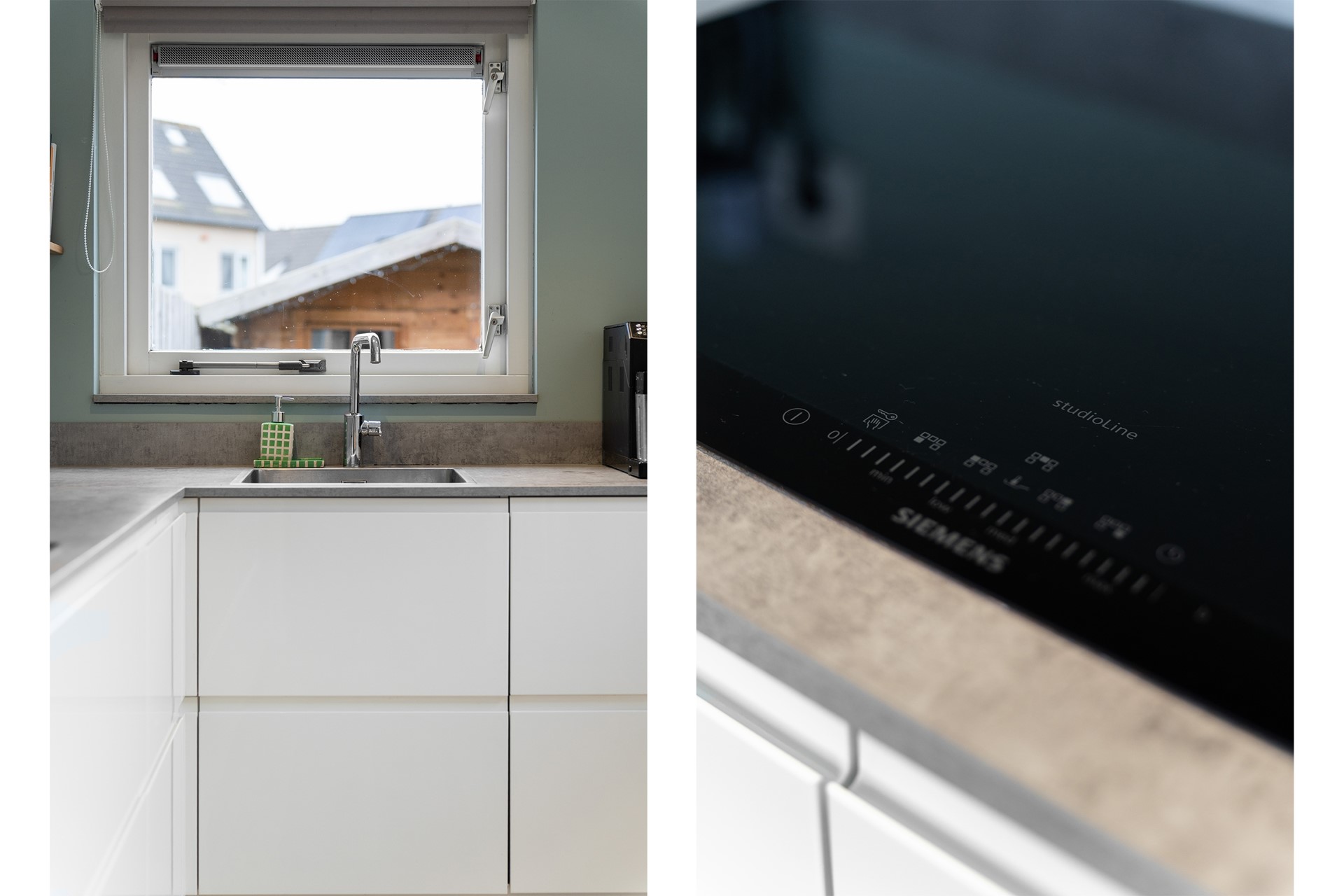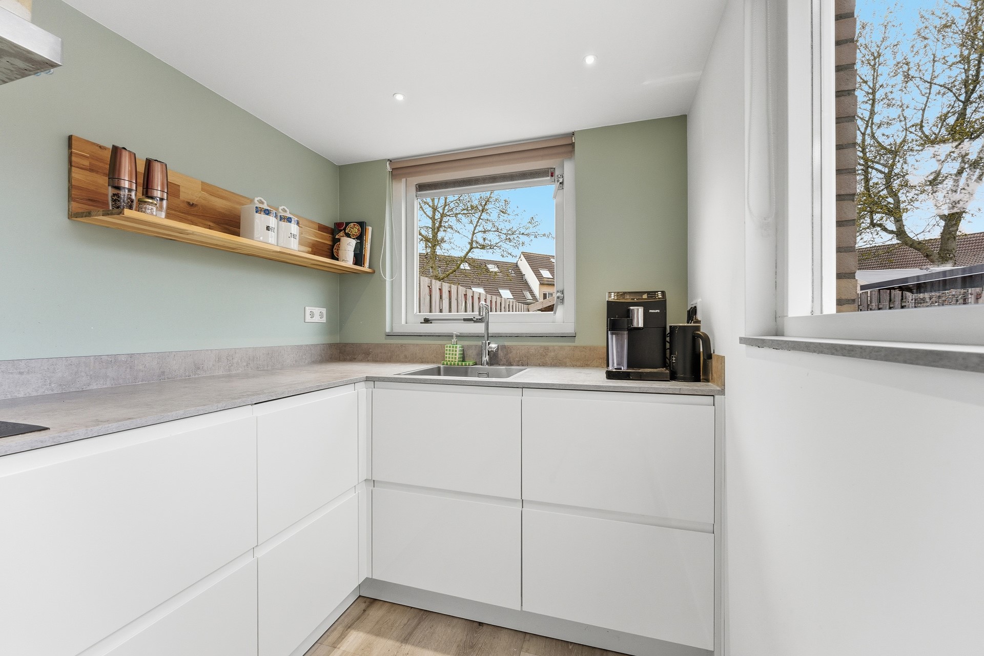 Keuken: De open keuken bevindt zich in de aanbouw en heeft twee grote ramen waardoor er veel licht binnenkomt. De keuken is ingericht met een praktische hoekopstelling en is uitgerust met diverse A-merk inbouwapparatuur, zoals een combi-oven, inductiekookplaat, afzuigkap, vriezer, koelkast en vaatwasser. Via een deur is er directe toegang tot de achtertuin, wat een handige en praktische verbinding tussen binnen en buiten biedt. De afwerking sluit aan op de woonkamer en heeft een verlaagd plafond in de aanbouw.
