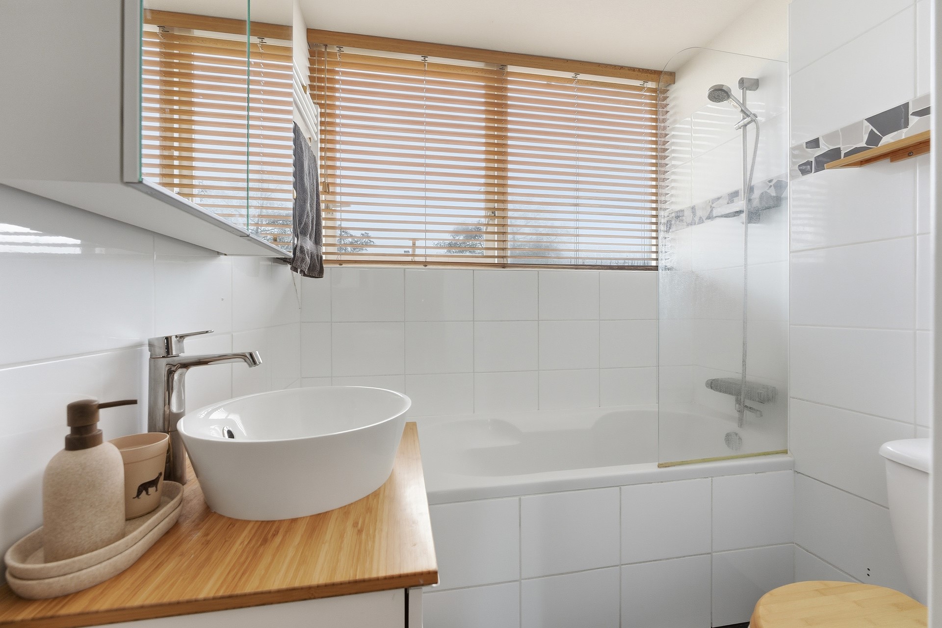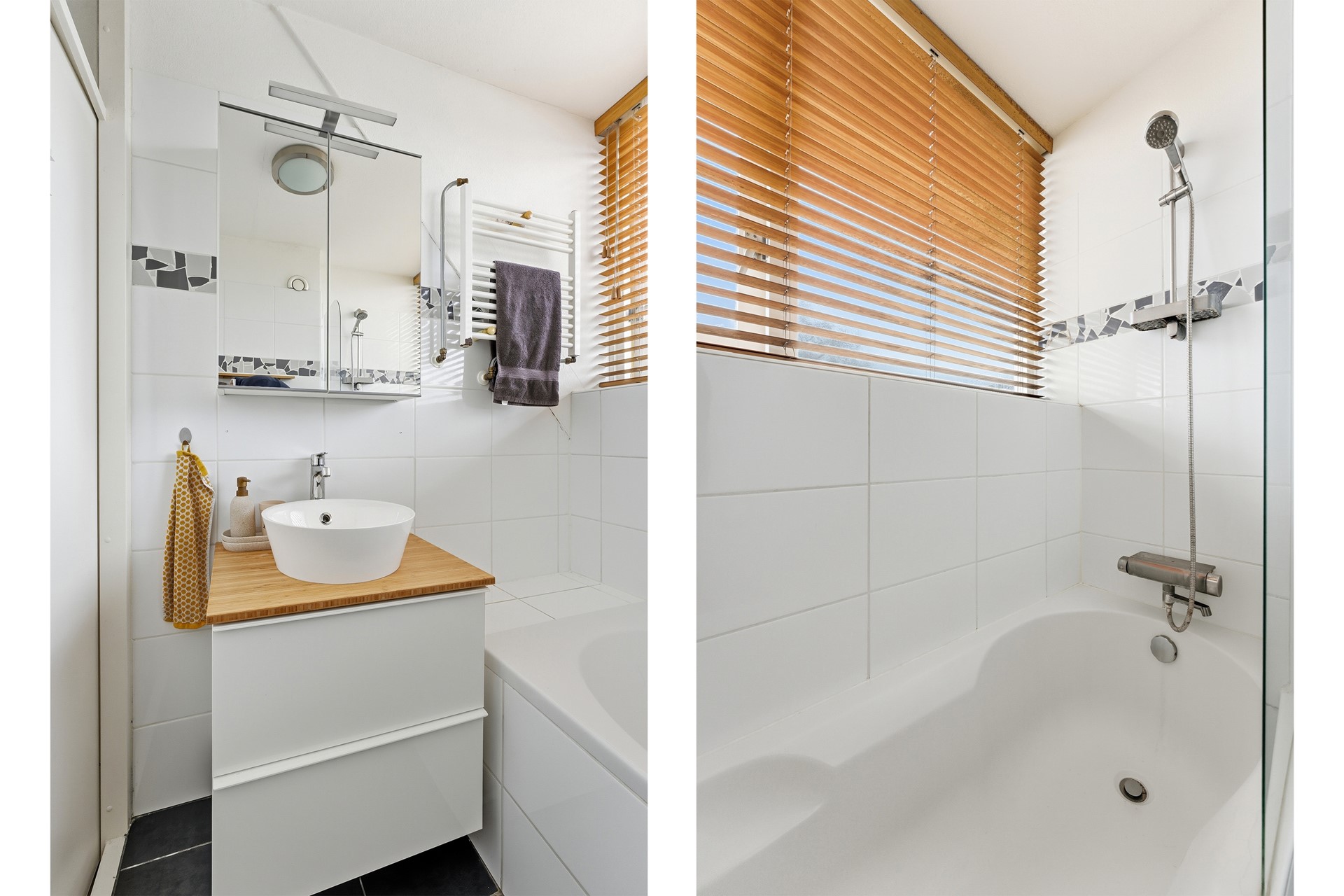 Badkamer: De badkamer is ingericht met een ligbad met douchegelegenheid, wastafel, toilet en designradiator. De ruimte beschikt over mechanische ventilatie en heeft enkel glas in het kozijn. De afwerking is deels betegeld en wellicht wil je hier nog een aantal zaken verbeteren.
