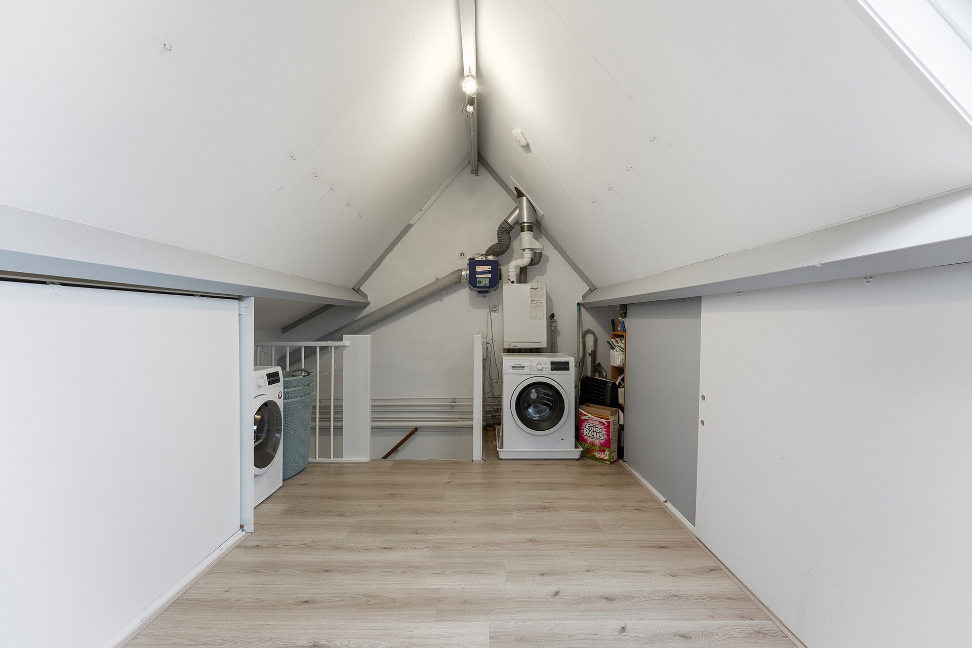 Slaapkamer 4/zolder: De zolderverdieping bestaat uit één grote, open ruimte die door zijn hoogte een ruimtelijk gevoel geeft. Aan de achterzijde bevindt zich de opstelplaats voor de wasmachine, droger en Cv-ketel. Achter schotten is extra opbergruimte aanwezig, ideaal voor het netjes opbergen van spullen die je niet dagelijks gebruikt. Deze verdieping biedt veel flexibiliteit en verschillende gebruiksmogelijkheden, waardoor het eenvoudig is om de ruimte aan te passen aan je eigen wensen. Zo kan hier zonder problemen een comfortabele slaapkamer worden gecreëerd, of bijvoorbeeld een ruime werk- of hobbyruimte. De afwerking bestaat uit laminaat, gestuukte wanden en een delen plafond.