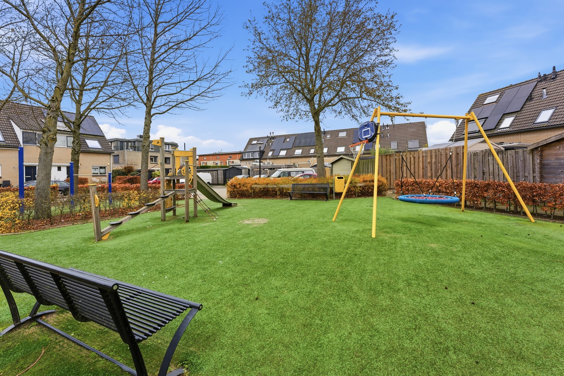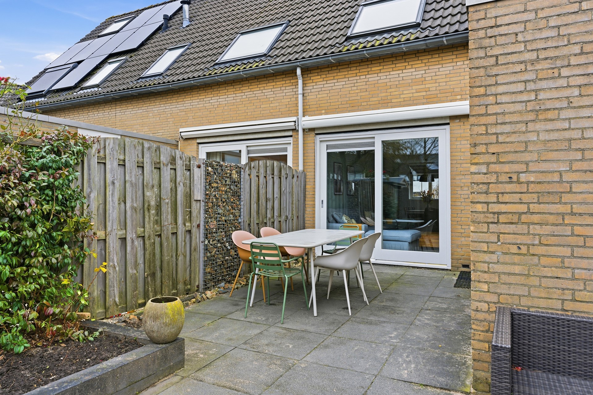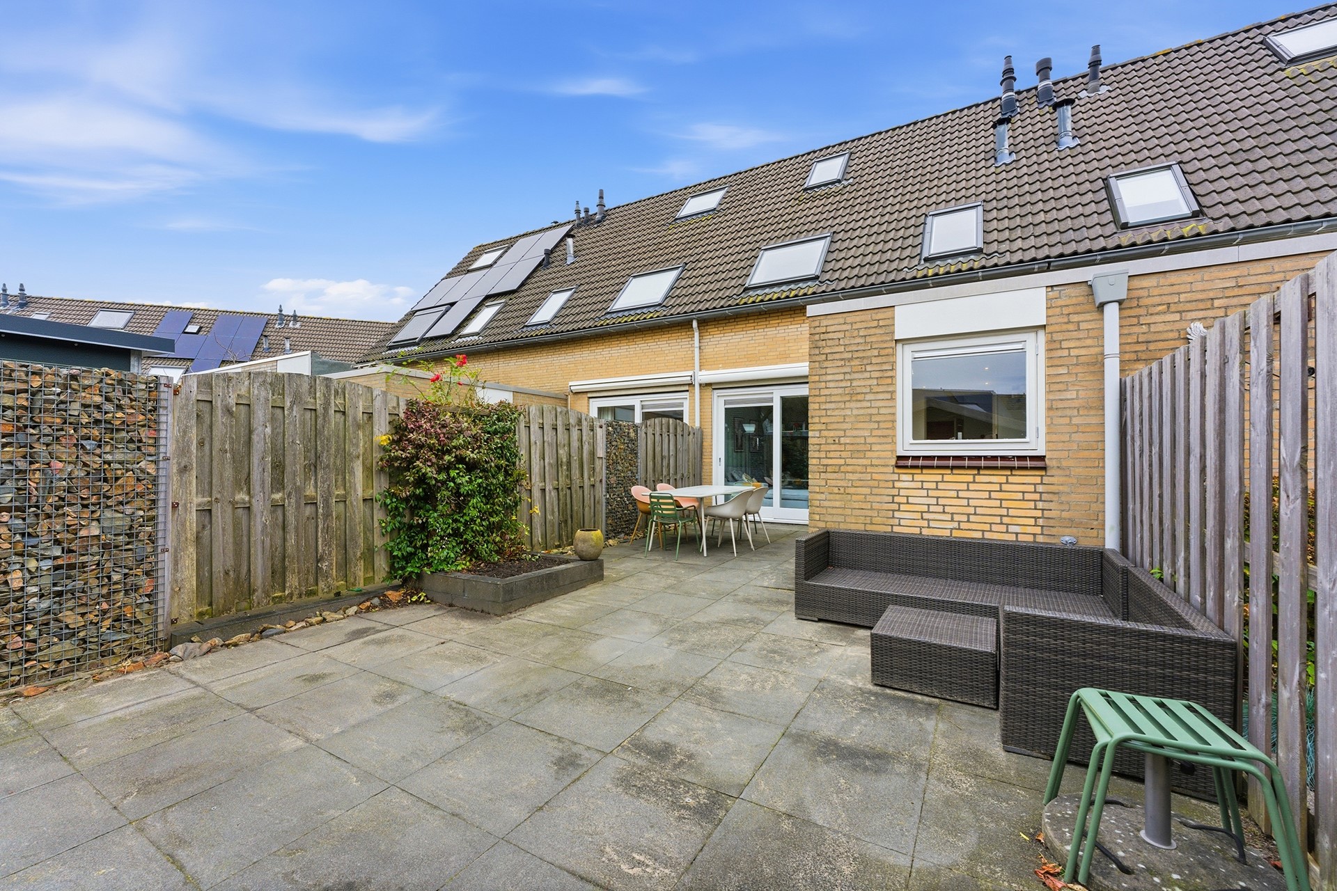 Achtertuin: De achtertuin (afm. ca. 12.60 x 5.20) ligt op het westen en heeft een ruime diepte. De tuin is ingericht met borders en voorzieningen zoals een elektrisch zonnescherm, elektra en water. De tuin is onderhoudsvriendelijk afgewerkt en achterom te bereiken. De tuin grenst aan een speeltuintje wat zorgt voor een prettige ligging voor gezinnen.