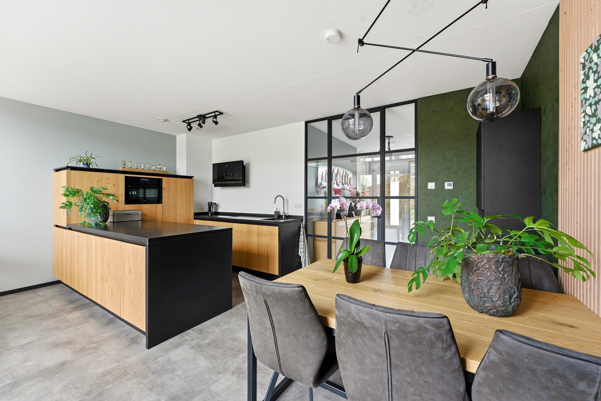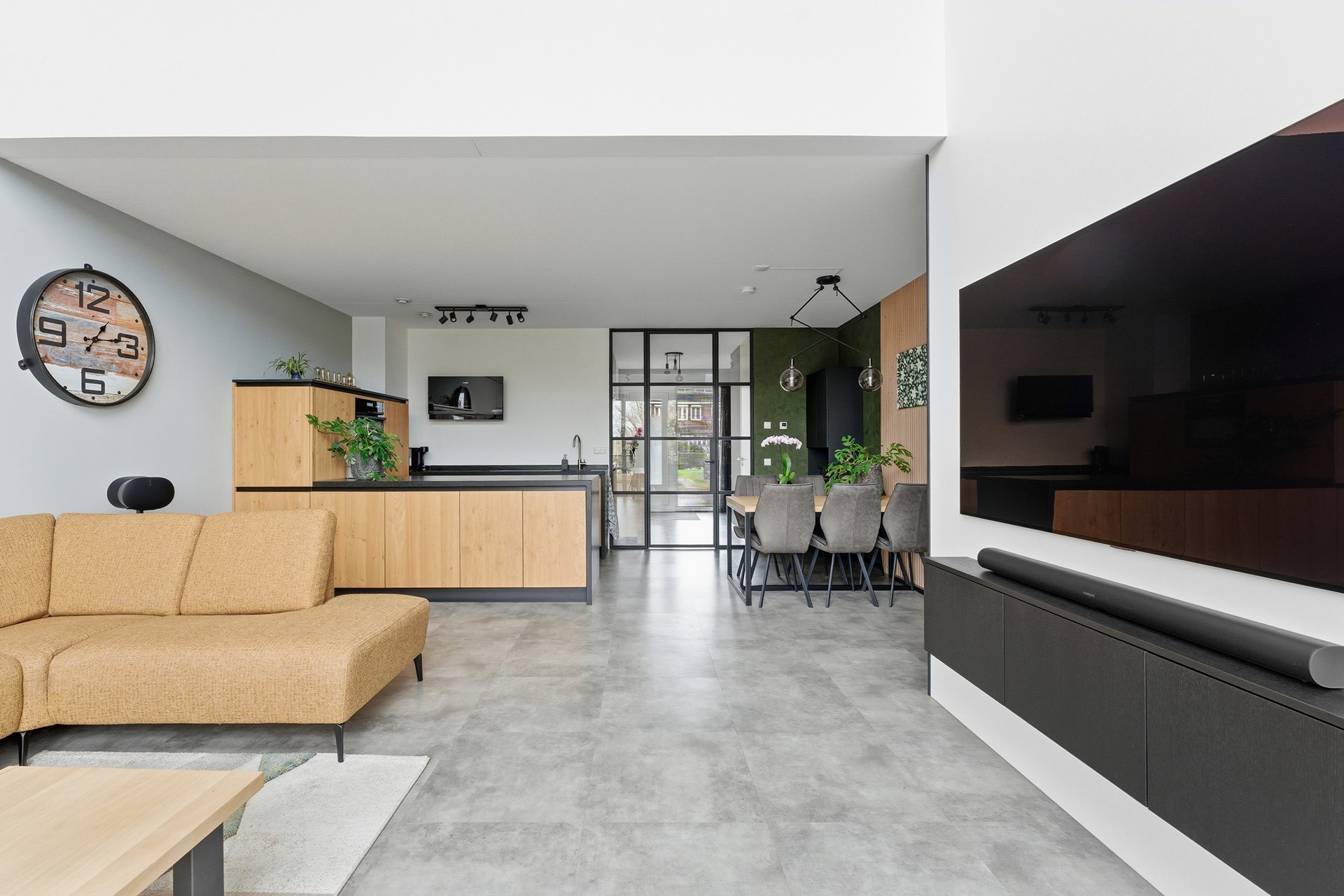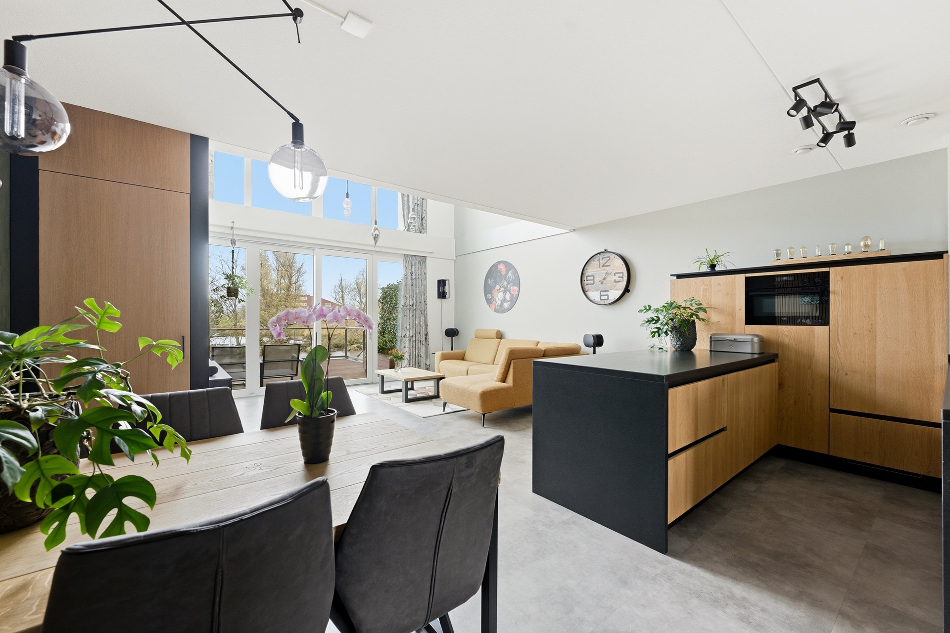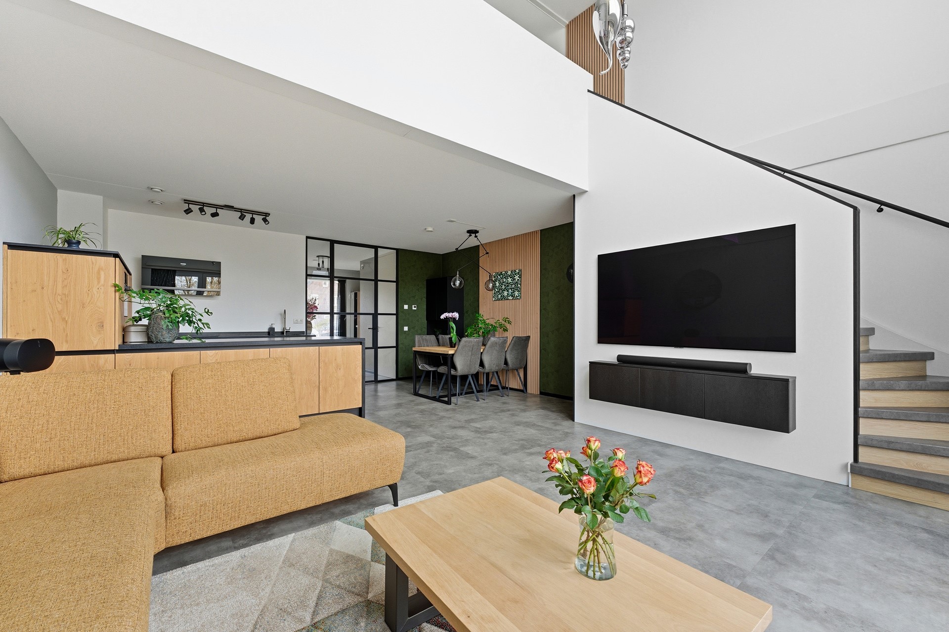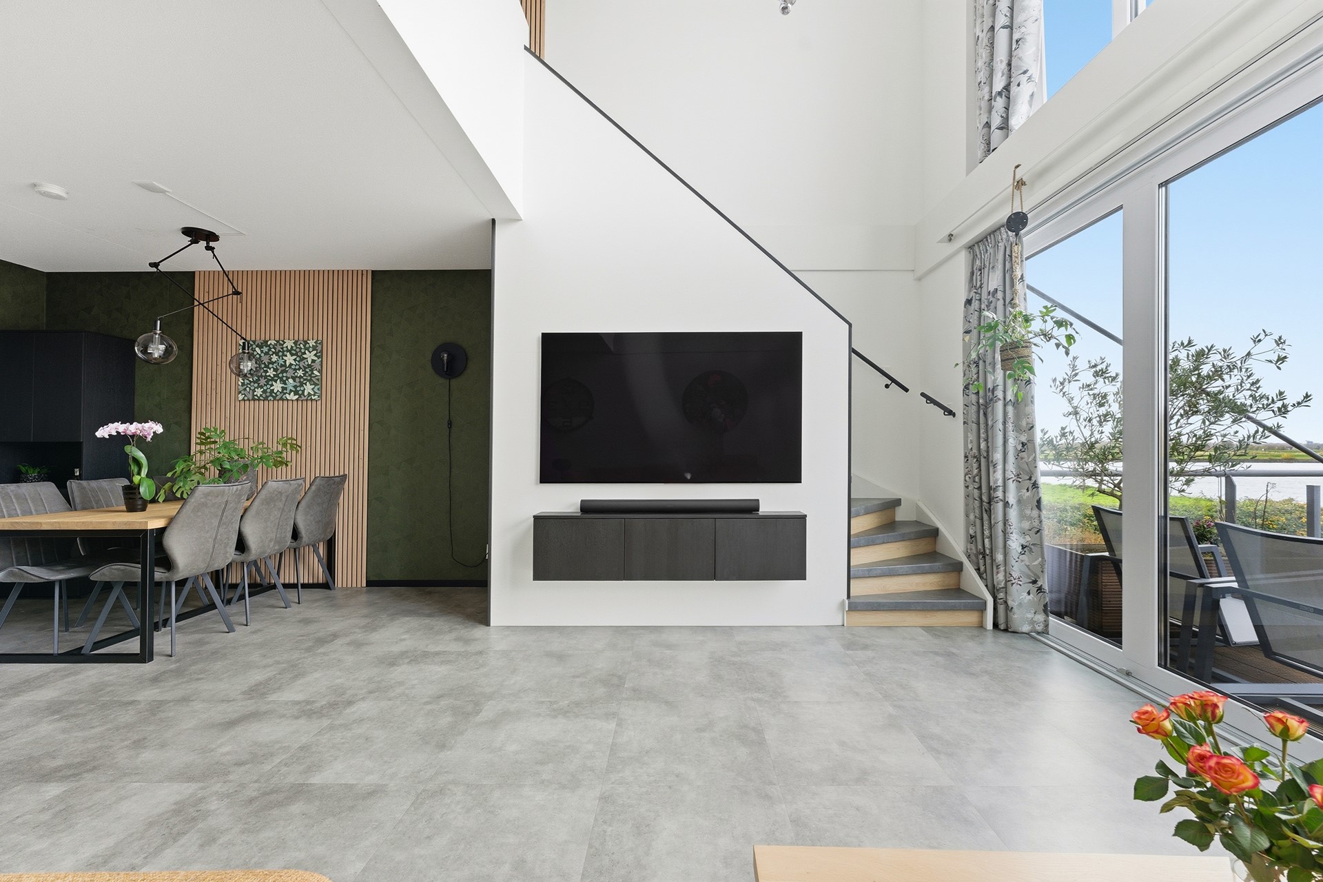 Woonkamer: De woonkamer is een echte blikvanger met een hoog plafond, grote glazen pui (triple glas) en schuifpui naar het terras. Dankzij het vele licht en de vloerverwarming en -koeling is dit een heerlijke leefruimte. Er is voldoende plek voor een royale zithoek aan de achterzijde en een eetgedeelte dicht bij de keuken. In de trapkast is extra bergruimte voor al je spullen.