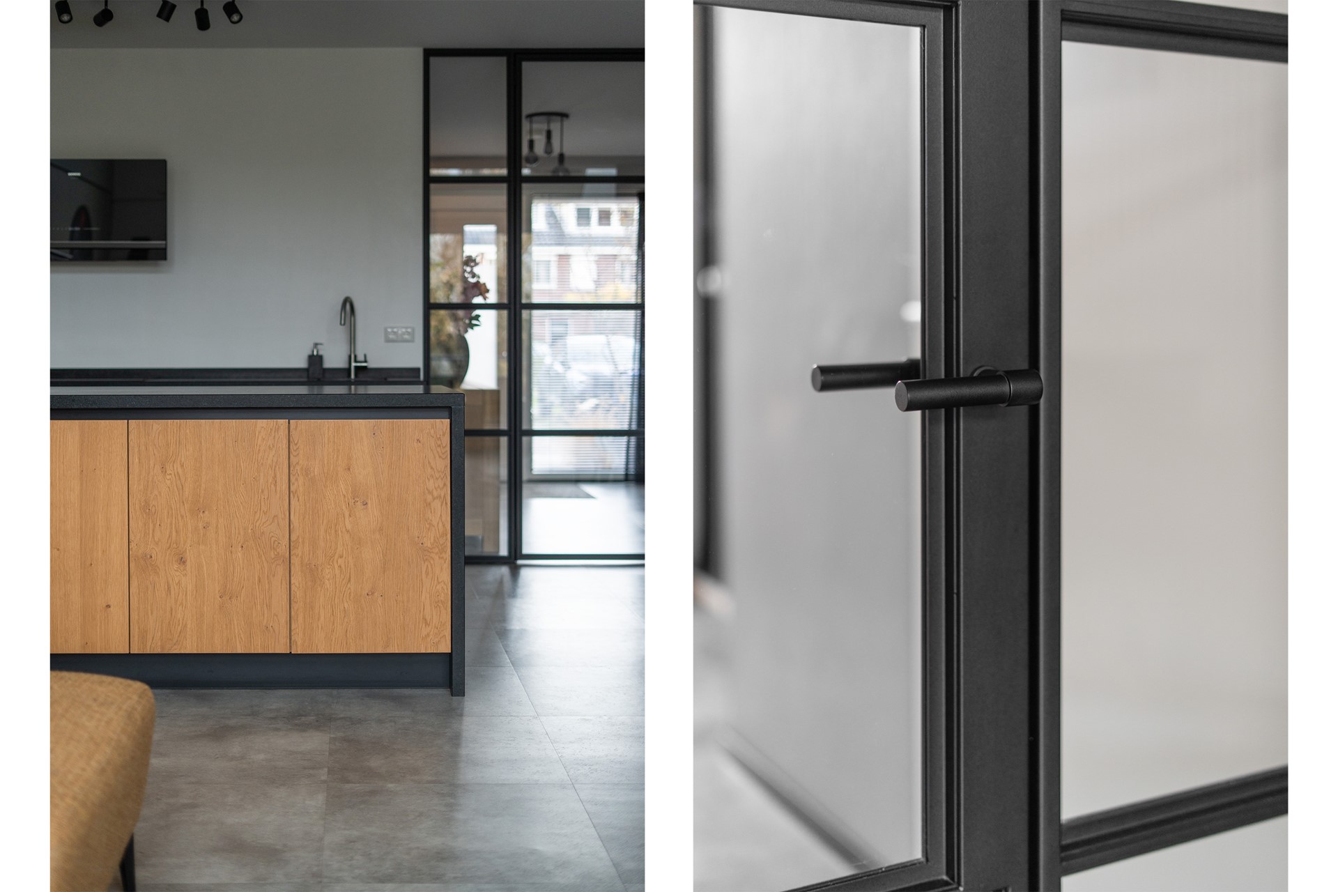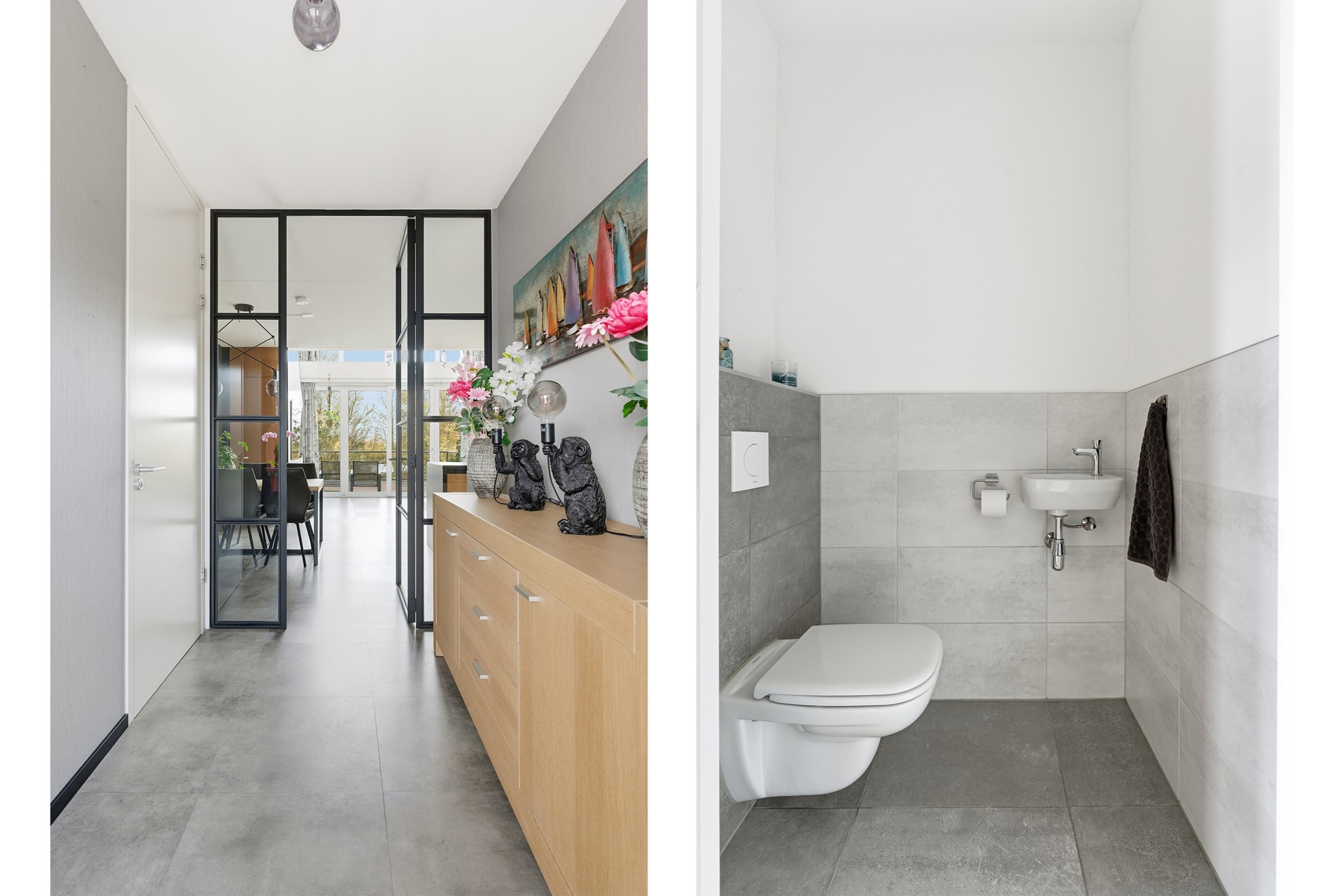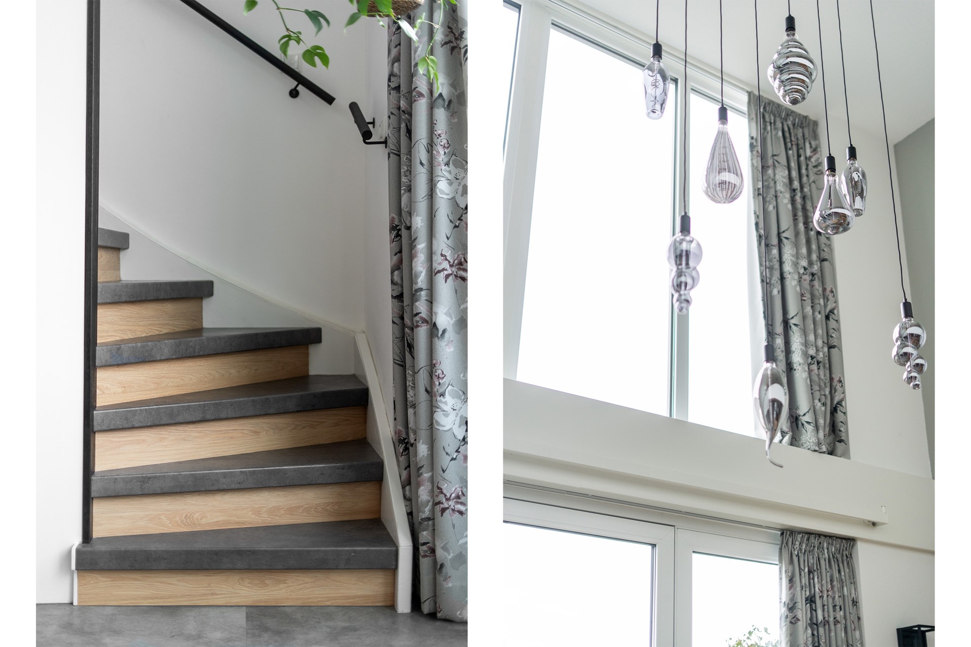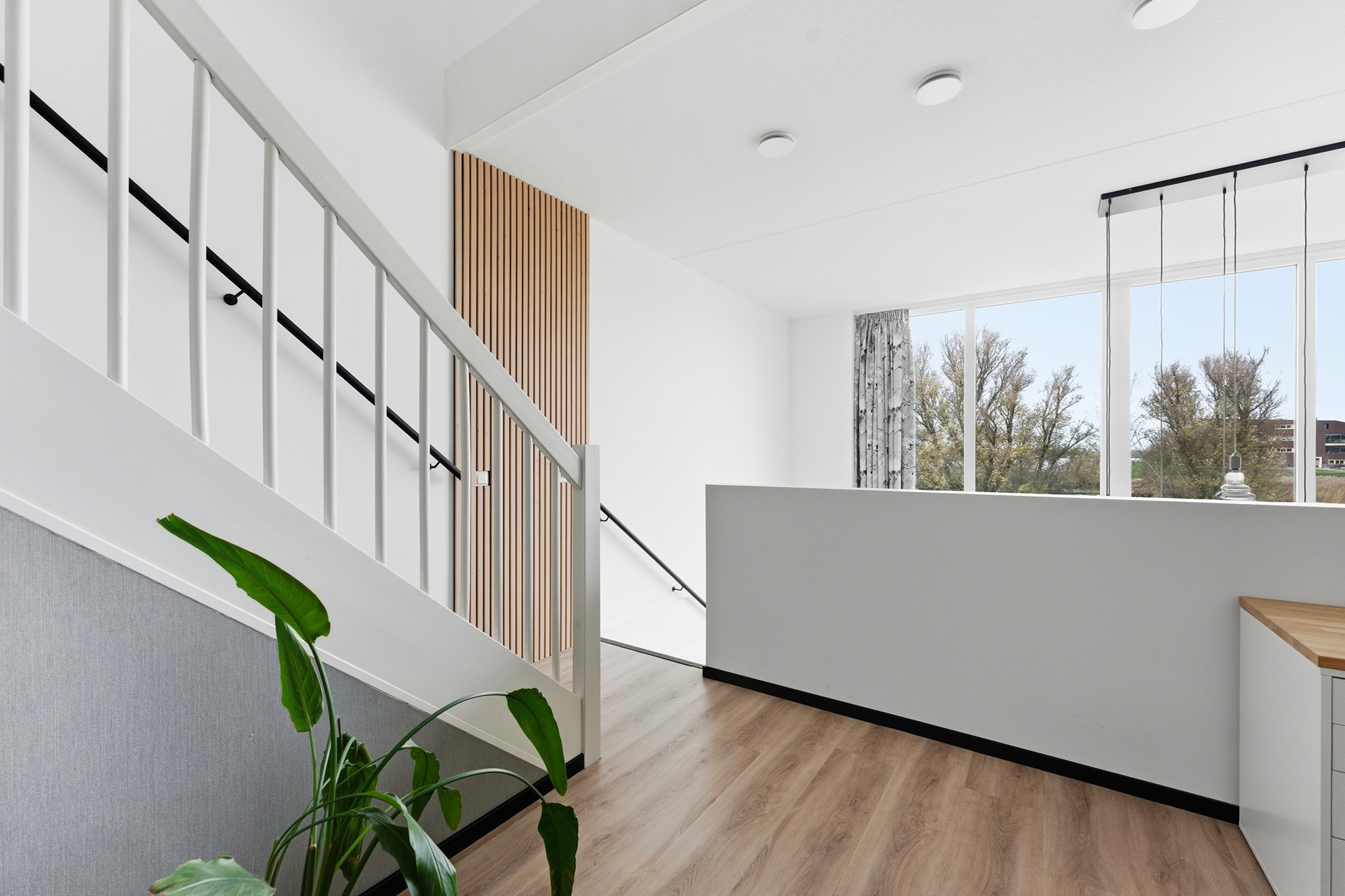 Entree: Je stapt binnen in een ruime, lichte hal met een strakke pvc-vloer die doorloopt naar de woonkamer en keuken. De hal voelt ruim door de hoge plafonds en de grote stalen deur naar de woonkamer geeft meteen een moderne, industriële uitstraling. Vanuit de hal heb je toegang tot de meterkast, de toiletruimte en de berging. Dankzij het grote raam in de hal valt er volop daglicht naar binnen. Beide trappen zijn voorzien van luxe trapbekleding. De ruimte is afgewerkt met behangwanden en een spuitwerk plafond.