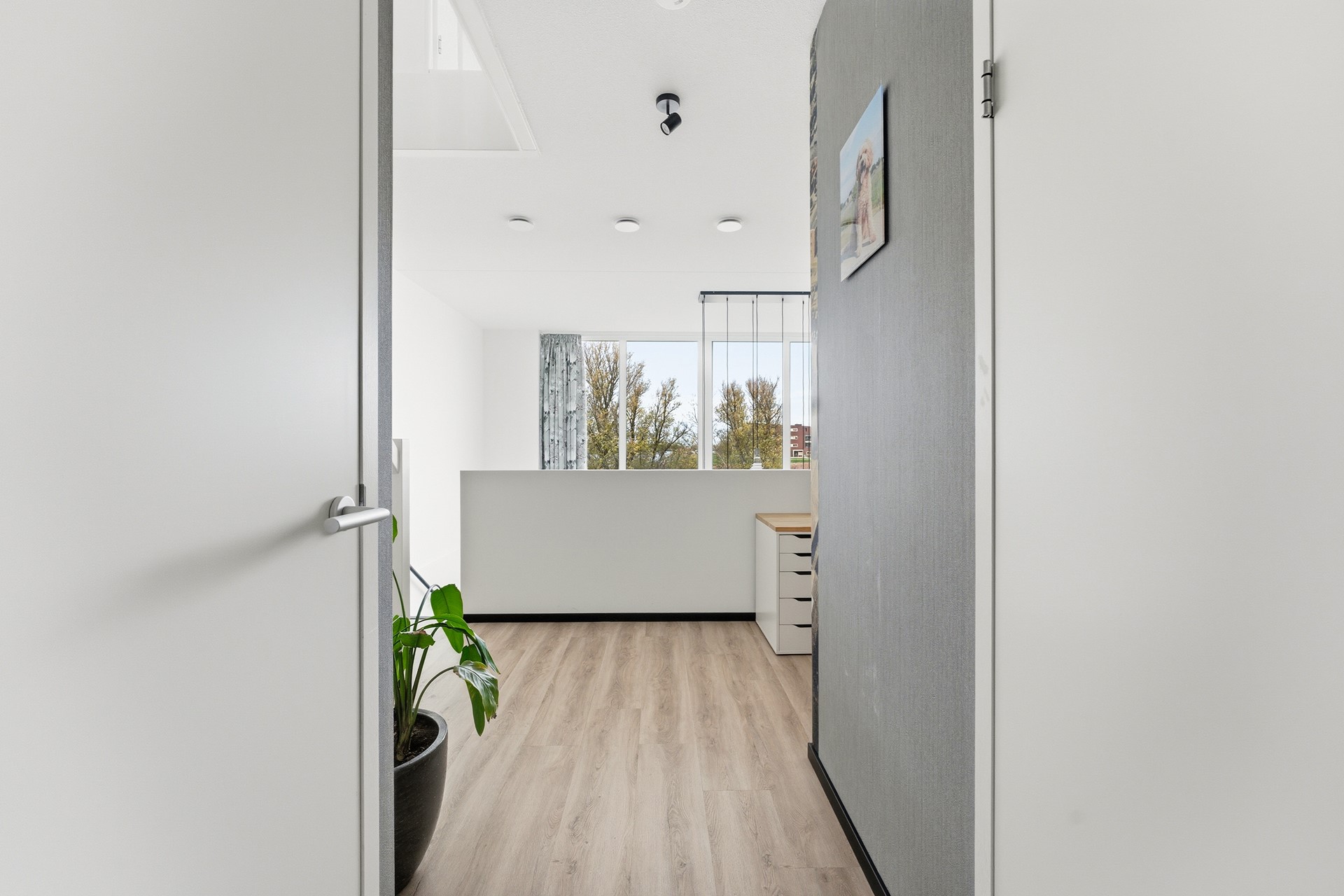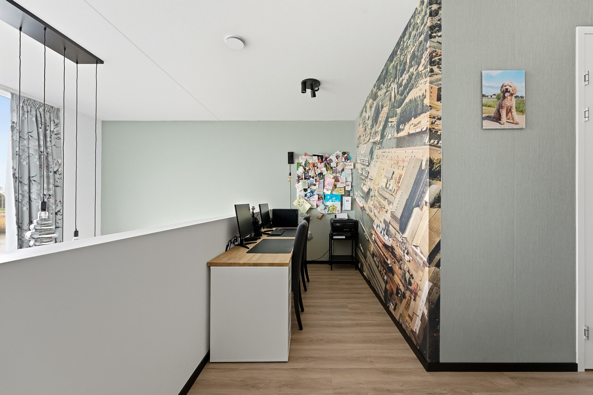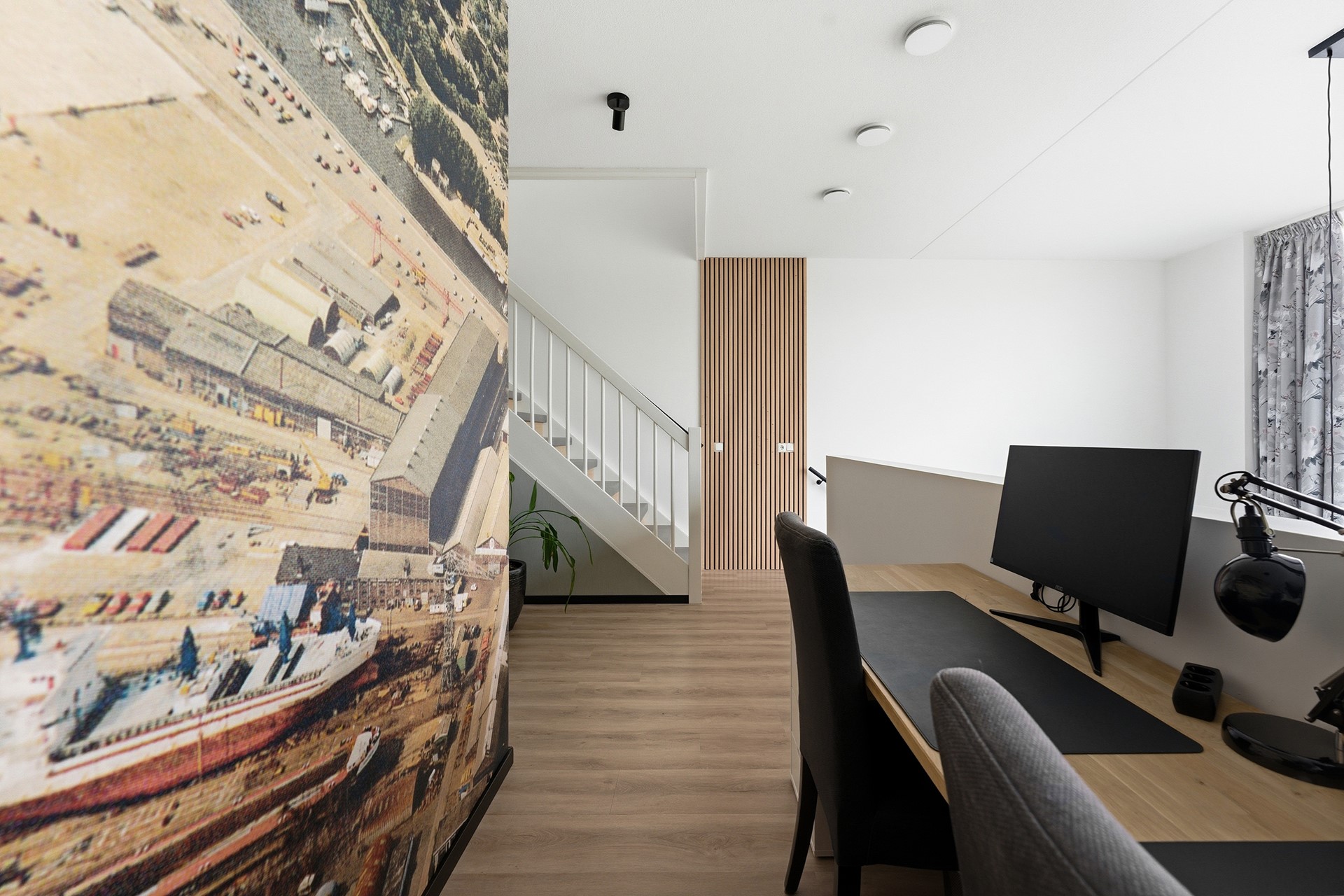 Overloop/ Vide: Via de trap kom je op de overloop met vide, een grote, lichte ruimte die direct uitkijkt over de woonkamer beneden. Hier is een royale werkplek gecreëerd met prachtig zicht op De Noord en de Crezéepolder. Hier is werken/studeren geen straf. De overloop geeft toegang tot de slaapkamer, de badkamer en een berging. De vloer is PVC, de wanden strak afgewerkt met behang en het plafond is spuitwerk.