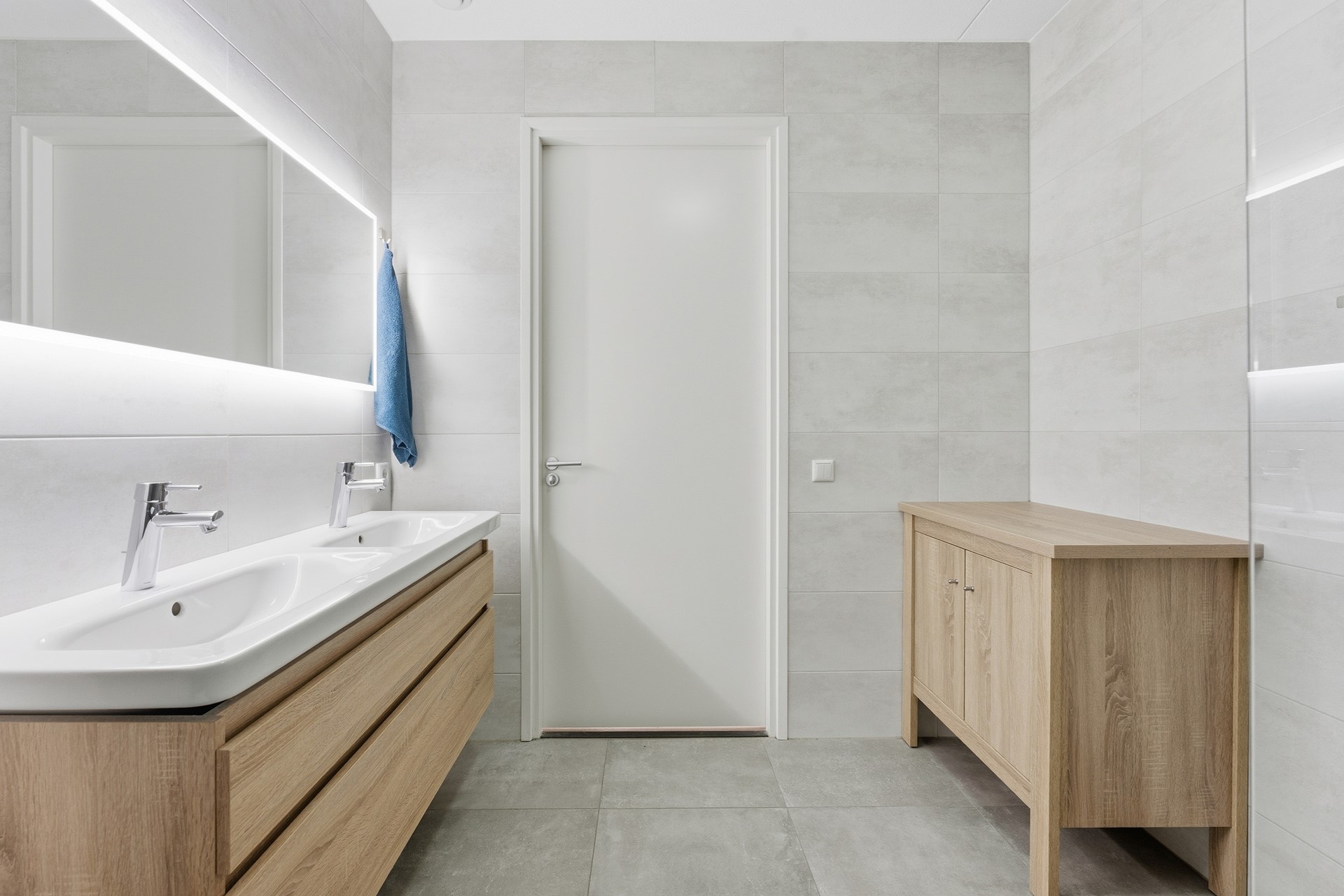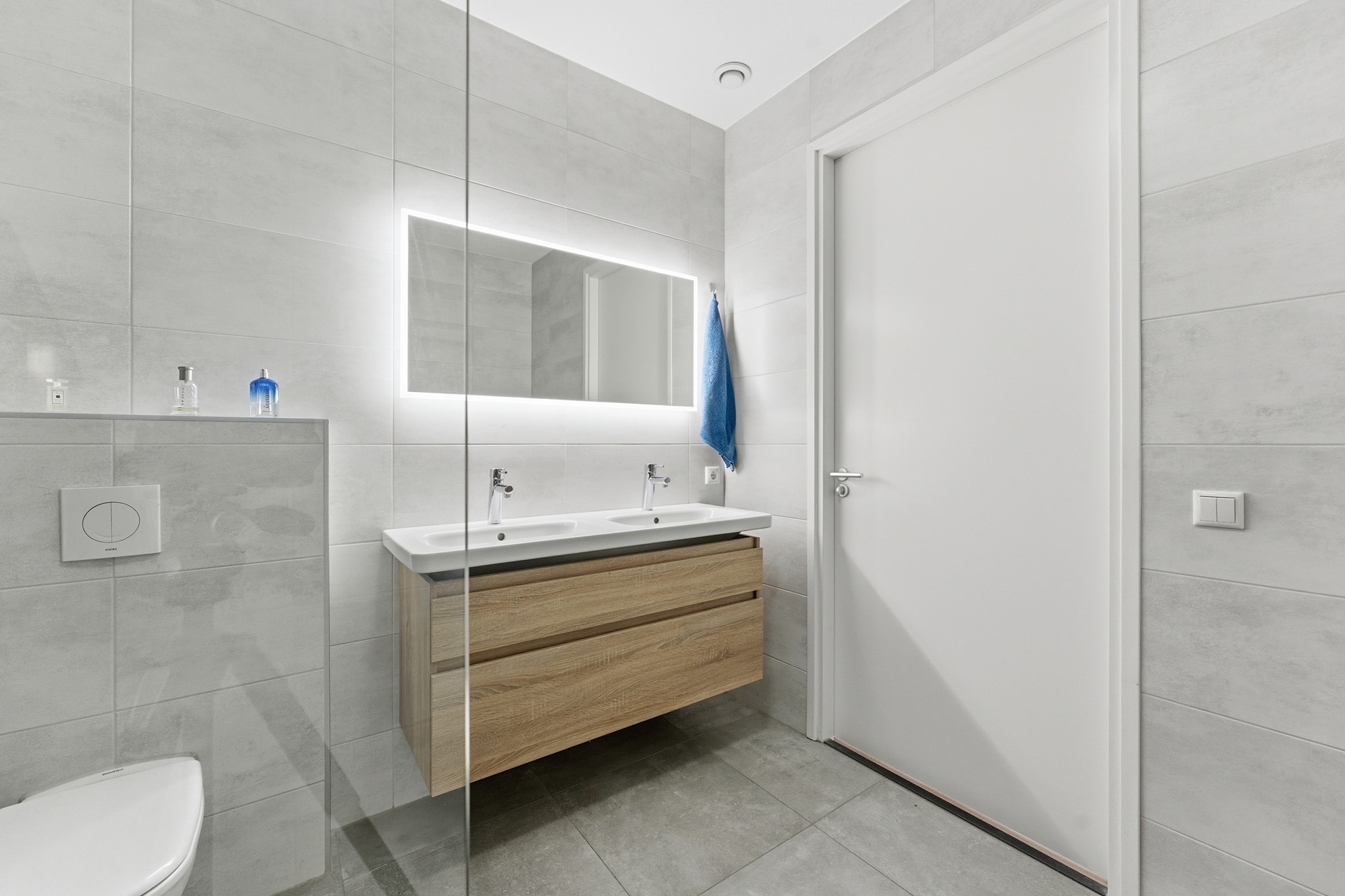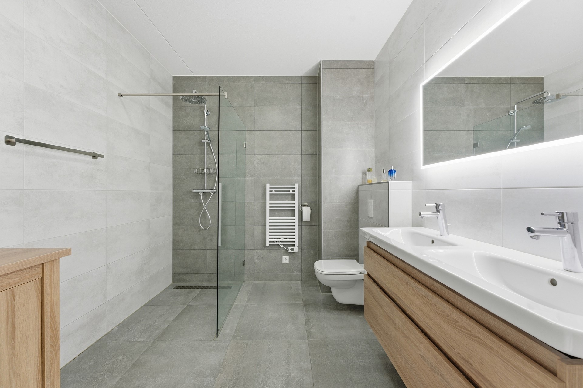Badkamer: De badkamer is ruim van formaat en beschikt over comfortabele vloerverwarming, dubbele wastafel, toilet, inloopdouche en mechanische ventilatie. De afwerking is keurig.