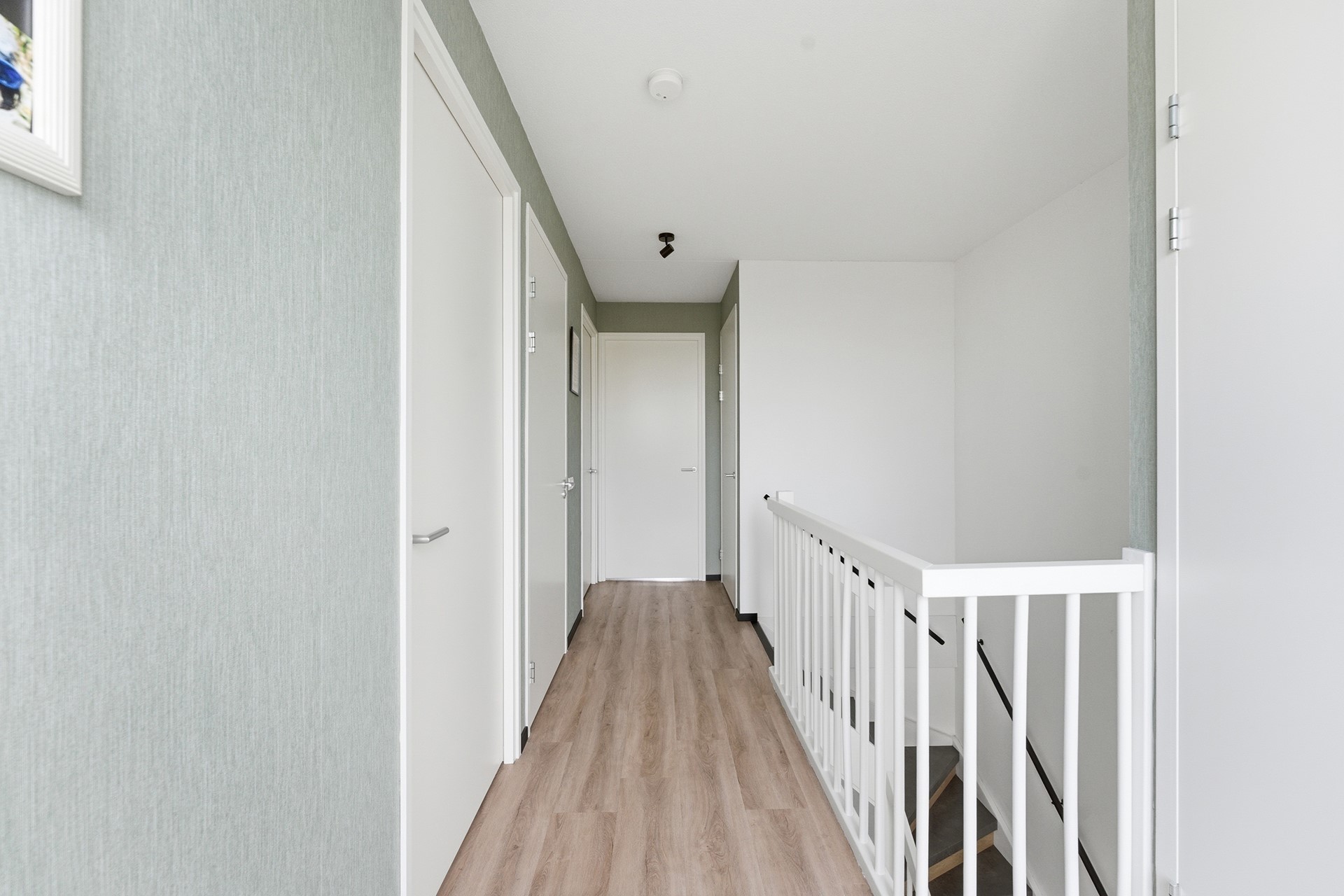 Overloop: Ruime overloop met toegang tot drie slaapkamers, een badkamer, twee bergingen en het dakterras. Eén kast is ingericht met aansluitingen voor de wasmachine en droger. In de andere kast is de mechanische ventilatie unit netjes weggewerkt. De vloer is PVC, wanden zijn behangen en het plafond is spuitwerk.