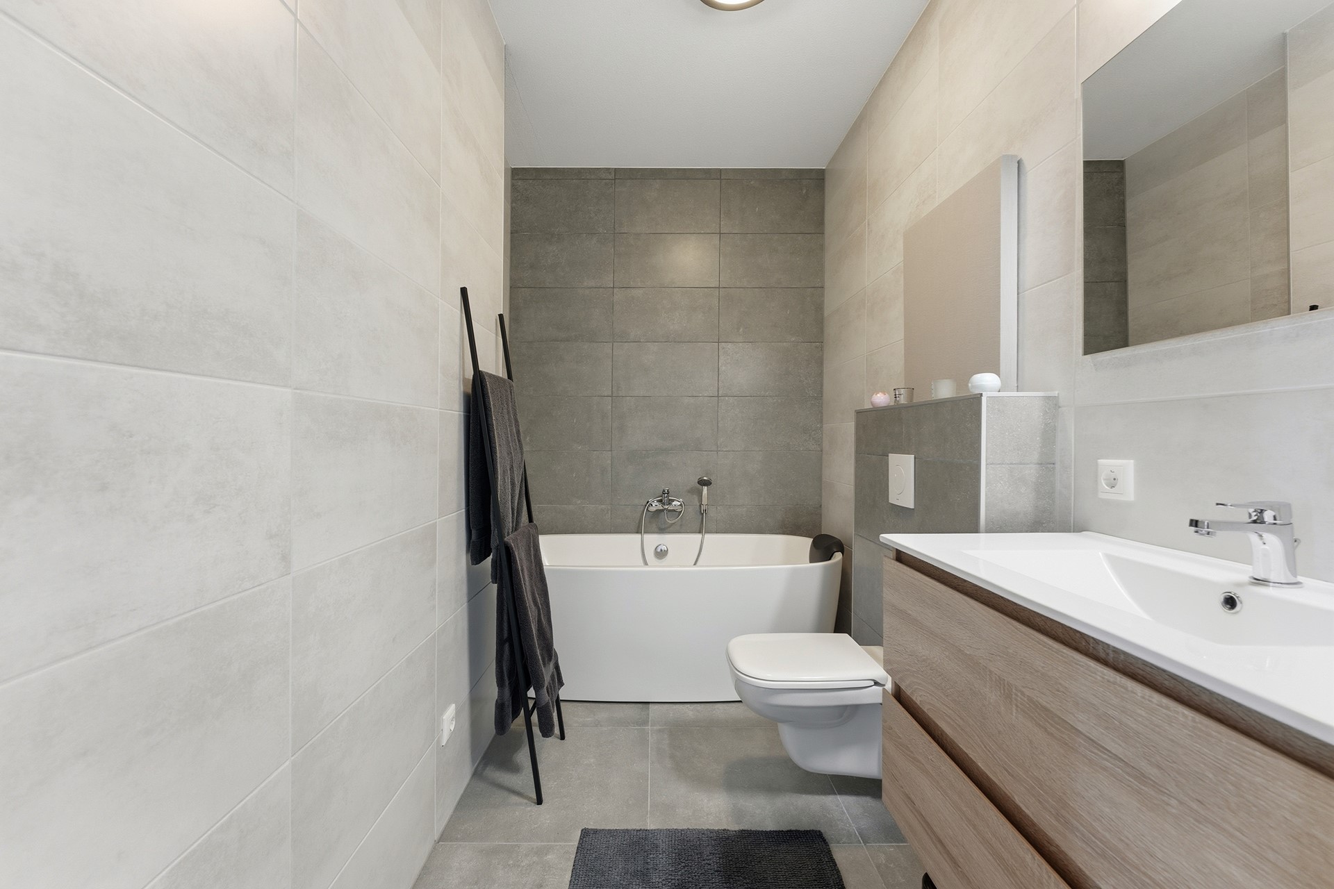 Badkamer: De badkamer is volledig betegeld en strak afgewerkt, met een rustige en moderne uitstraling. Voorzien van een ligbad met douchegelegenheid, toilet en meubel met geïntegreerde wastafel. Een heerlijke plek om te ontspannen na een drukke dag.