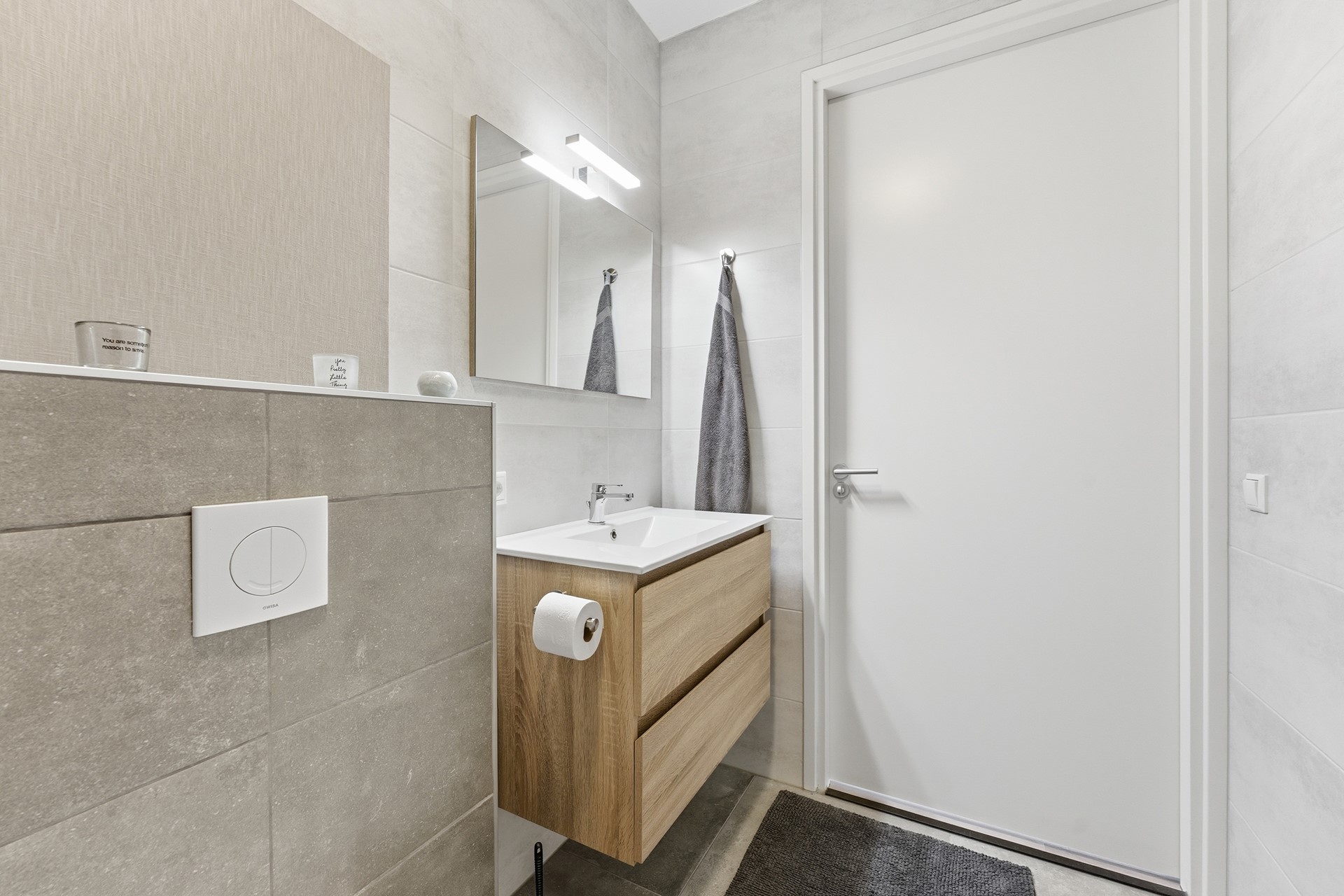 Toilet: De toiletruimte is keurig afgewerkt, deels betegeld en voorzien van een zwevend toilet en een fonteintje.