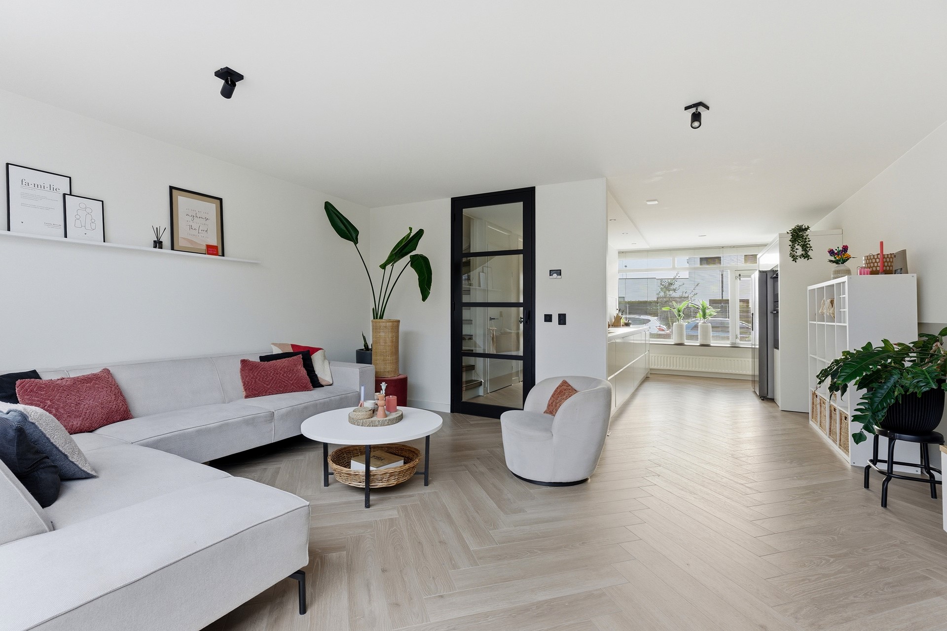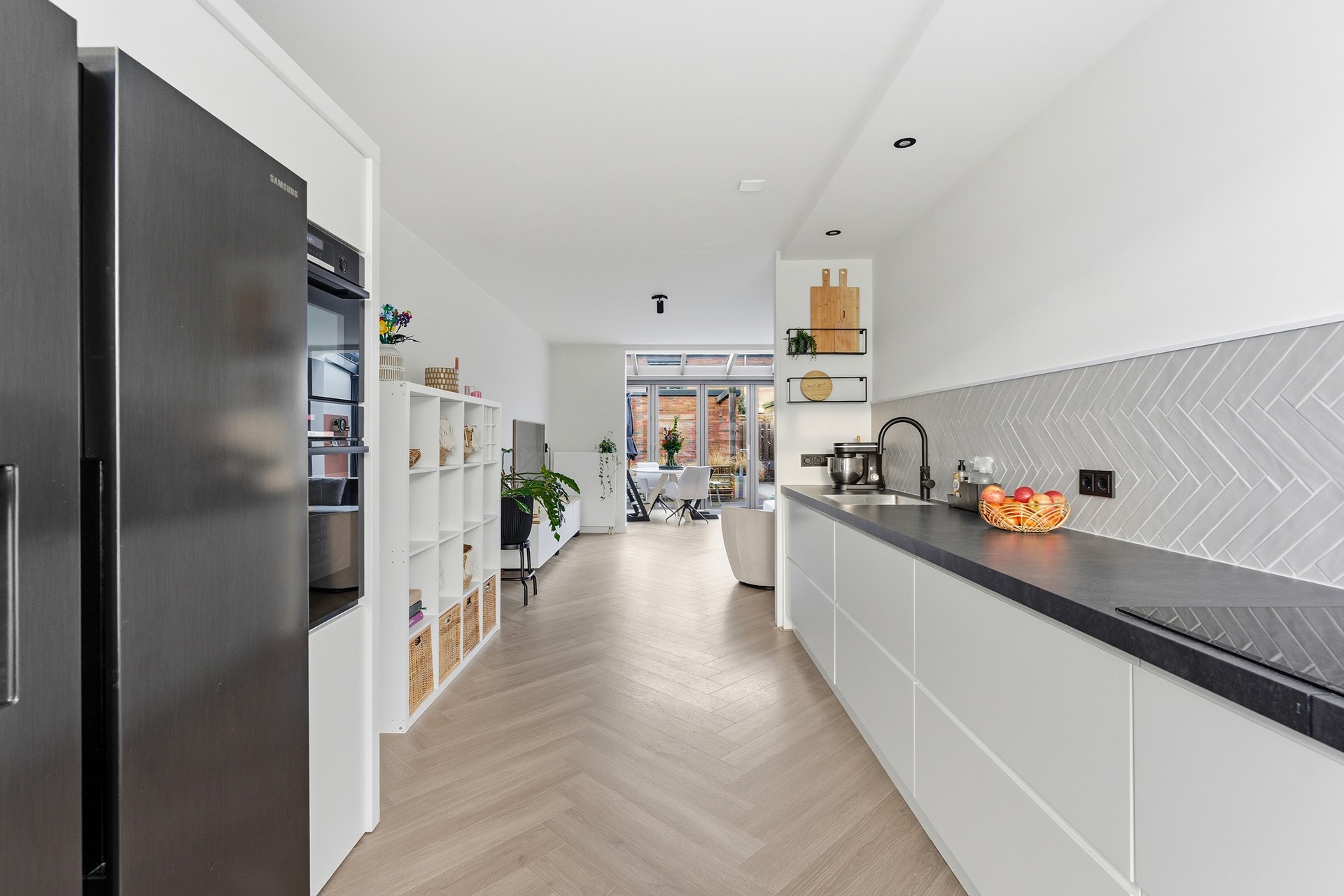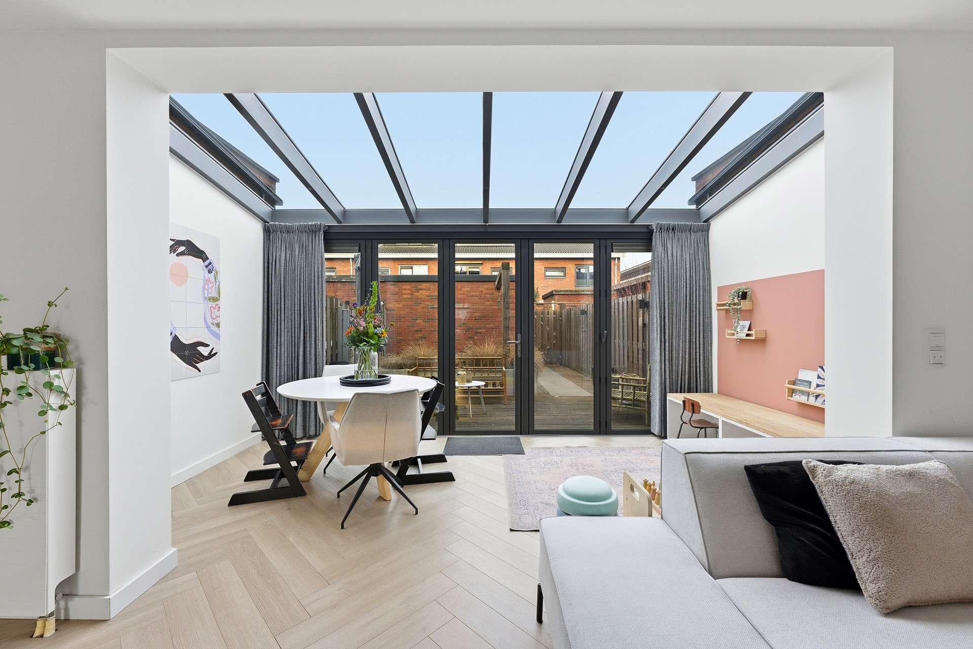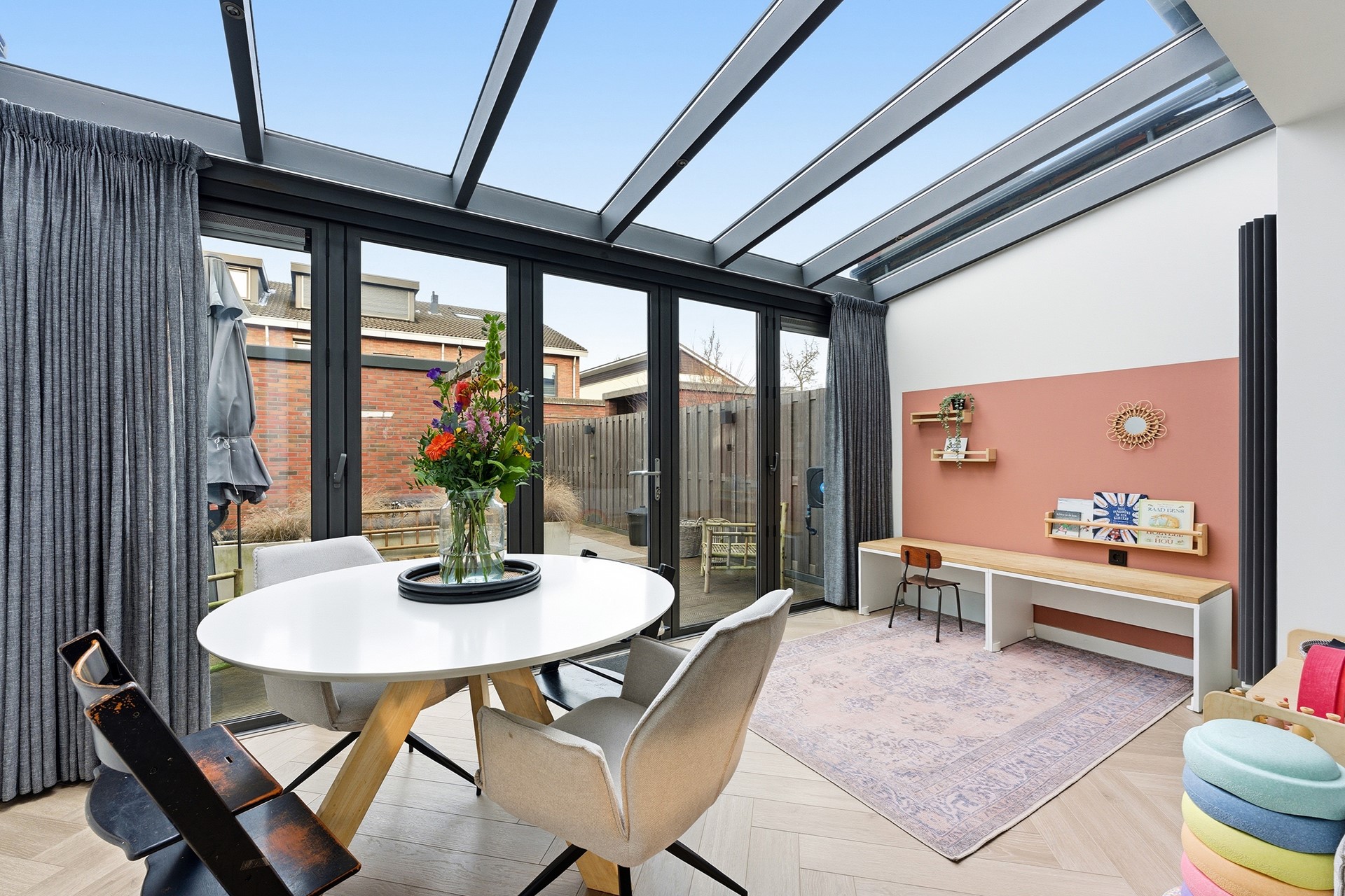 Woonkamer: De woonkamer is ruim van opzet en profiteert van veel lichtinval dankzij de grote pui aan de achterzijde. Er is meer dan voldoende ruimte voor een comfortabele zithoek. In de aanbouw kun je een heerlijke eethoek, speelhoek of echte tuinkamer creëren, wat een licht! De aanbouw is bovendien voorzien van een zonnescherm, waardoor het ook op warme zomerdagen aangenaam toeven is. Richting de voorzijde van de woning loop je zo door naar de keuken.