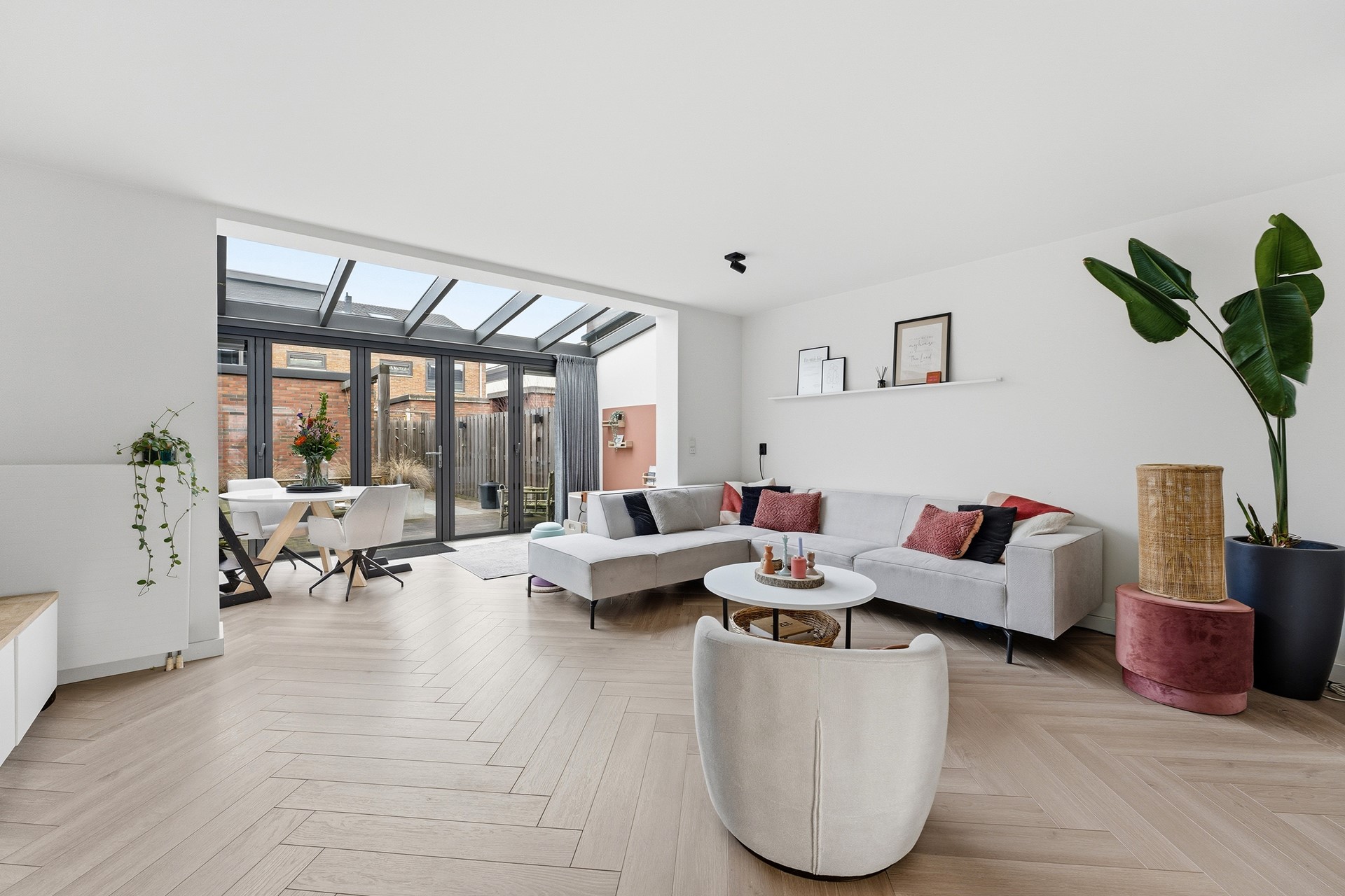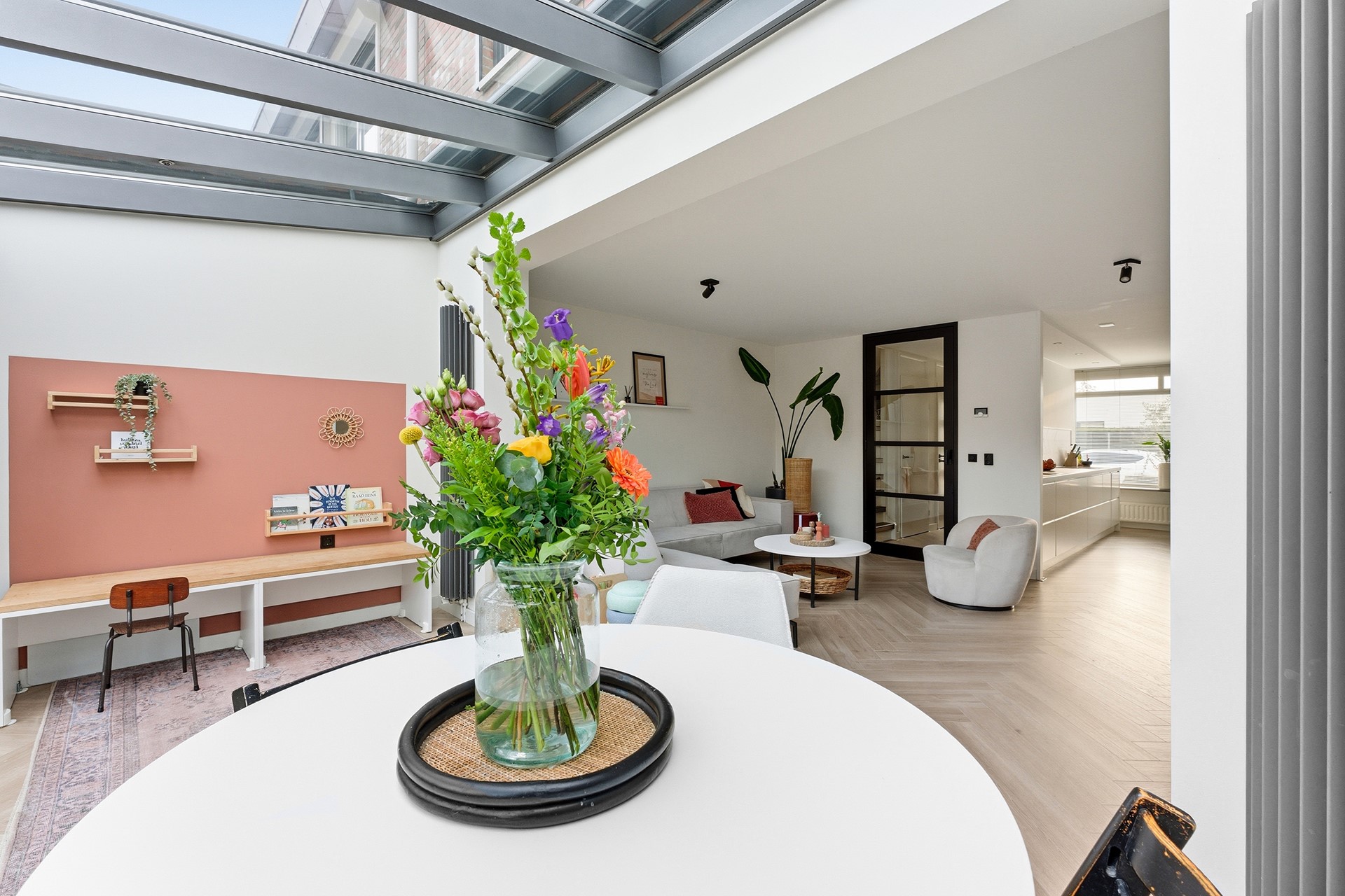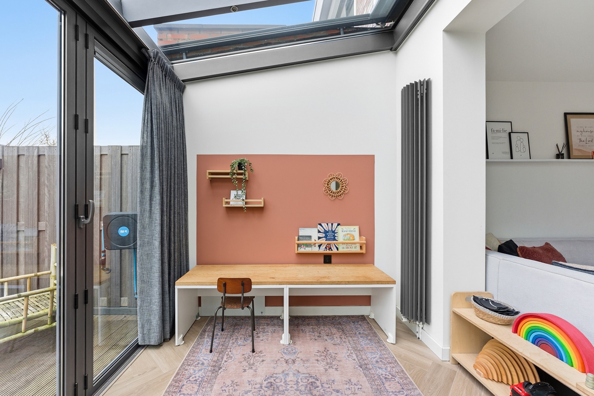 Woonkamer: De woonkamer is ruim van opzet en profiteert van veel lichtinval dankzij de grote pui aan de achterzijde. Er is meer dan voldoende ruimte voor een comfortabele zithoek. In de aanbouw kun je een heerlijke eethoek, speelhoek of echte tuinkamer creëren, wat een licht! De aanbouw is bovendien voorzien van een zonnescherm, waardoor het ook op warme zomerdagen aangenaam toeven is. Richting de voorzijde van de woning loop je zo door naar de keuken.