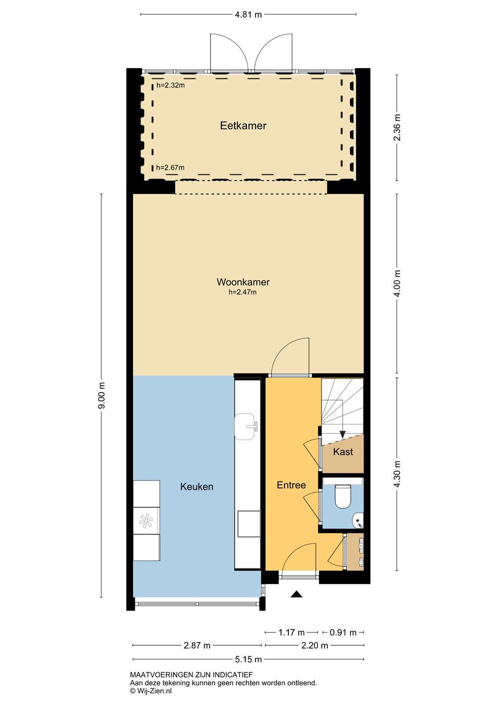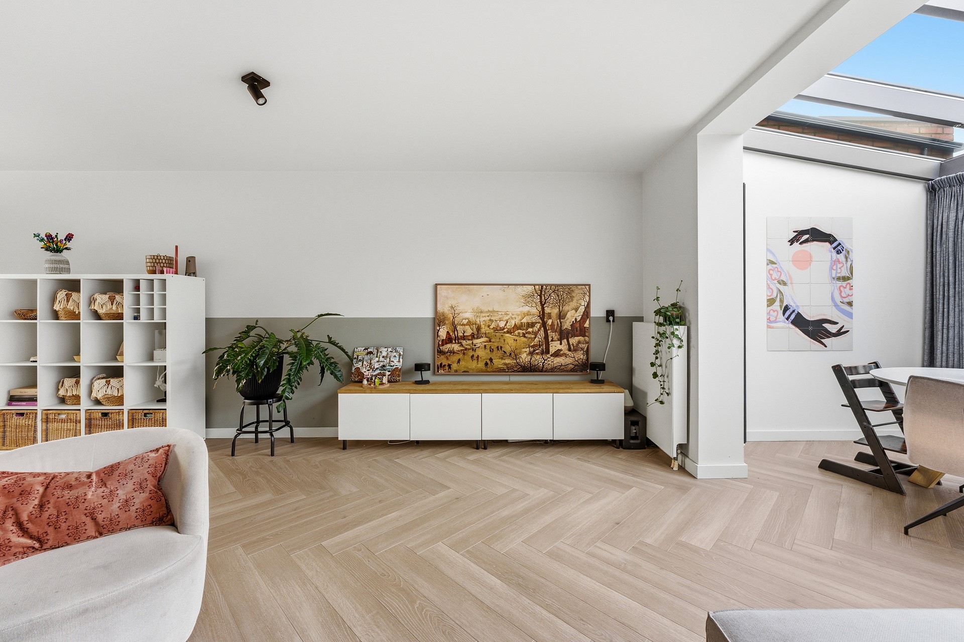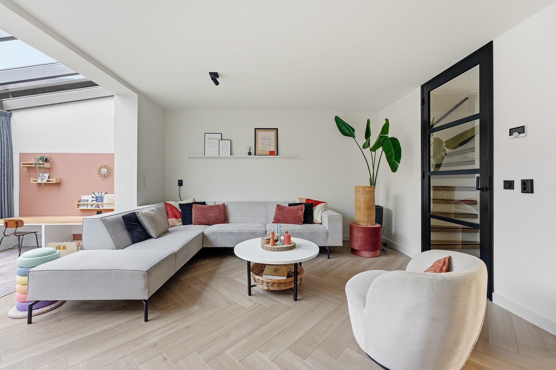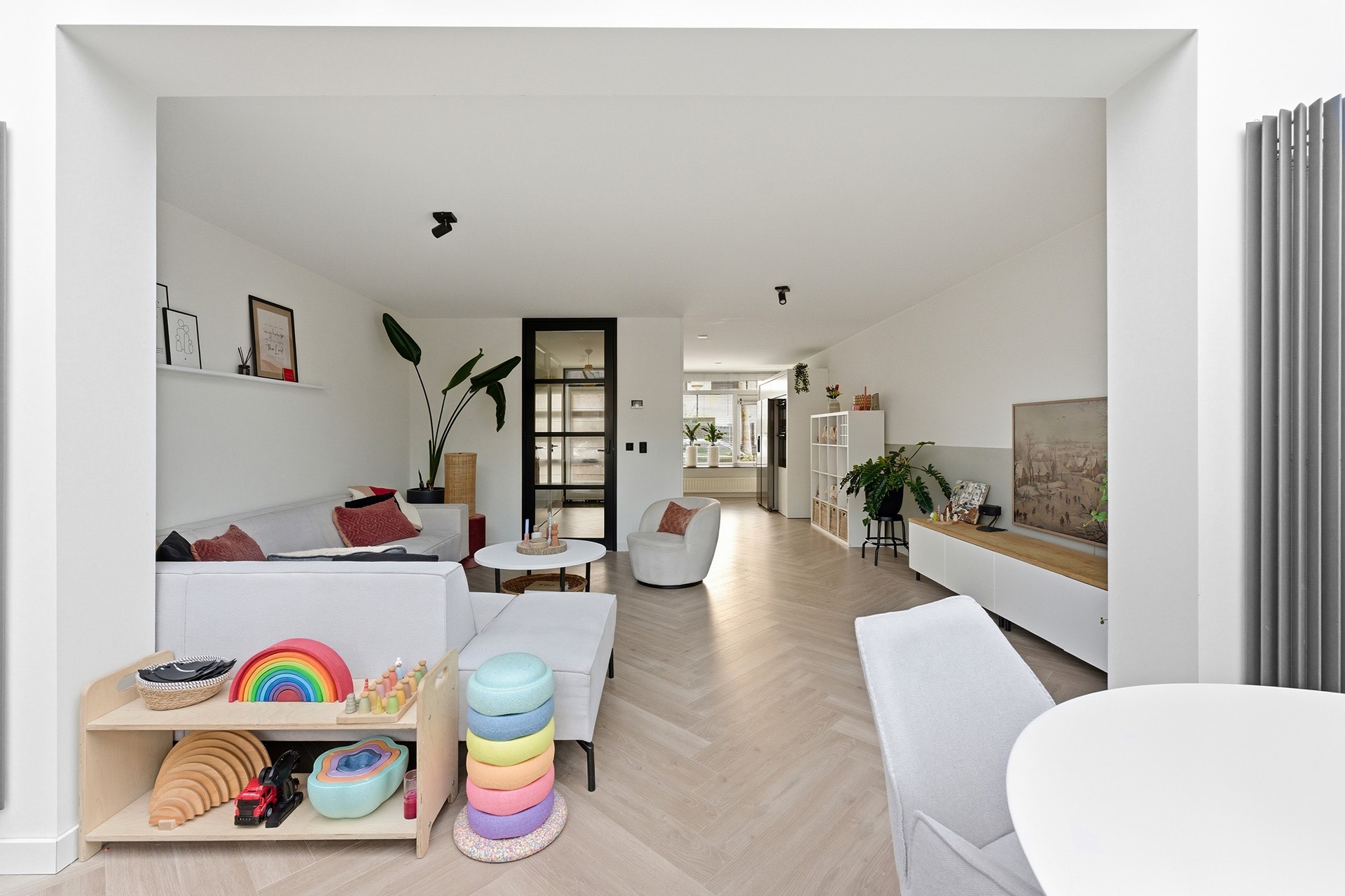 Woonkamer: De woonkamer is ruim van opzet en profiteert van veel lichtinval dankzij de grote pui aan de achterzijde. Er is meer dan voldoende ruimte voor een comfortabele zithoek. In de aanbouw kun je een heerlijke eethoek, speelhoek of echte tuinkamer creëren, wat een licht! De aanbouw is bovendien voorzien van een zonnescherm, waardoor het ook op warme zomerdagen aangenaam toeven is. Richting de voorzijde van de woning loop je zo door naar de keuken.