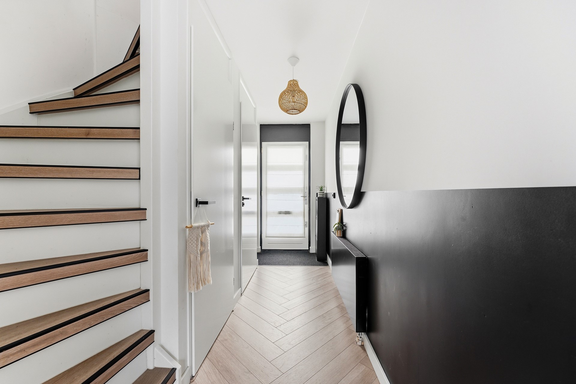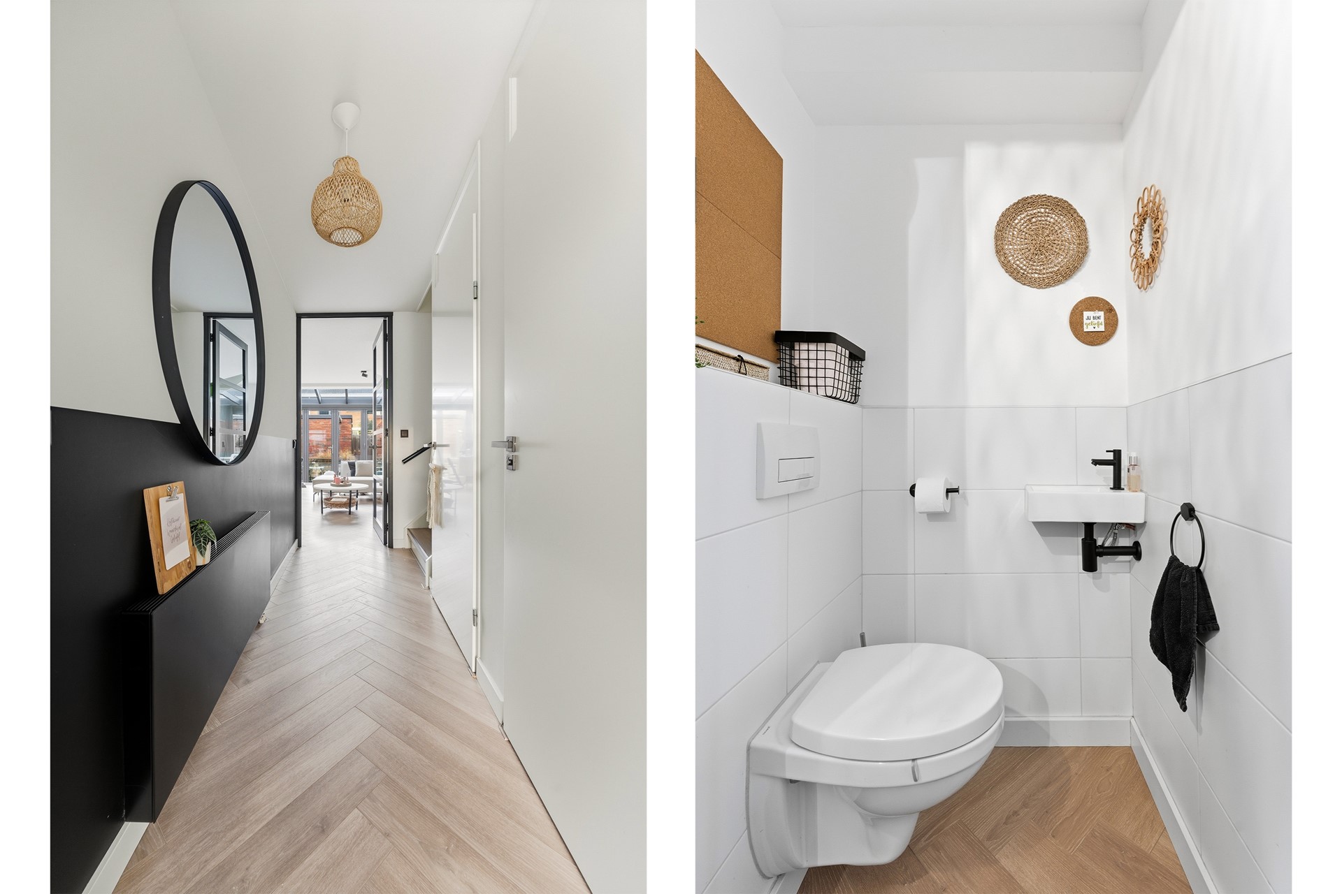 Entree: Als je binnenstapt zie je nog maar een tipje van de sluier van deze prachtige woning. In de hal valt direct de verzorgde afwerking op, met een laminaatvloer in visgraatmotief die doorloopt over de gehele begane grond. Vanuit de hal heb je toegang tot de toiletruimte, de meterkast, de trapopgang naar de eerste verdieping, de trapkast en de woonkamer.