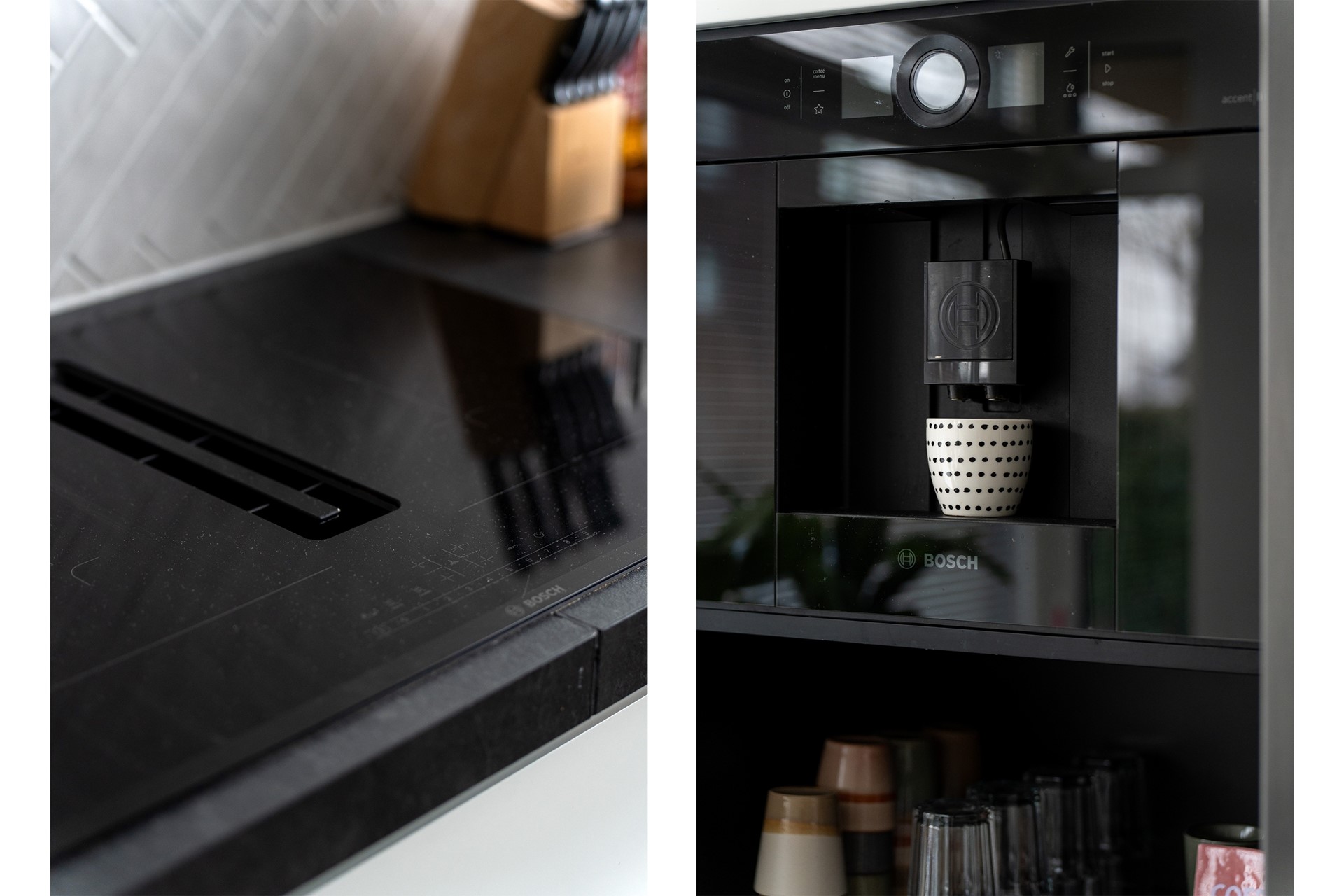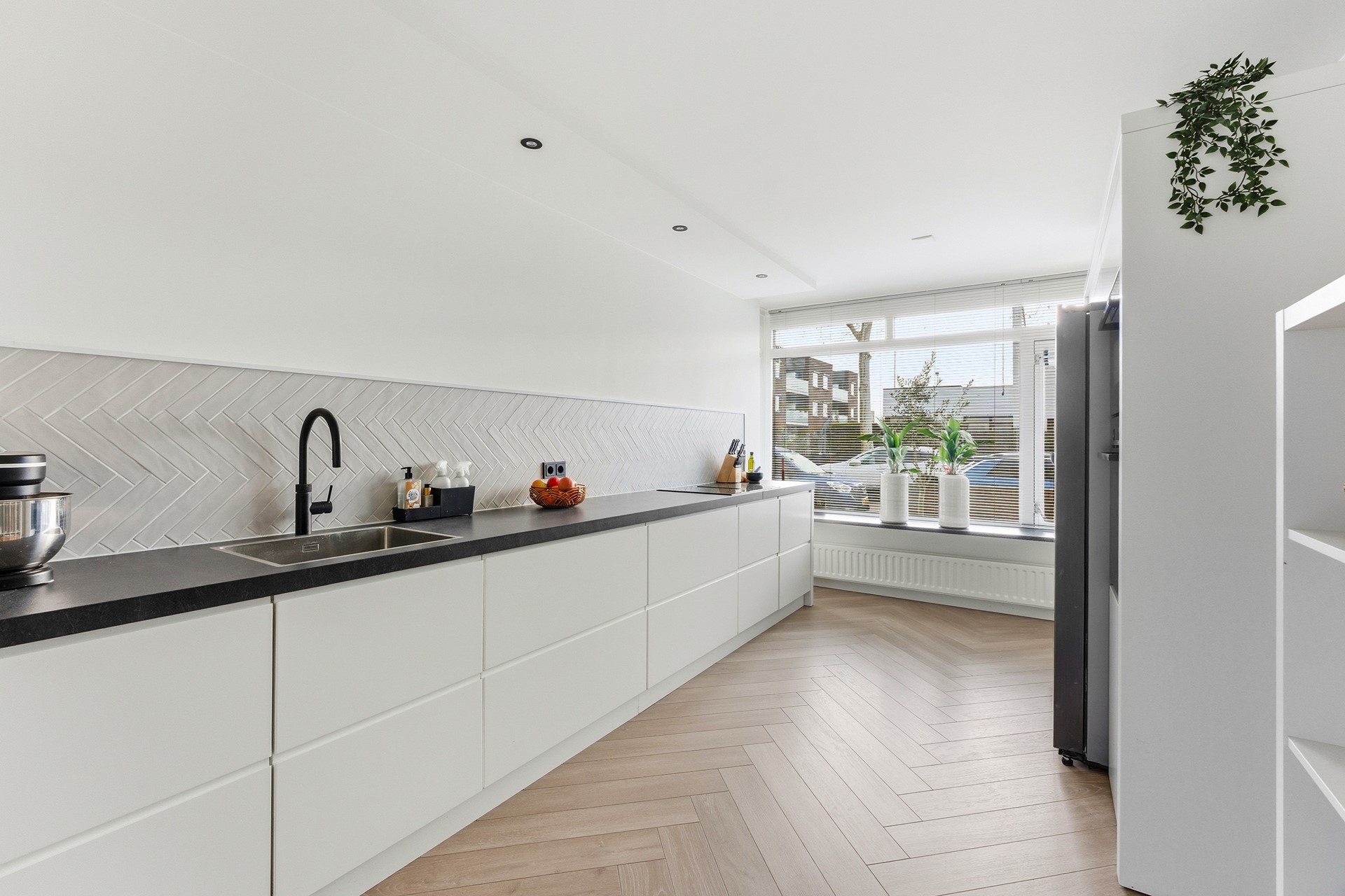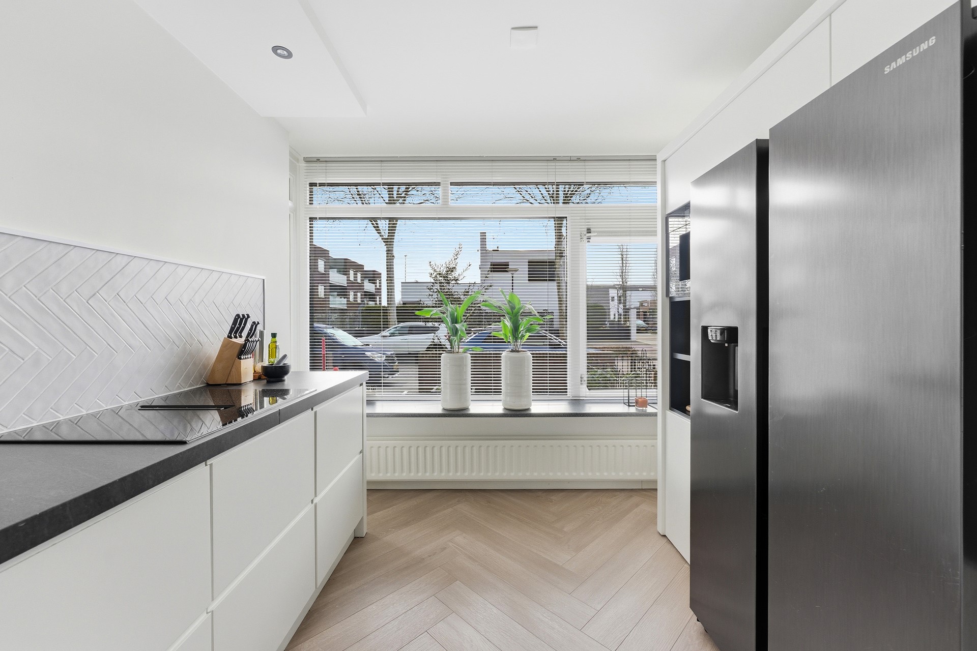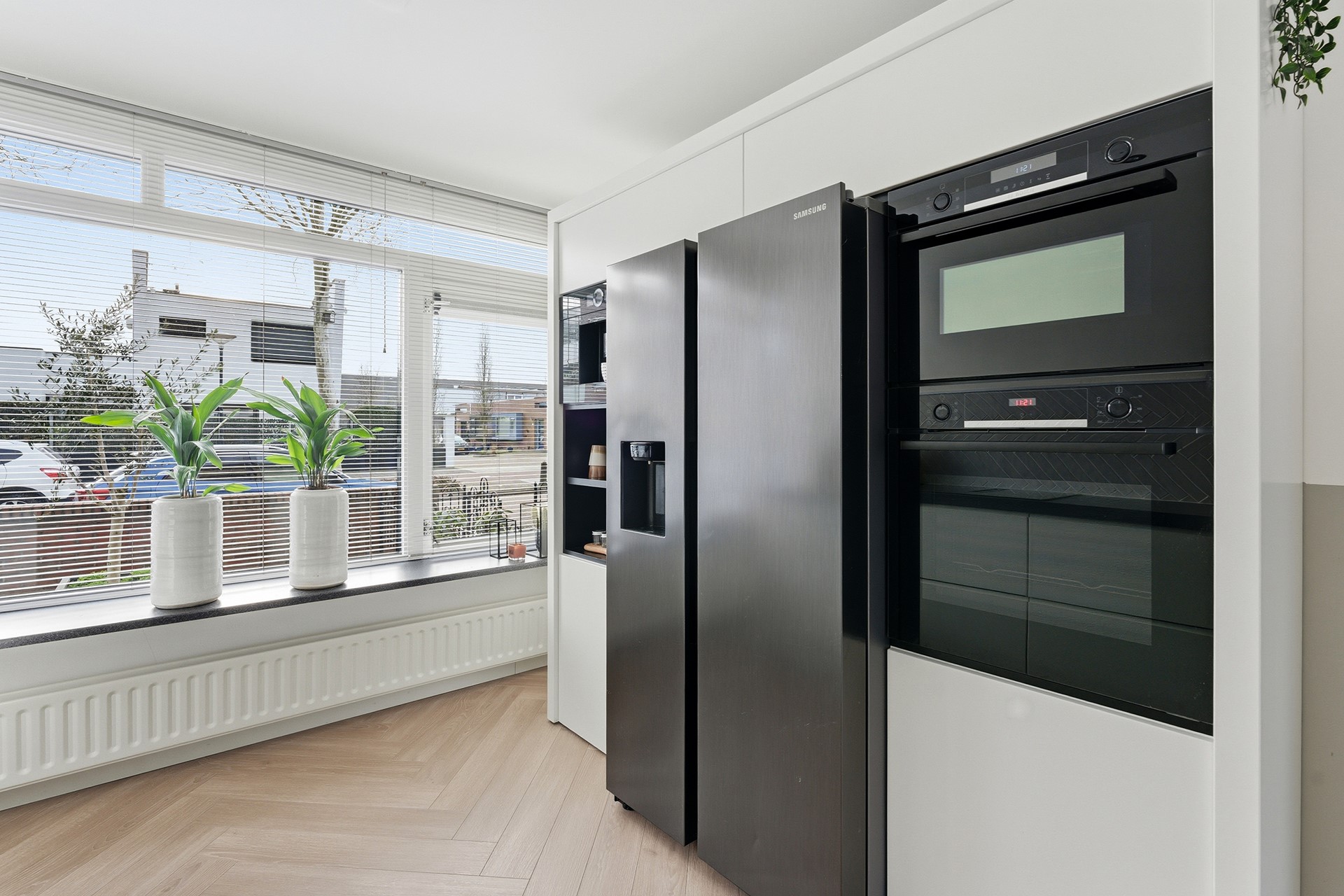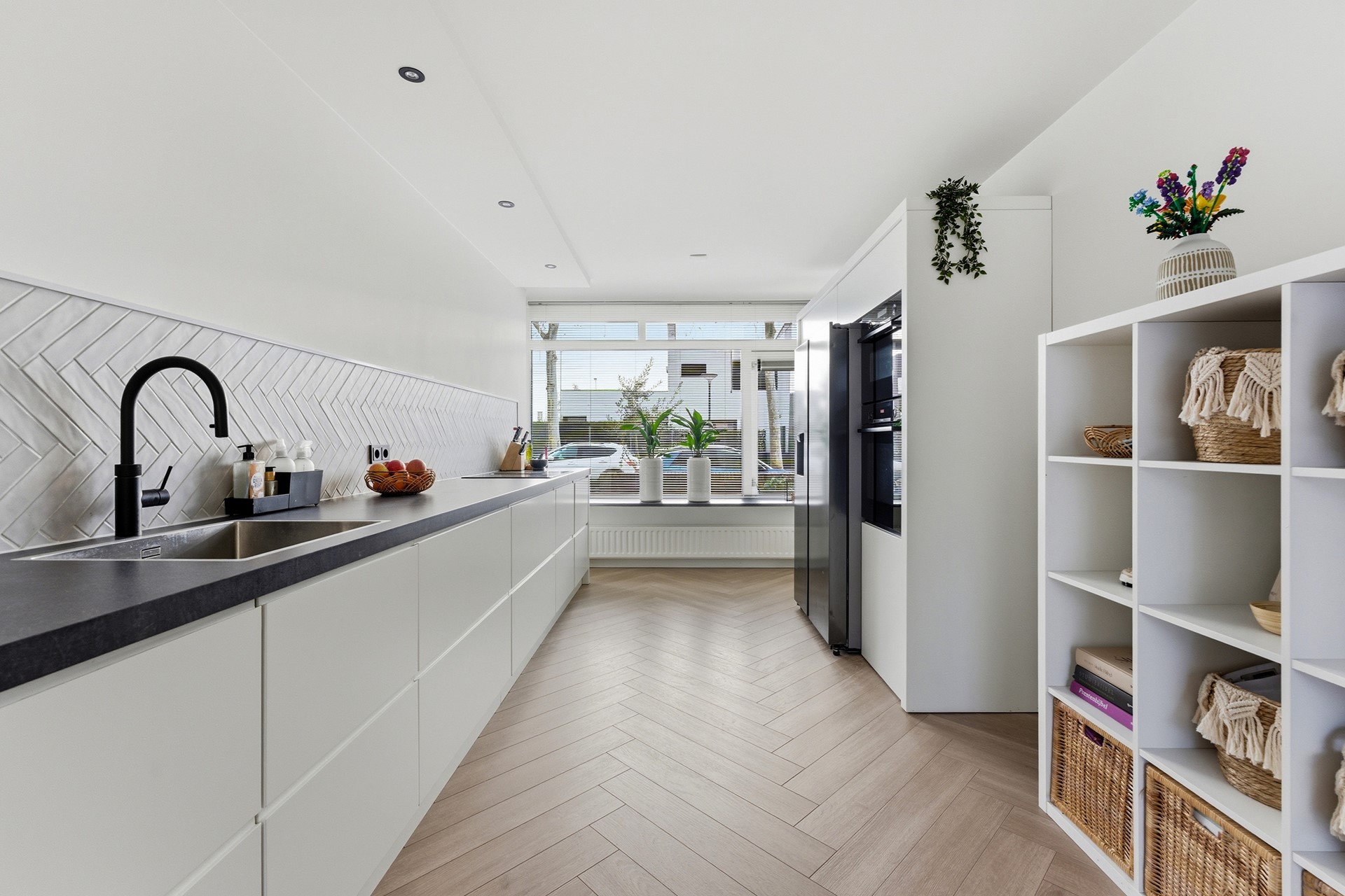 Keuken: De open keuken is gelegen aan de voorzijde van de woning en uitgevoerd in een rechte opstelling met prettig zicht naar buiten. De keuken is strak afgewerkt en voorzien van een speels betegelde wand in een neutrale kleurstelling. Hier kunt je direct aan de slag met het koken van jouw favoriete gerecht! De keuken beschikt over een oven, oven-magnetroncombinatie, koffiemachine, inductiekookplaat met geïntegreerde afzuiging, koel-vriescombinatie, Quooker en een vaatwasser.