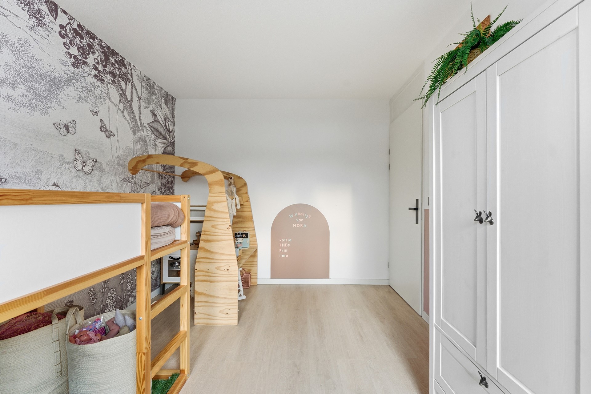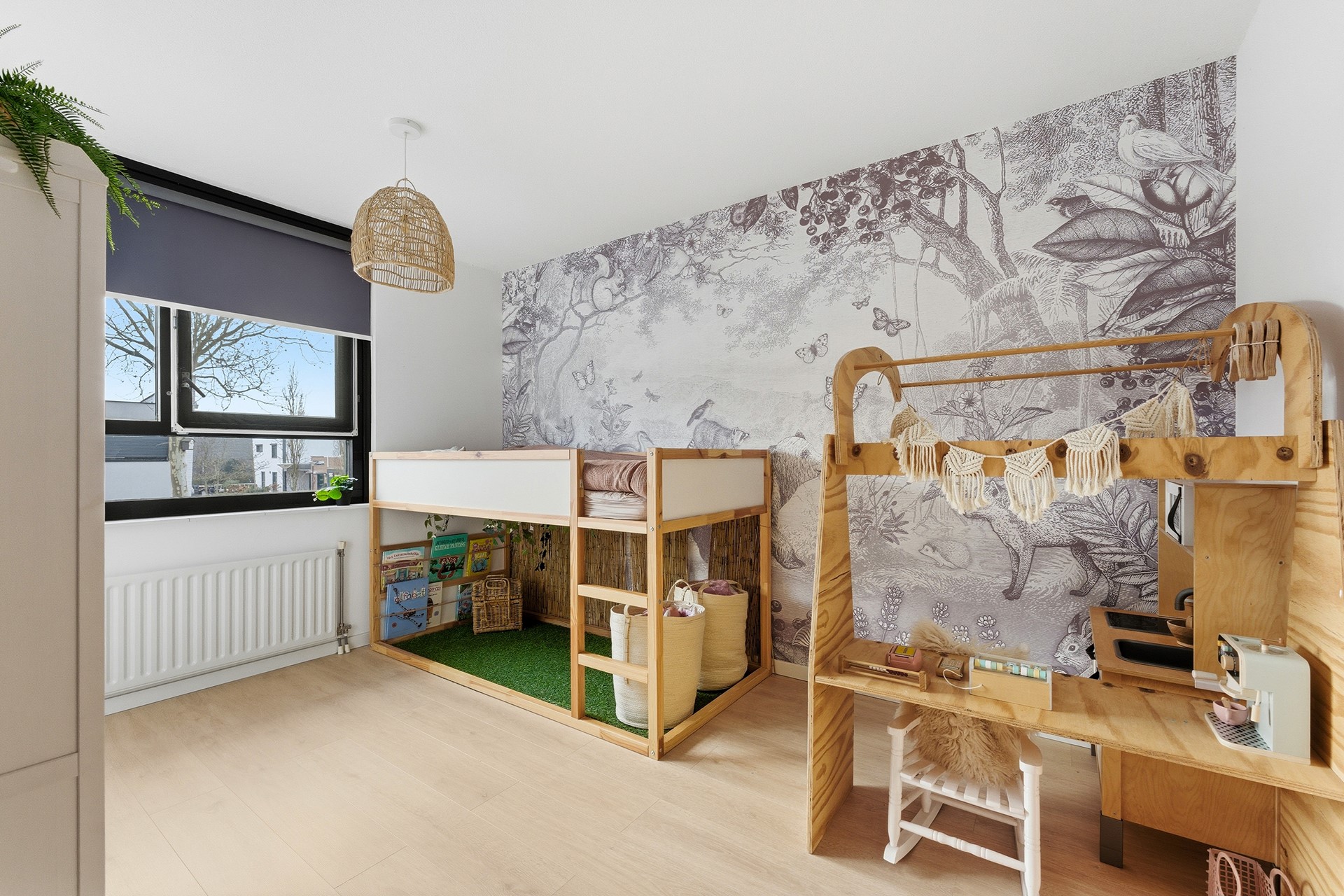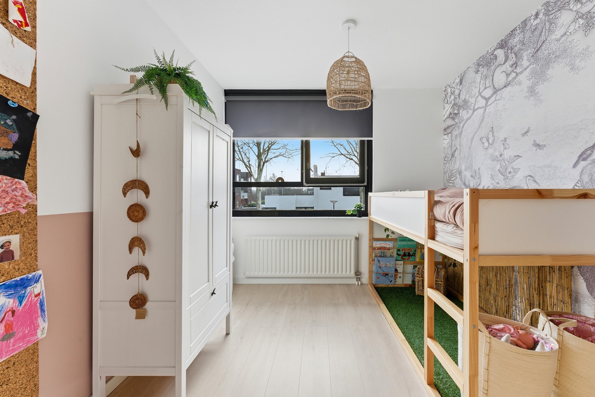 Slaapkamer 1: Deze slaapkamer is voorzien van een groot raam, waardoor er veel licht naar binnen valt. Het rolluik zorgt ervoor dat de kamer goed kan worden verduisterd. Dit maakt de ruimte zeer geschikt als kinderkamer, met voldoende plek voor een bed, bureau en eventueel een speelhoek. De kamer is afgewerkt met behangwanden en een spuitwerkplafond.