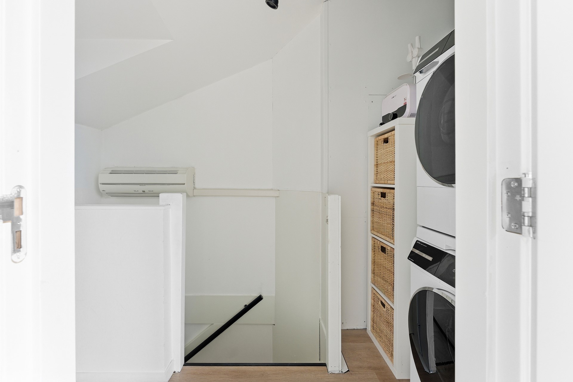 Overloop: Op de voorzolder bevinden zich de aansluitingen voor de wasmachine en droger, evenals de opstelplaats van de cv-ketel. Hier hangt ook de airconditioning voor deze verdieping. De ruimte is netjes afgewerkt met een laminaatvloer en gestuukte wanden en plafonds, evenals de slaapkamer op deze verdieping.