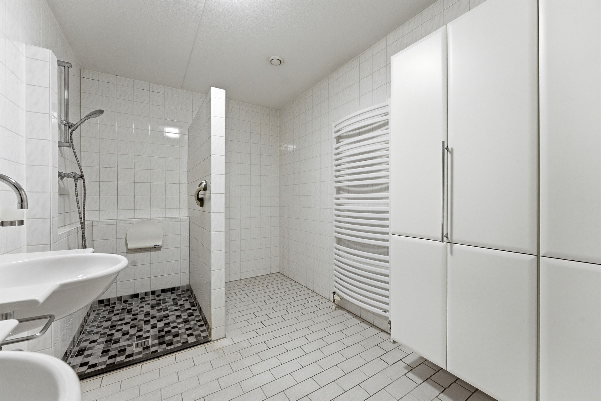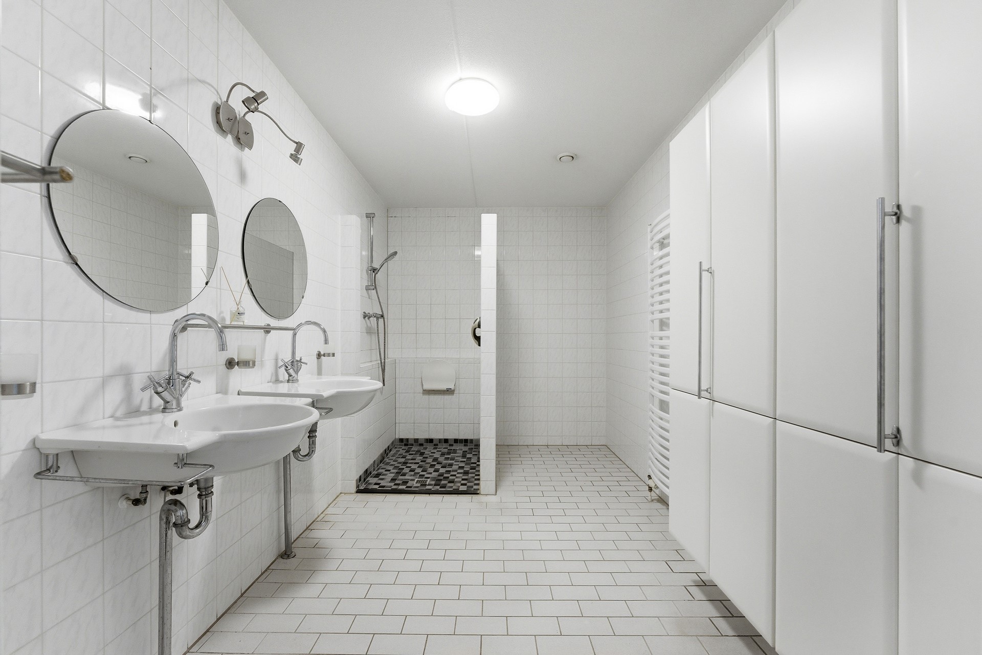 Badkamer: De badkamer is ruim opgezet en volledig betegeld. De ruimte is voorzien van een inloopdouche, twee wastafels, een designradiator en een grote opbergkast voor uw handdoeken en toiletartikelen. De ruimte is tevens voorzien van mechanische ventilatie.