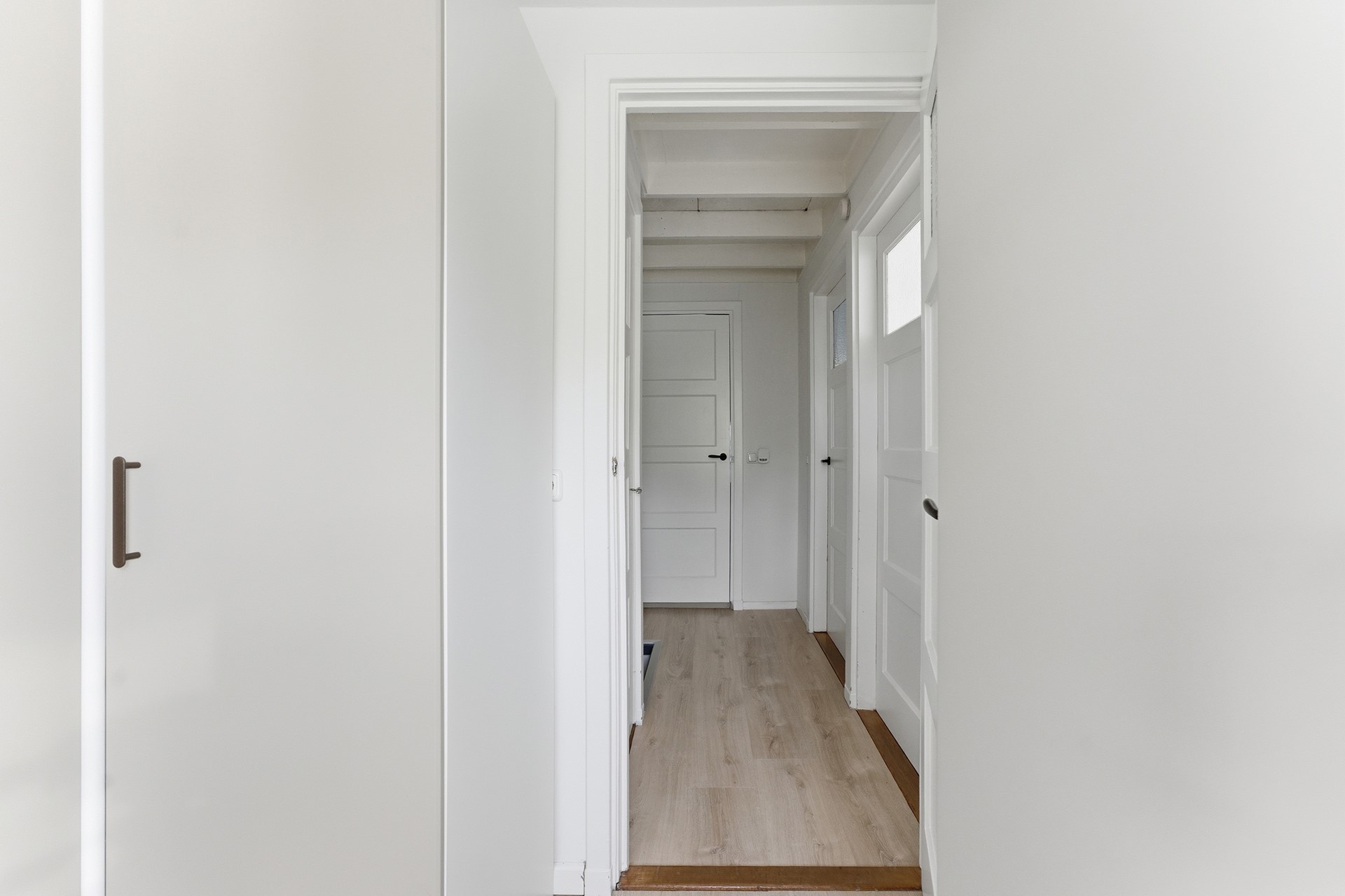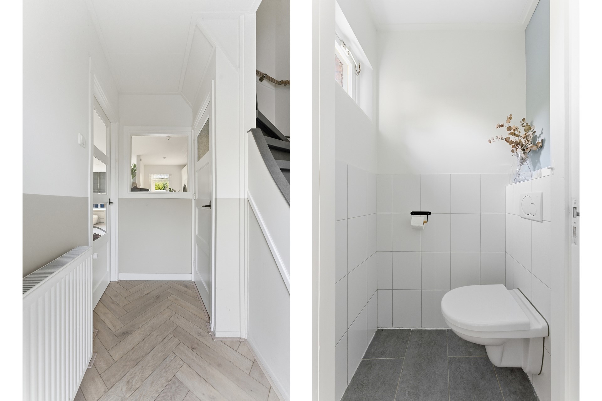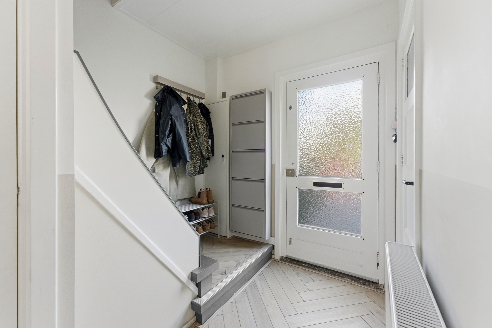 Entree: Ruime hal met paneeldeuren, waar de PVC-visgraatvloer mooi doorloopt naar de woonkamer. Vanuit hier heb je toegang tot de meterkast, trapkast, toiletruimte en woonkamer. De trap naar boven is uitgevoerd met een moderne Upstairs-afwerking. De ruimte is afgewerkt met gestuukte wanden en een gips plafond.
