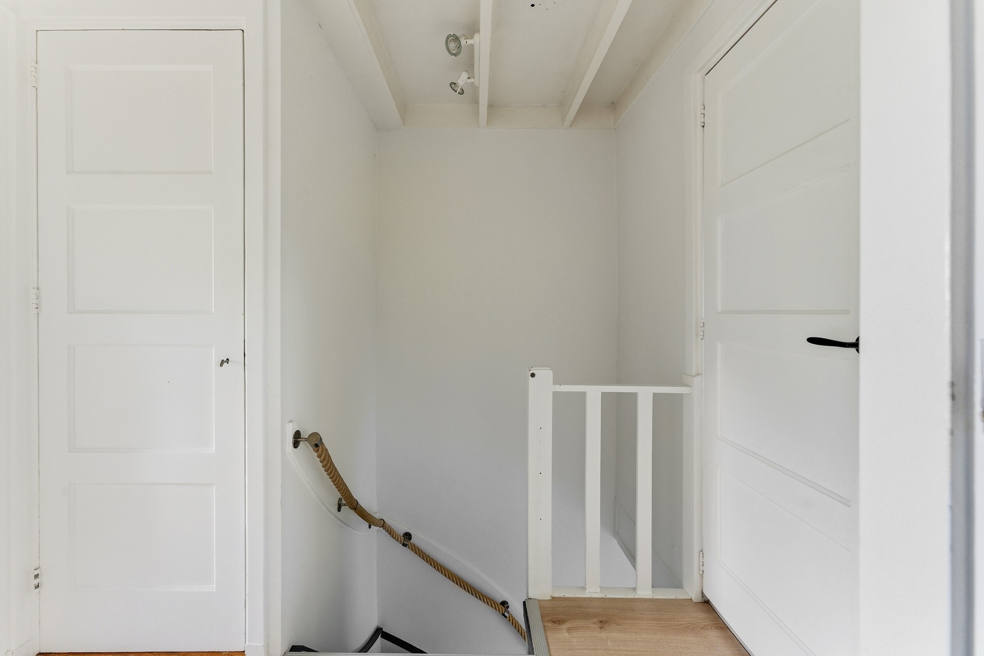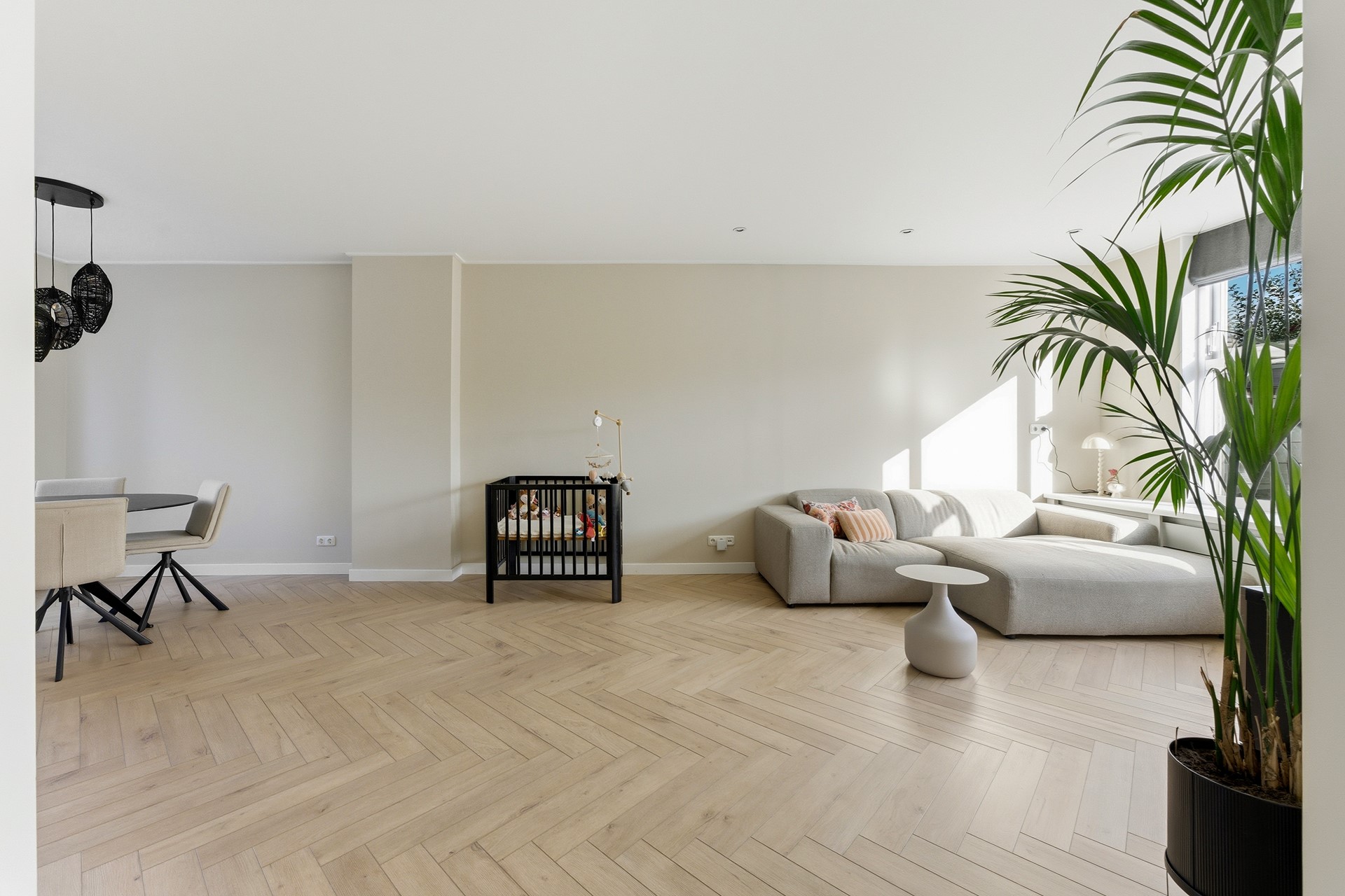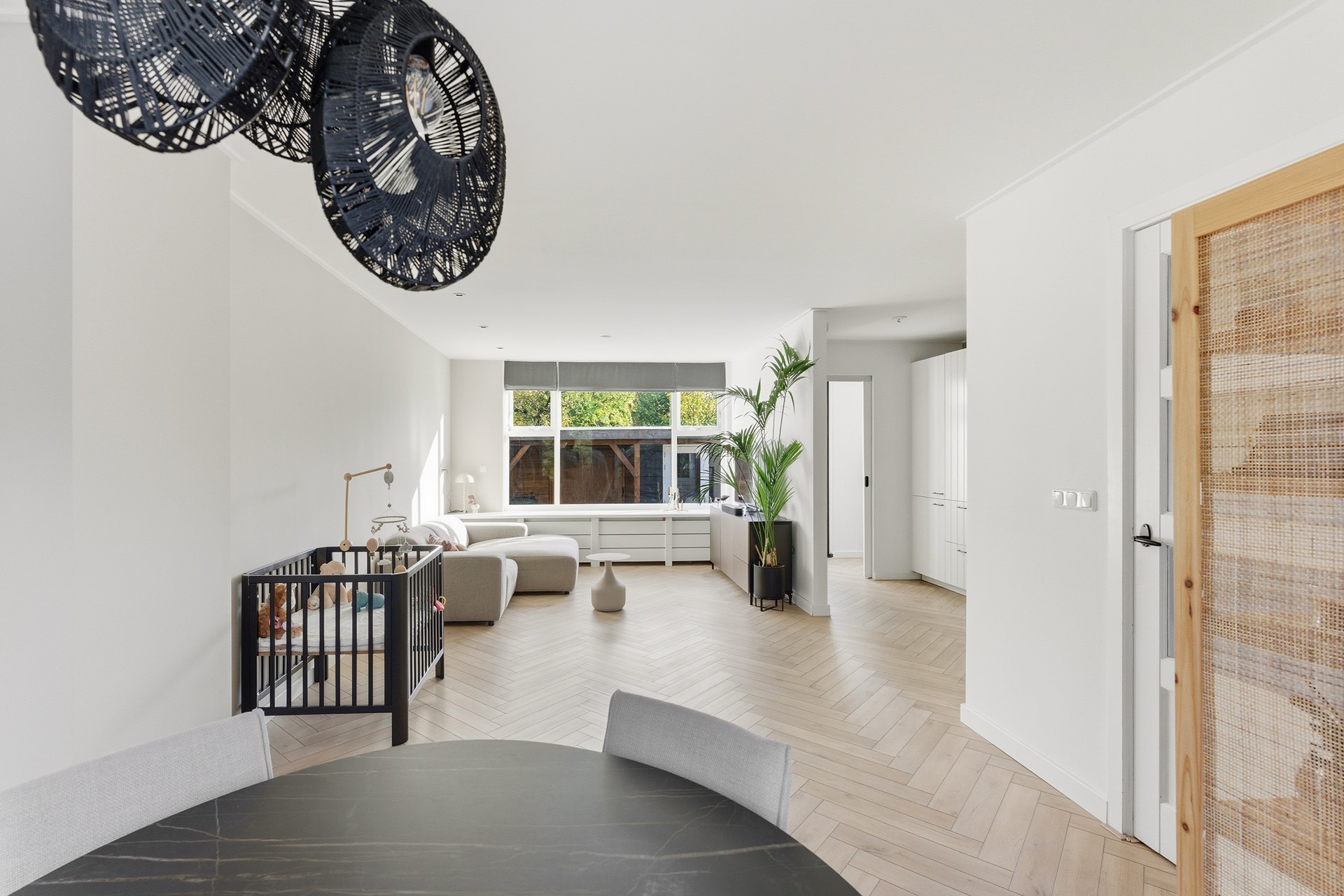 Entree: Ruime hal met paneeldeuren, waar de PVC-visgraatvloer mooi doorloopt naar de woonkamer. Vanuit hier heb je toegang tot de meterkast, trapkast, toiletruimte en woonkamer. De trap naar boven is uitgevoerd met een moderne Upstairs-afwerking. De ruimte is afgewerkt met gestuukte wanden en een gips plafond.