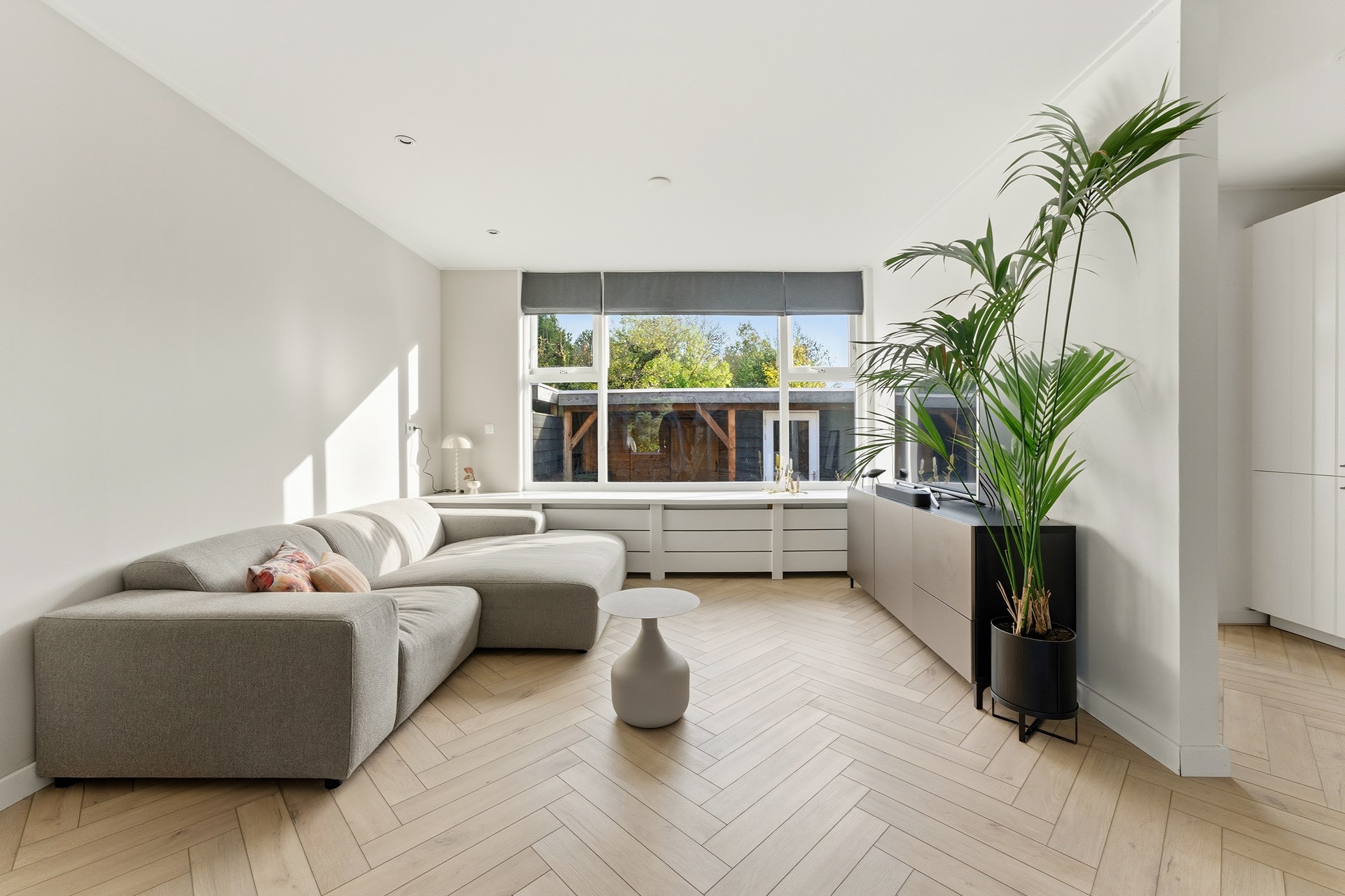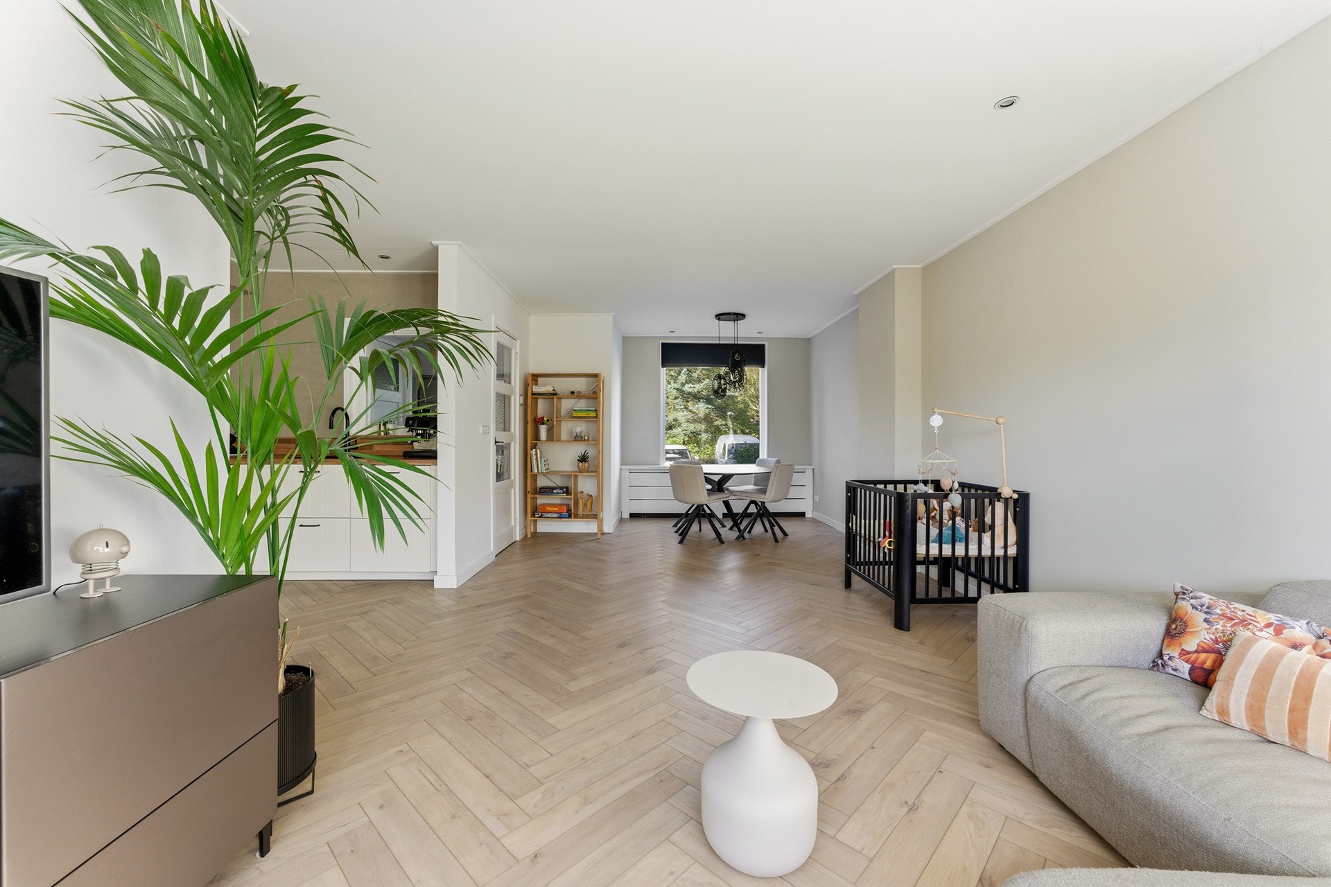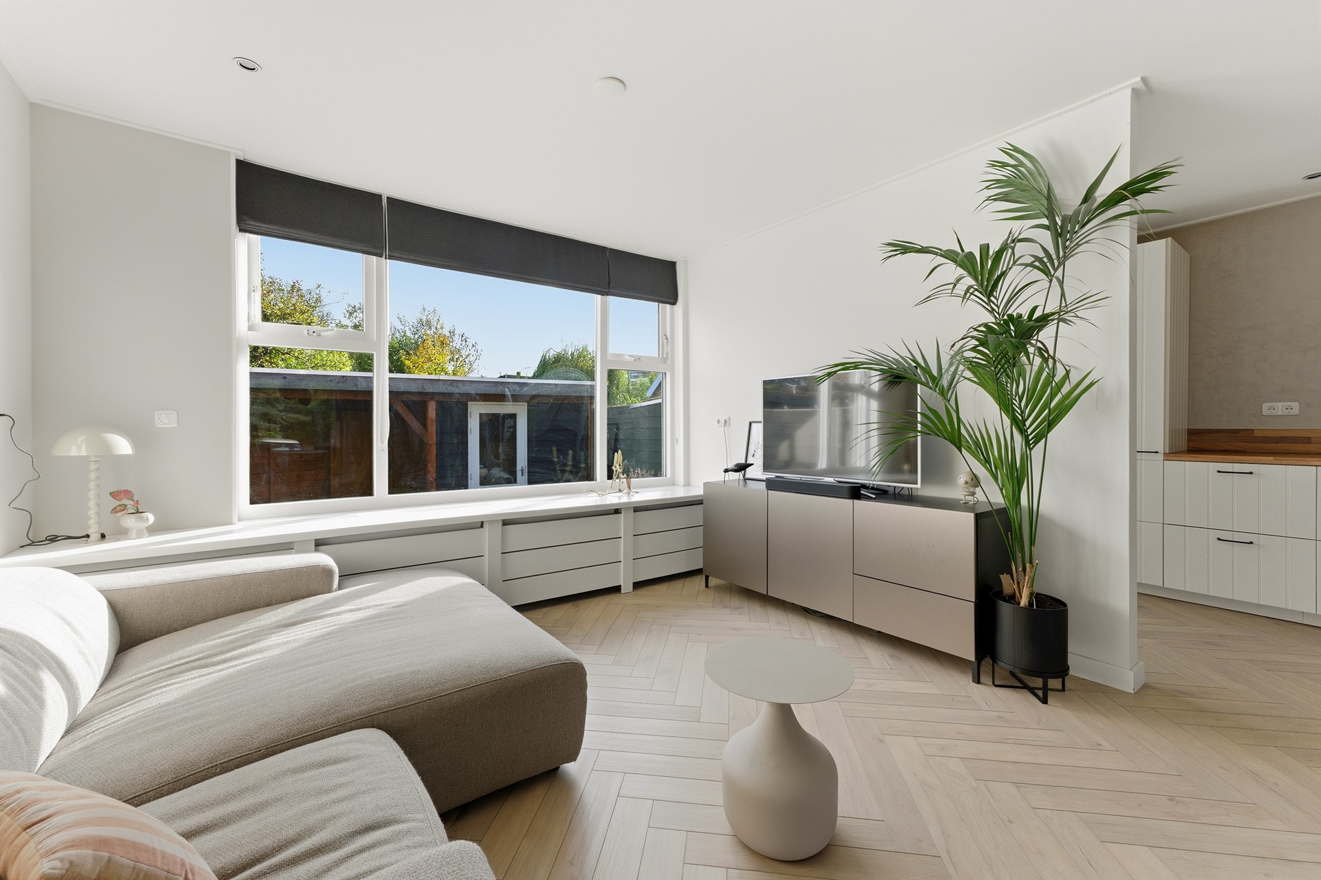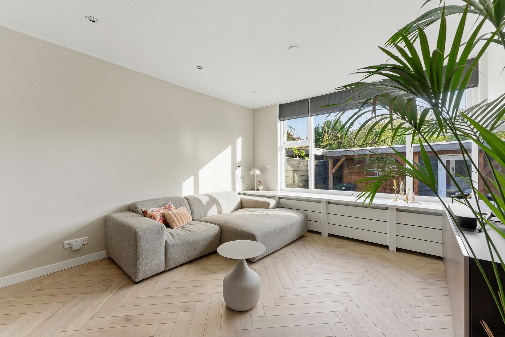 Woonkamer: Wat meteen opvalt is de royale, gezellige woonkamer met visgraatvloer en vloerverwarming. Dankzij de grote ramen komt er veel licht binnen en heb je aan de voorzijde vrij uitzicht over een groen grasveld en charmante jaren ’30 woningen. Zowel voor als achter is een stijlvolle radiatorombouw aanwezig en aan de achterzijde is een screen geplaatst tegen de zon. De ruimte is afgewerkt met gestuukte wanden en een gestuukt plafond.
