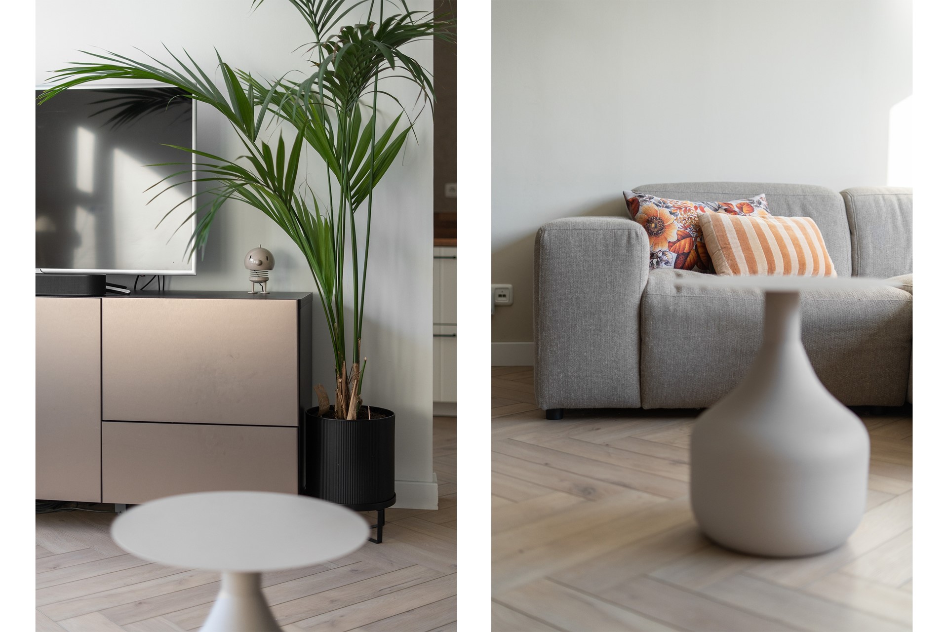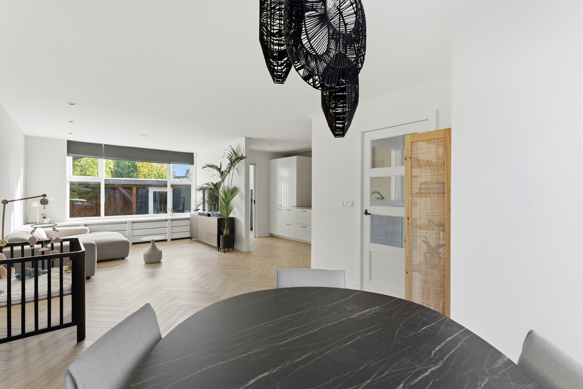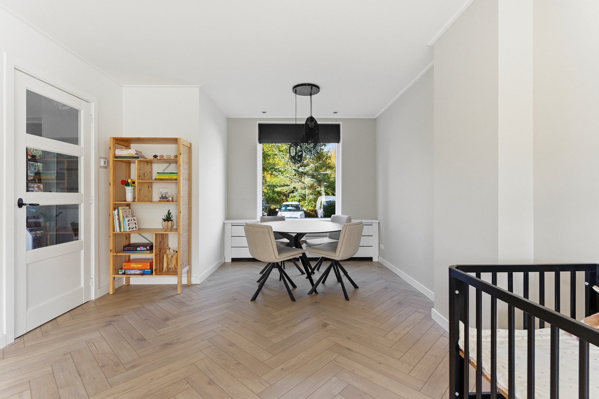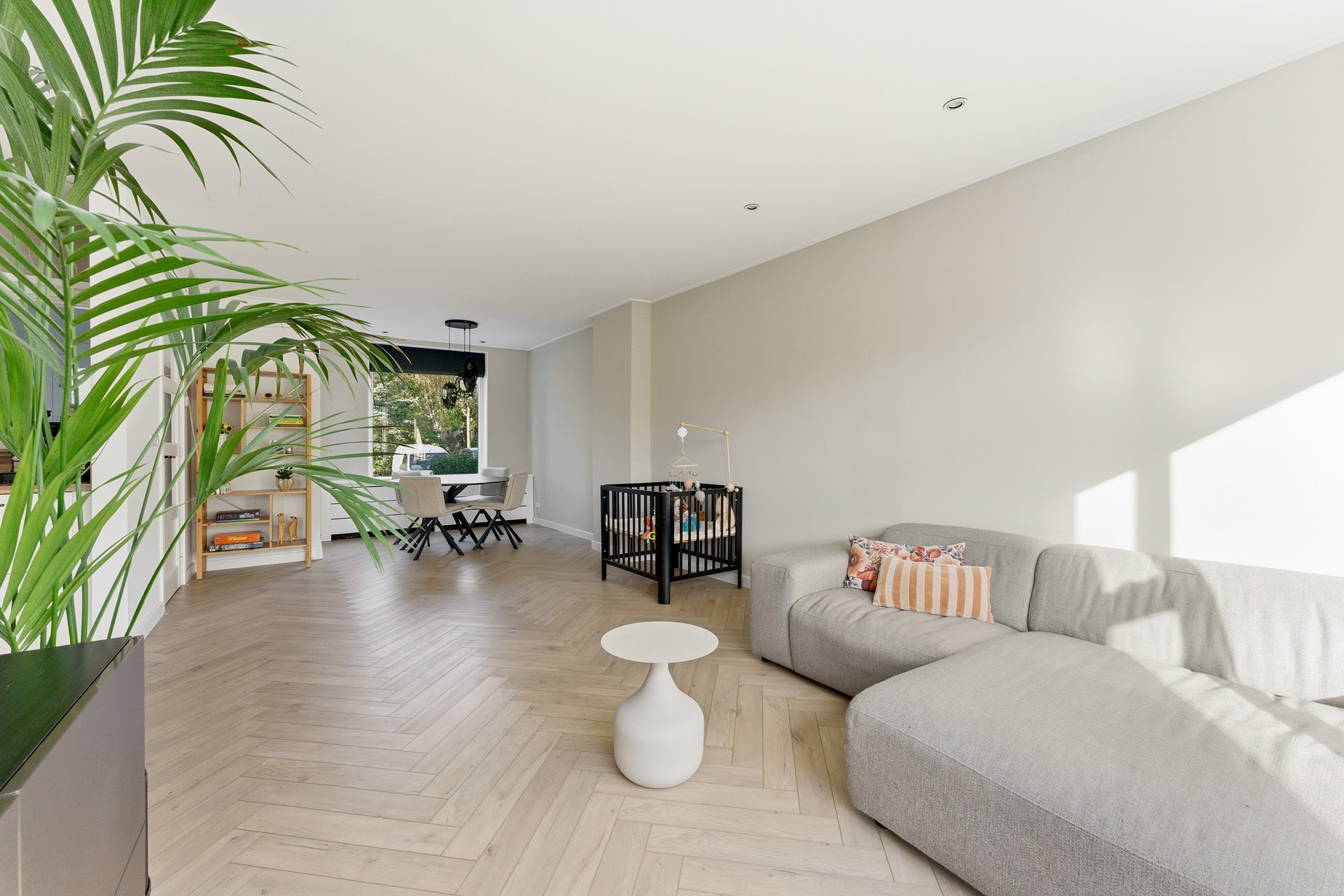 Woonkamer: Wat meteen opvalt is de royale, gezellige woonkamer met visgraatvloer en vloerverwarming. Dankzij de grote ramen komt er veel licht binnen en heb je aan de voorzijde vrij uitzicht over een groen grasveld en charmante jaren ’30 woningen. Zowel voor als achter is een stijlvolle radiatorombouw aanwezig en aan de achterzijde is een screen geplaatst tegen de zon. De ruimte is afgewerkt met gestuukte wanden en een gestuukt plafond.