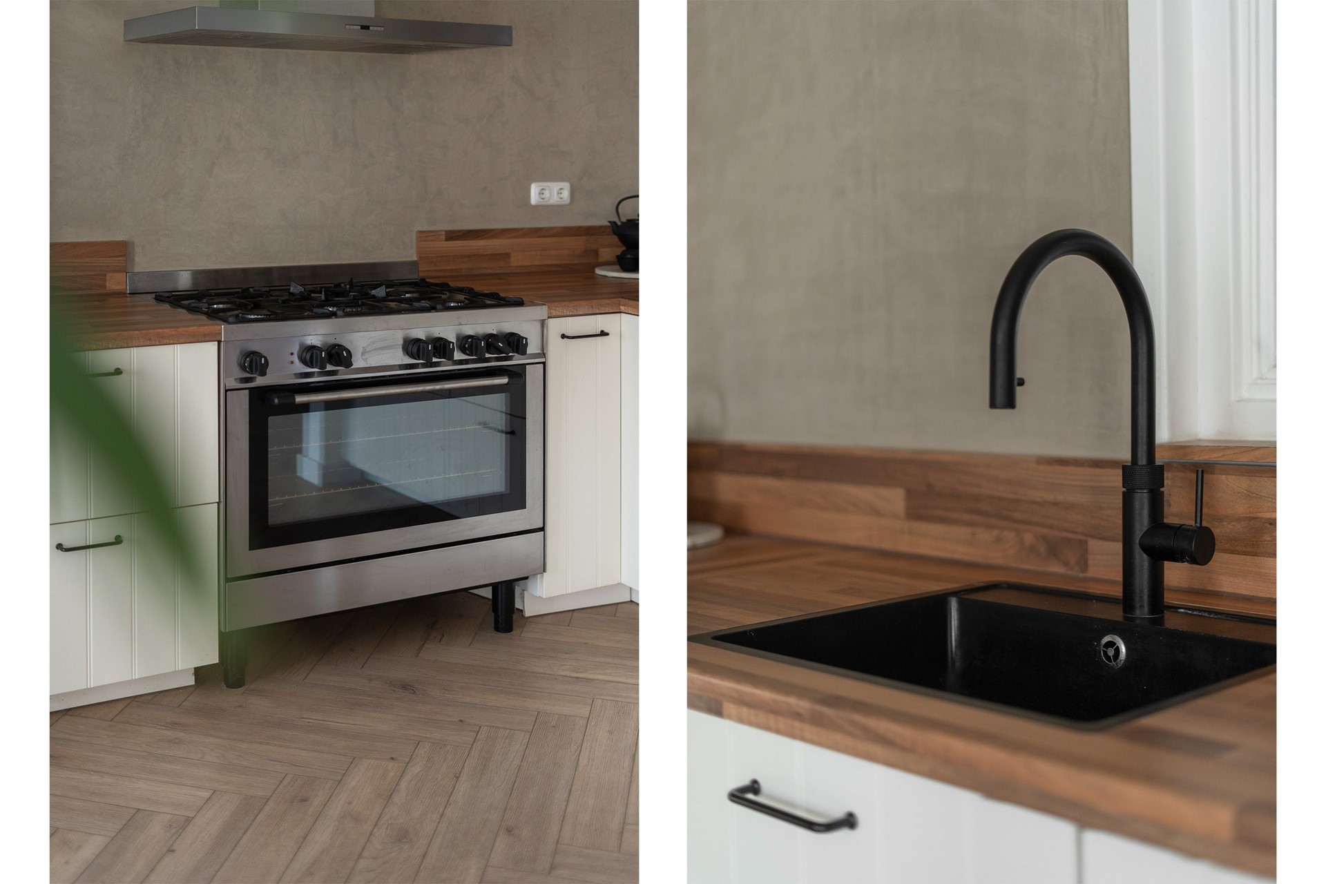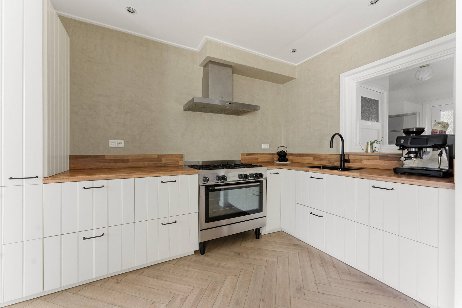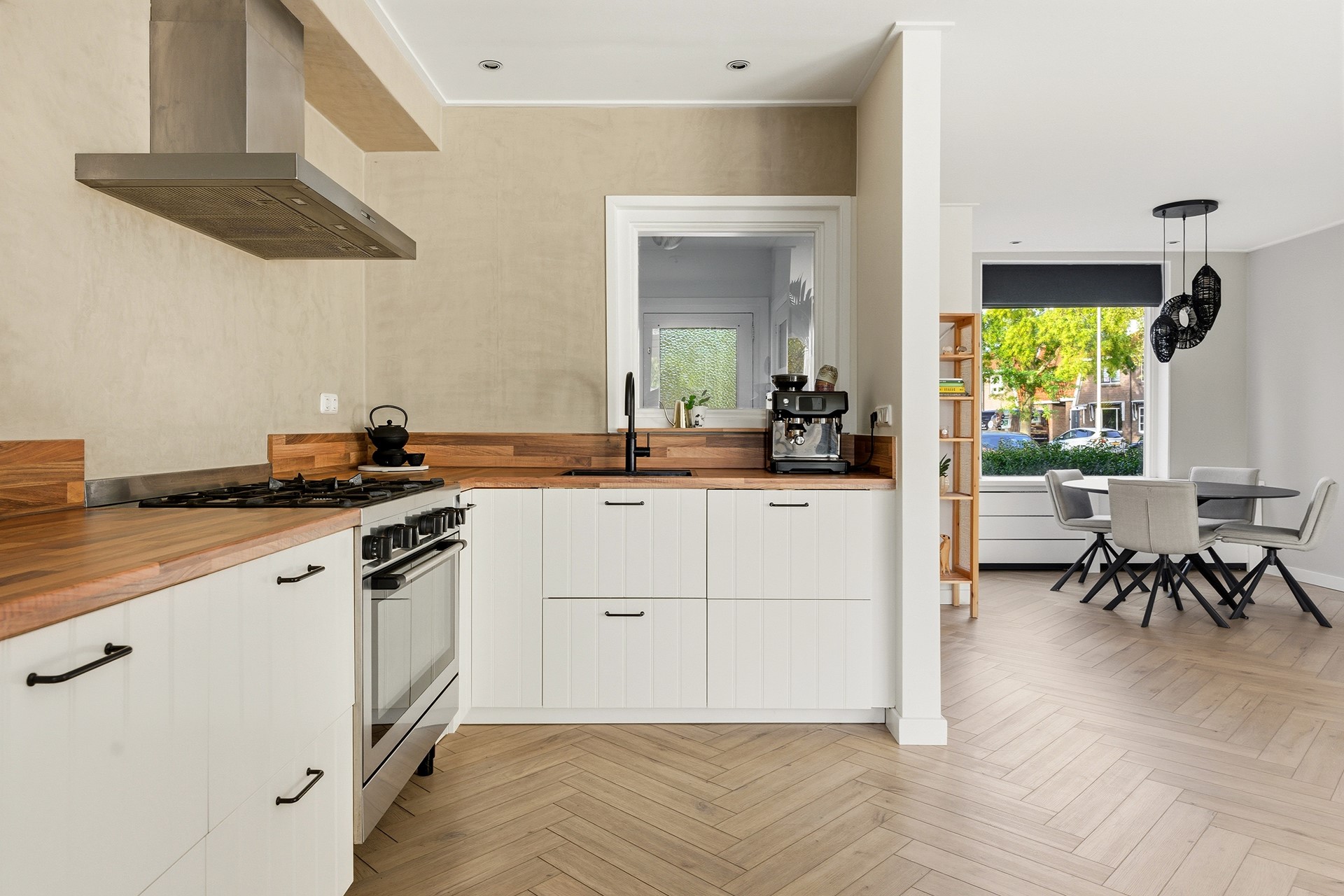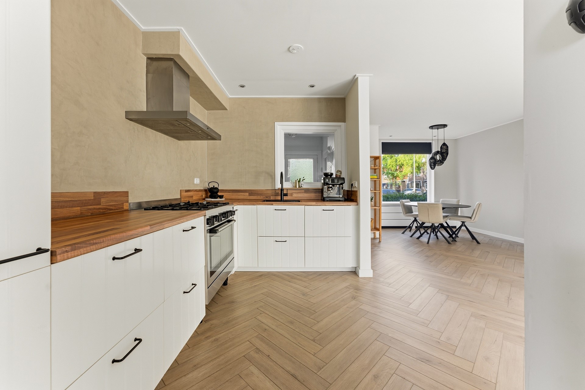 Keuken: De open keuken vormt een mooi geheel met de woonkamer. De keuken is uitgerust met een 5-pits gasfornuis, afzuigkap, oven, koel-vriescombinatie, Quooker en vaatwasser. Een leuk detail is het raam tussen hal en keuken, dat zorgt voor extra lichtinval. Achter de keuken bevindt zich een praktische bijkeuken, bereikbaar via een stoere schuifdeur. De gehele begane grond is voorzien van vloerverwarming. De ruimte is afgewerkt met PVC-vloer, gestuukte wanden en een gestuukt plafond.