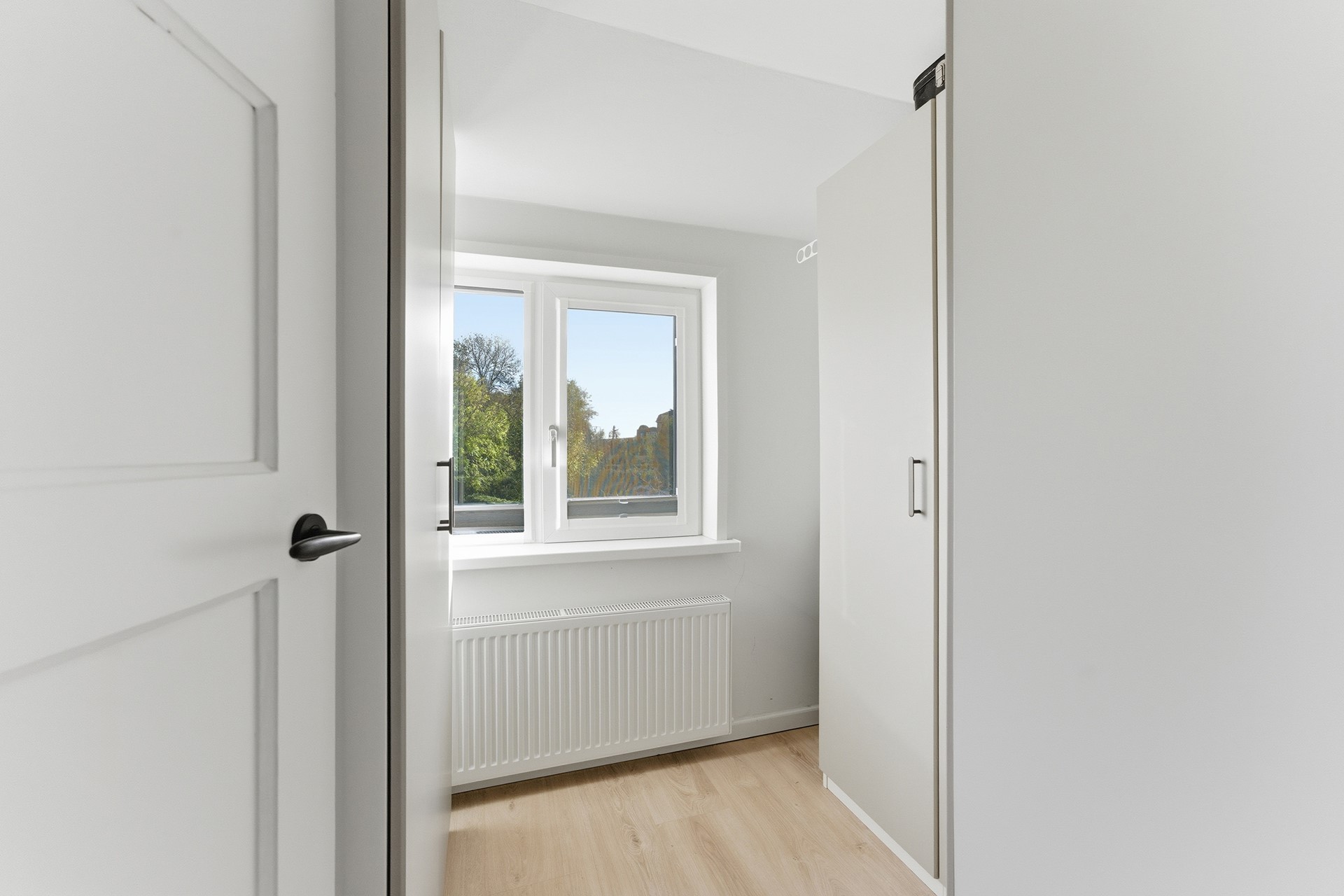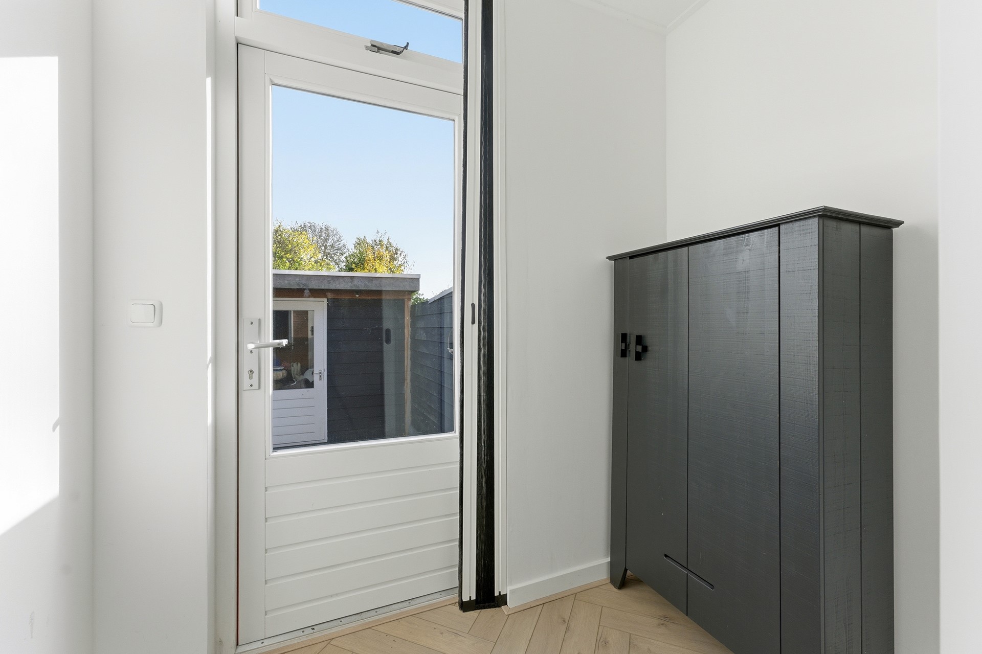 Slaapkamer 3: Leuke, compacte kamer aan de achterzijde. Ideaal als babykamer, werkkamer of inloopkast. De kamer is nu ingericht met kasten. Afgewerkt met laminaatvloer, gestuukte wanden en gestuukt plafond.