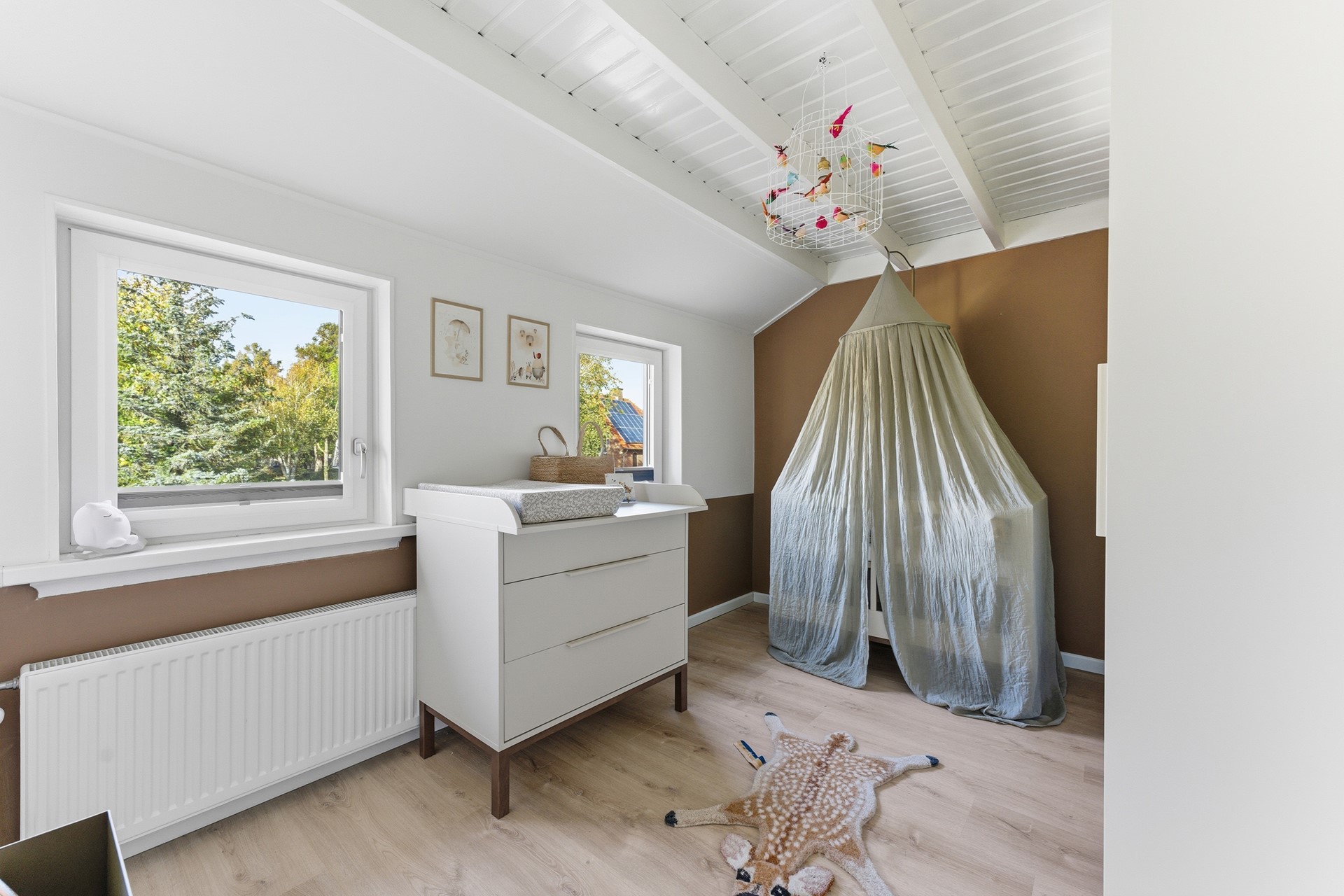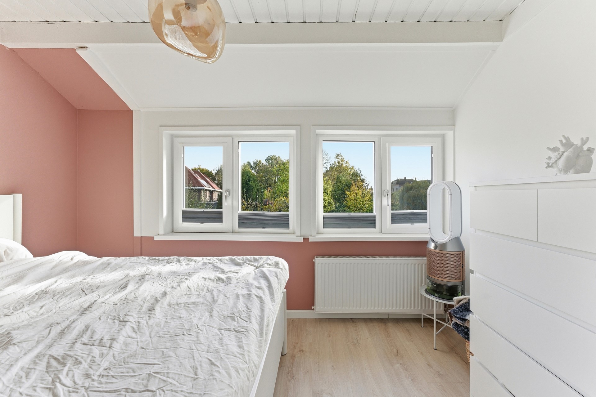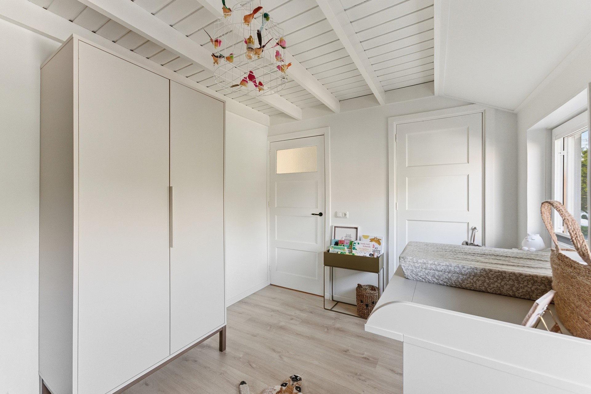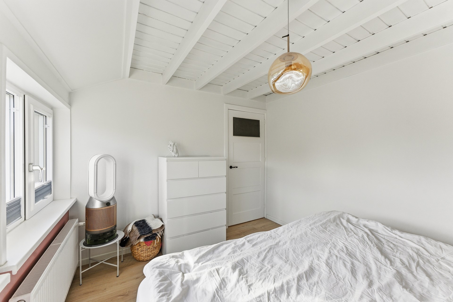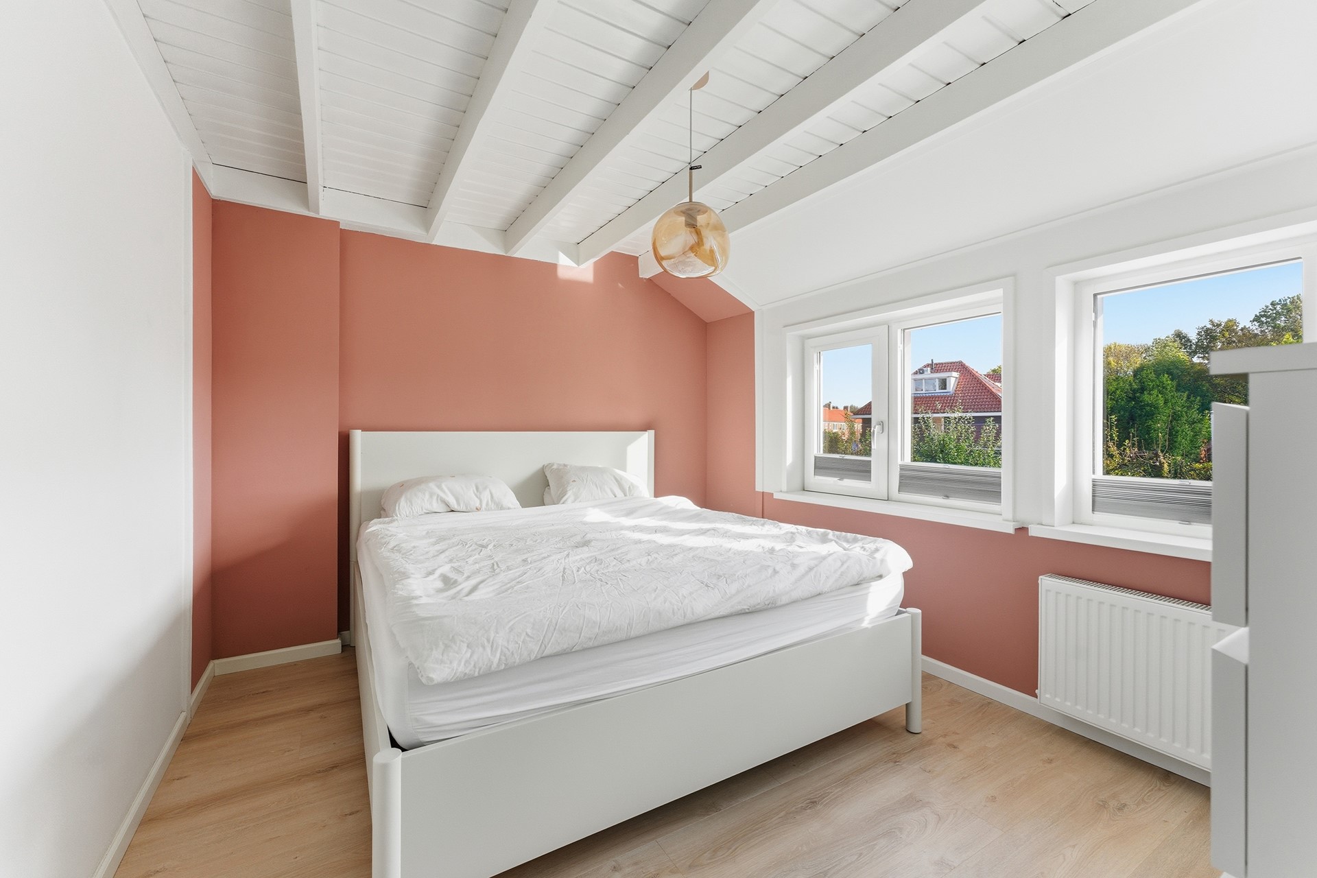 Slaapkamer 2: Ruime slaapkamer aan de achterzijde, momenteel in gebruik als masterbedroom. Ook hier zorgen de balken in het plafond voor extra karakter. Vanuit het raam kijk je vrij weg in het groen, wat zorgt voor een heerlijk rustgevend gevoel. De ruimte is afgewerkt met laminaatvloer, gestuukte wanden en balkenplafond.