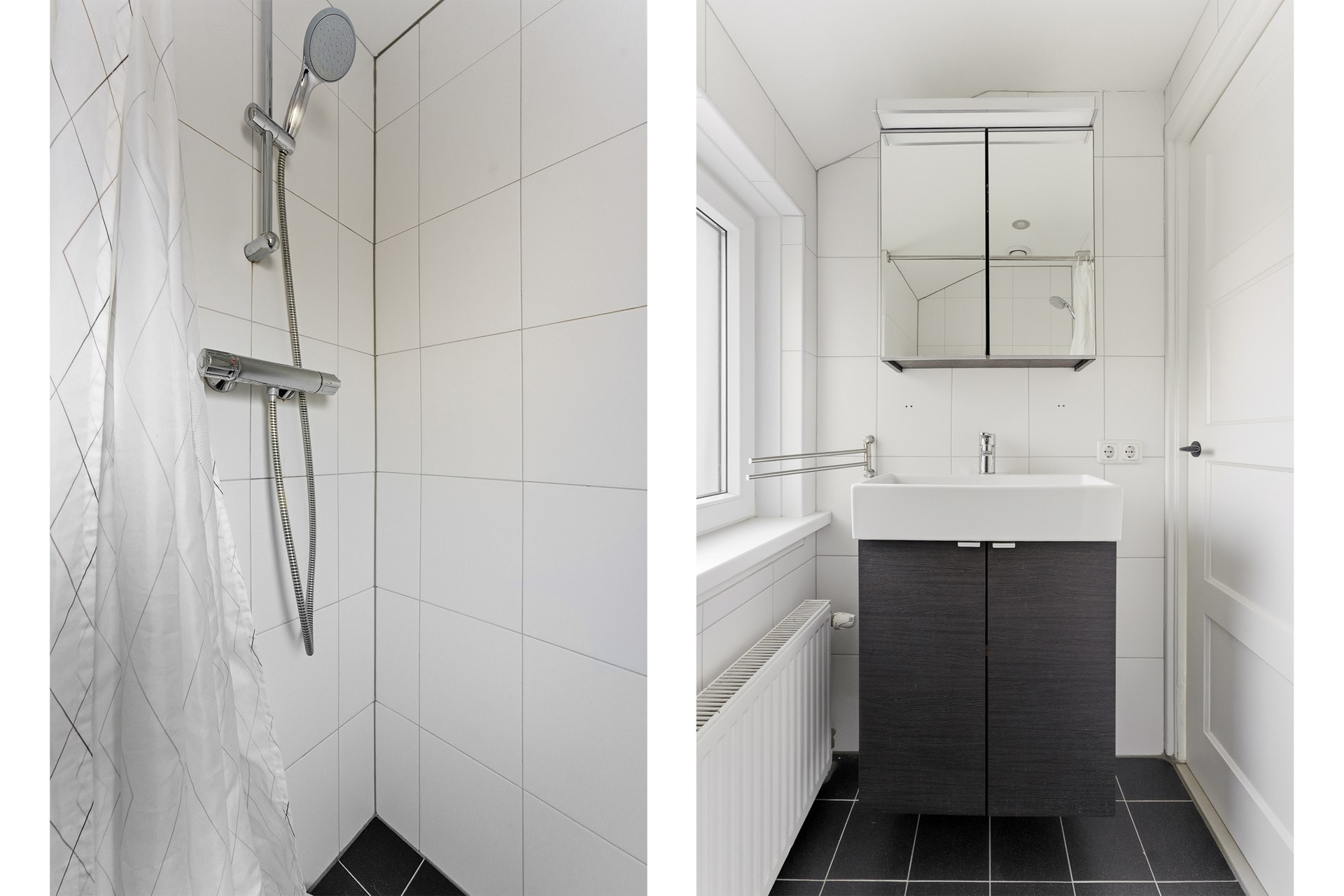Badkamer: Knusse, volledig betegelde badkamer in neutrale kleuren. Voorzien van een inloopdouche, meubel met geïntegreerde wastafel en mechanische ventilatie. Het raam zorgt voor lichtinval en extra ventilatie. De ruimte is afgewerkt met nette tegels en kunststof kozijnen met dubbel glas.