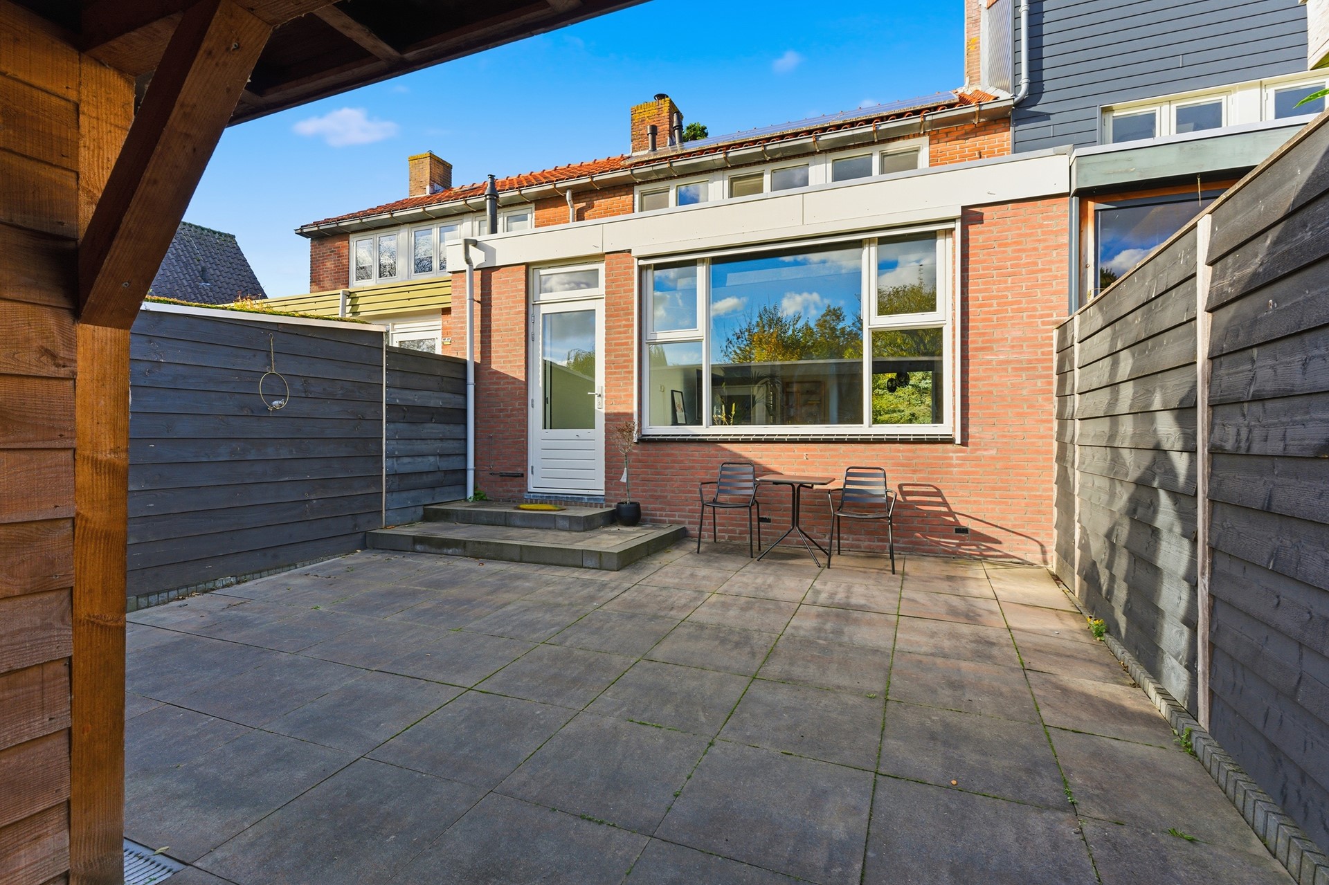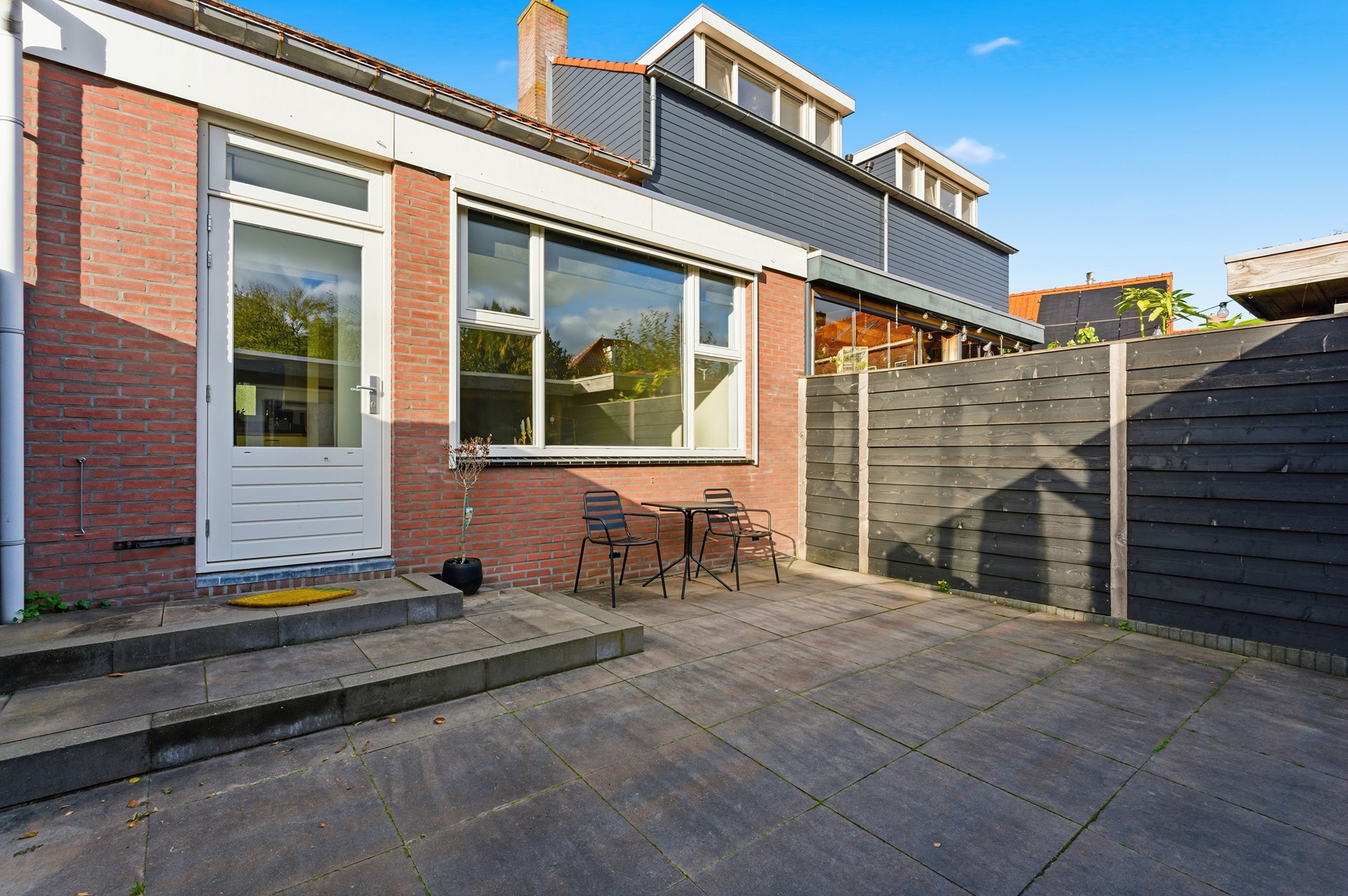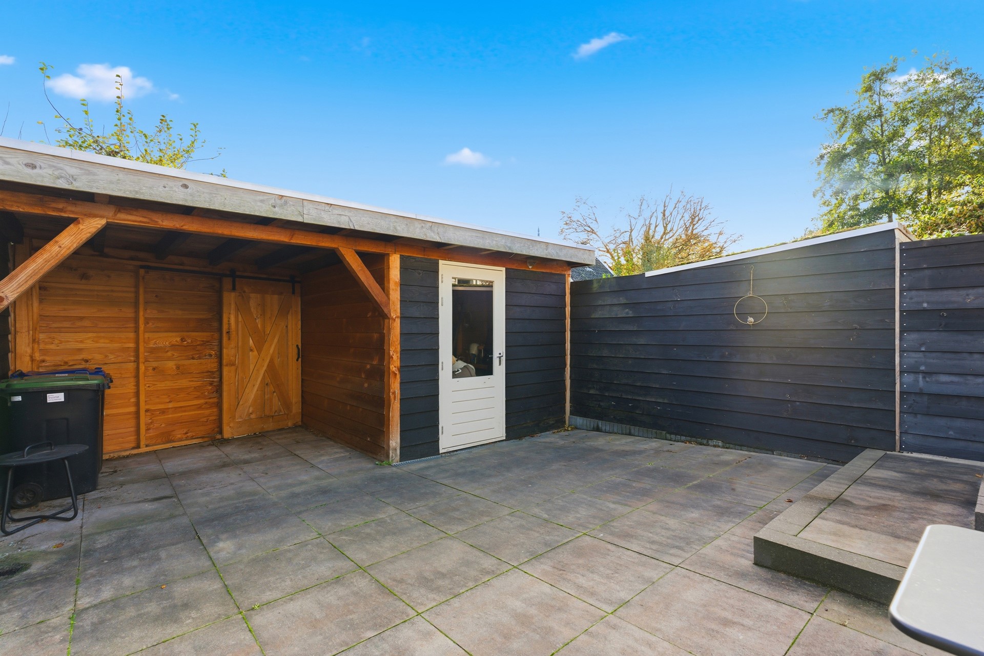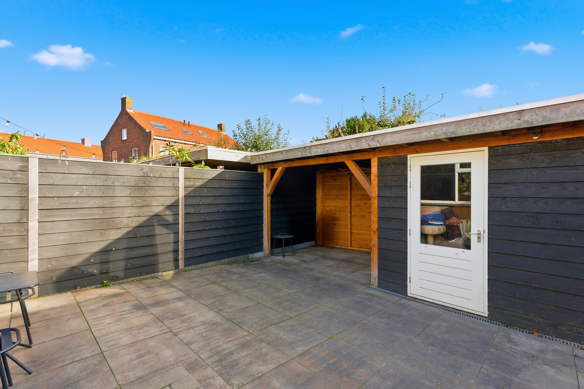 Achtertuin: De achtertuin (ca. 7,6 x 5,95 m) ligt op het zuidoosten en is netjes aangelegd met bestrating. Hier geniet je de hele dag van de zon. De schuur met veranda zorgen voor extra sfeer en beschutting. De tuin is omsloten met een gepotdekselde schutting en voorzien van een screen aan de achterzijde.