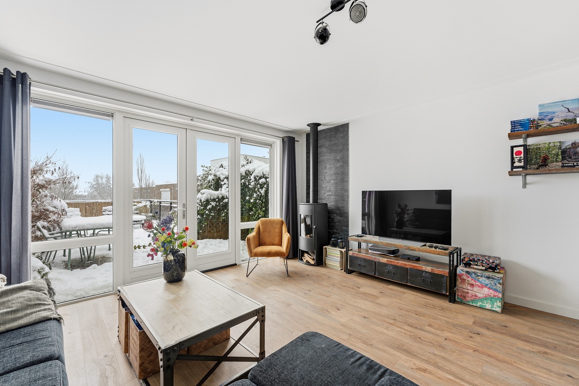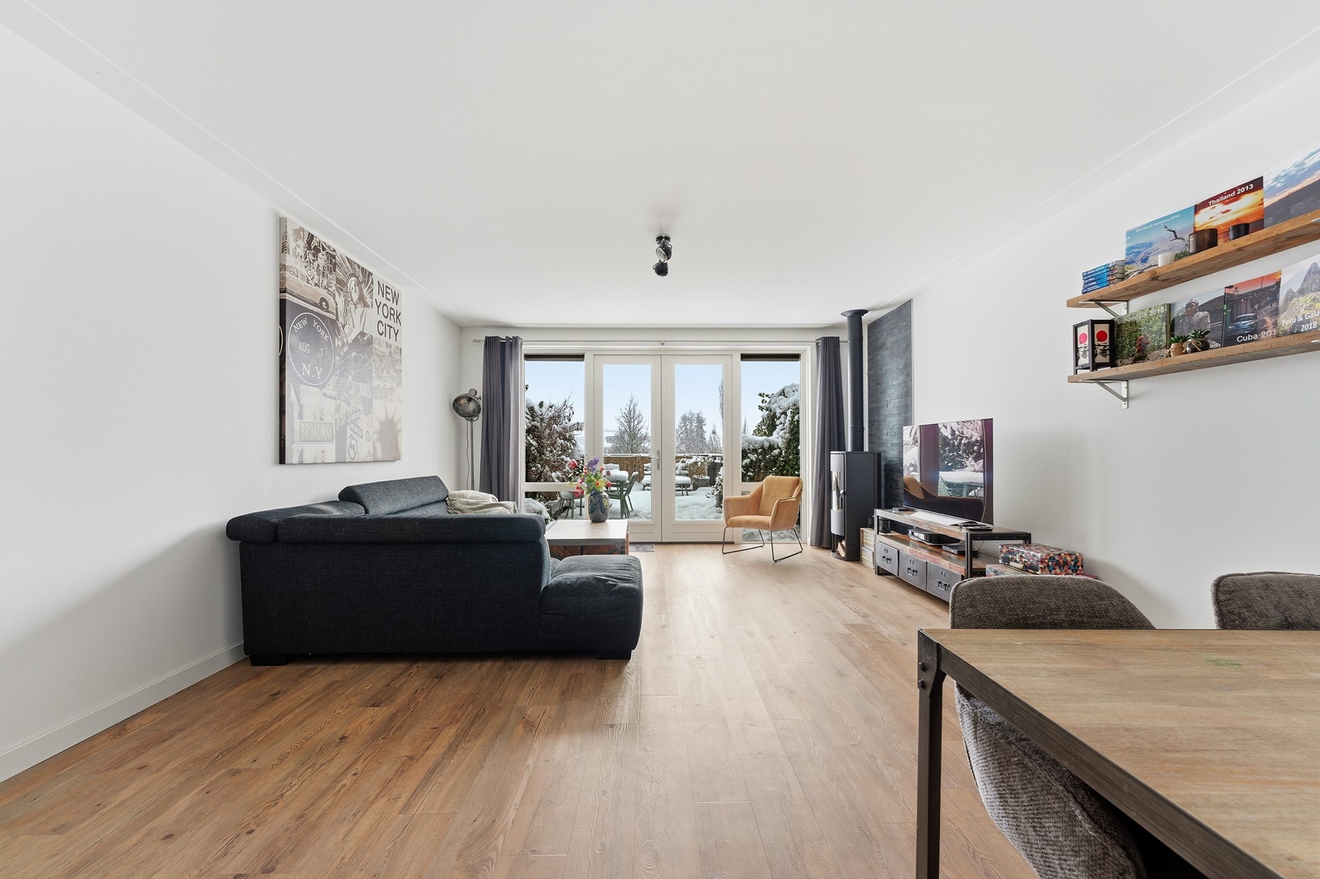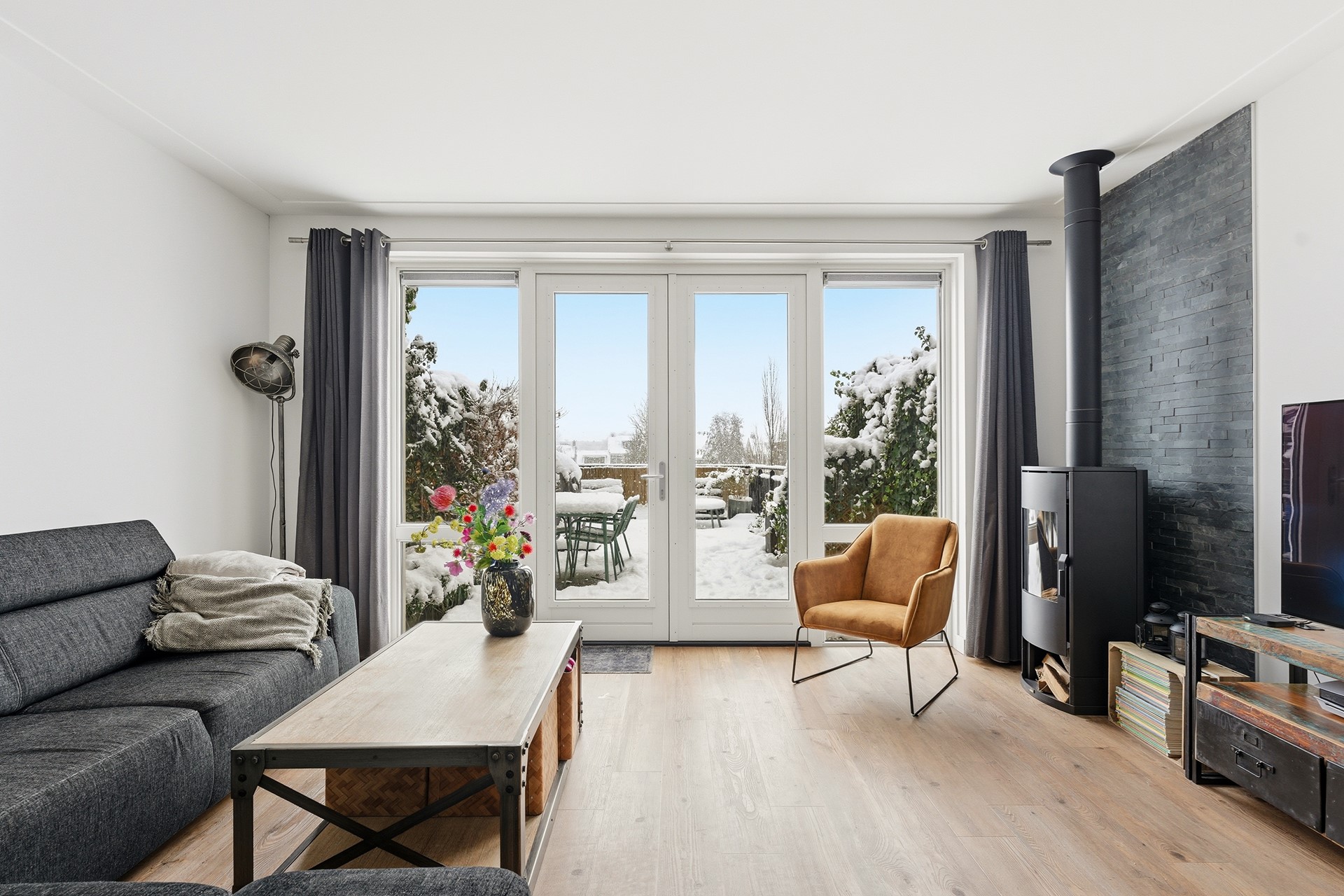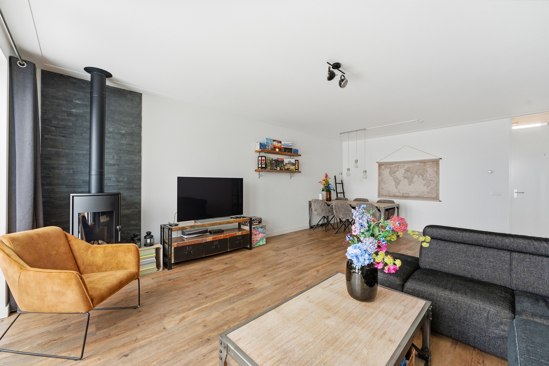 Woonkamer: De woonkamer ligt een trapje lager dan de hal en wordt overspoeld door natuurlijk licht dankzij de grote glazen pui die uitkijkt op de tuin. Hier staat een sfeervolle gashaard en de vloerverwarming zorgt voor extra comfort. Door de split levels krijgen de ruimtes een ruimtelijk en speels gevoel. Vanuit de woonkamer stap je zo de tuin in, waardoor binnen en buiten naadloos in elkaar overlopen.