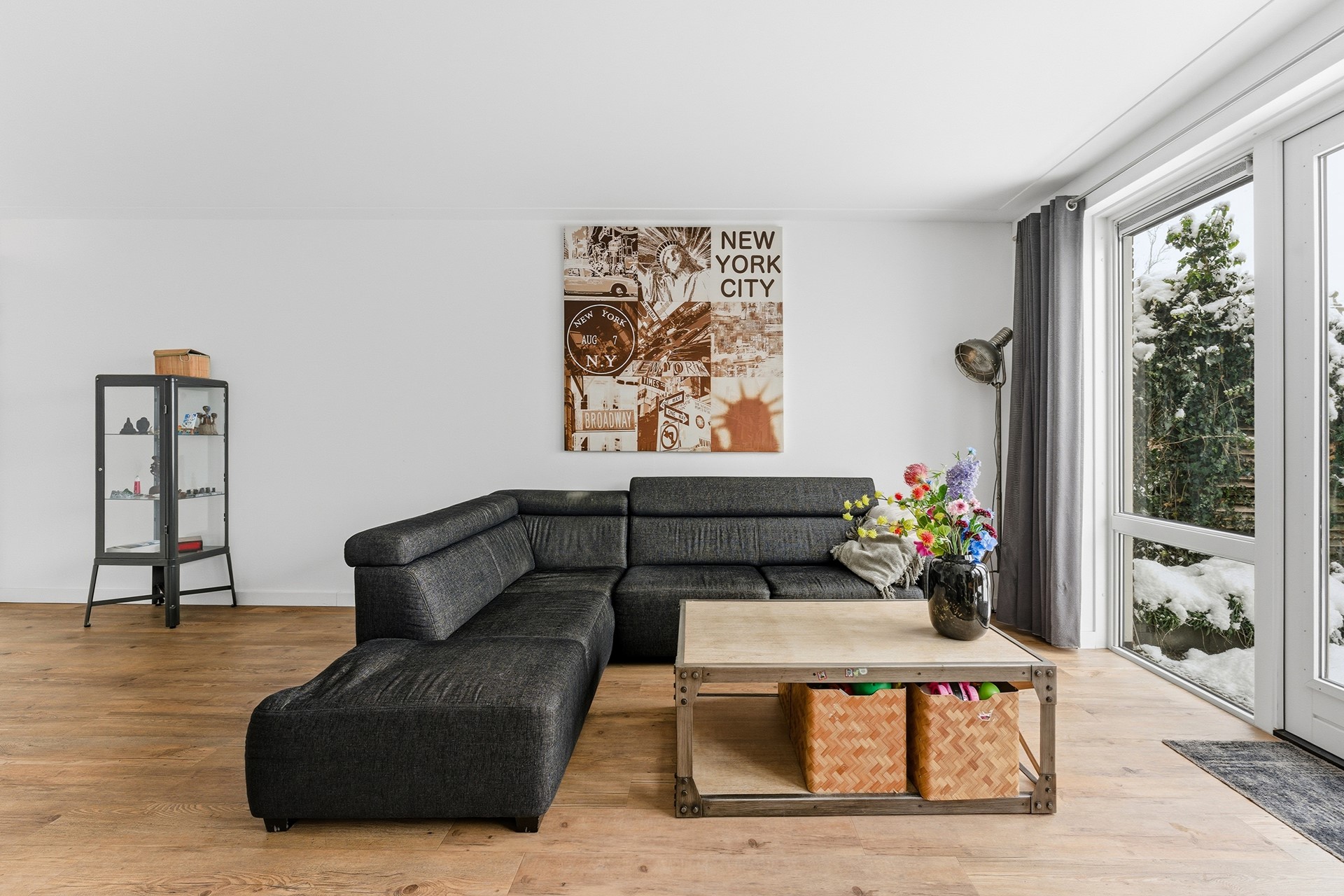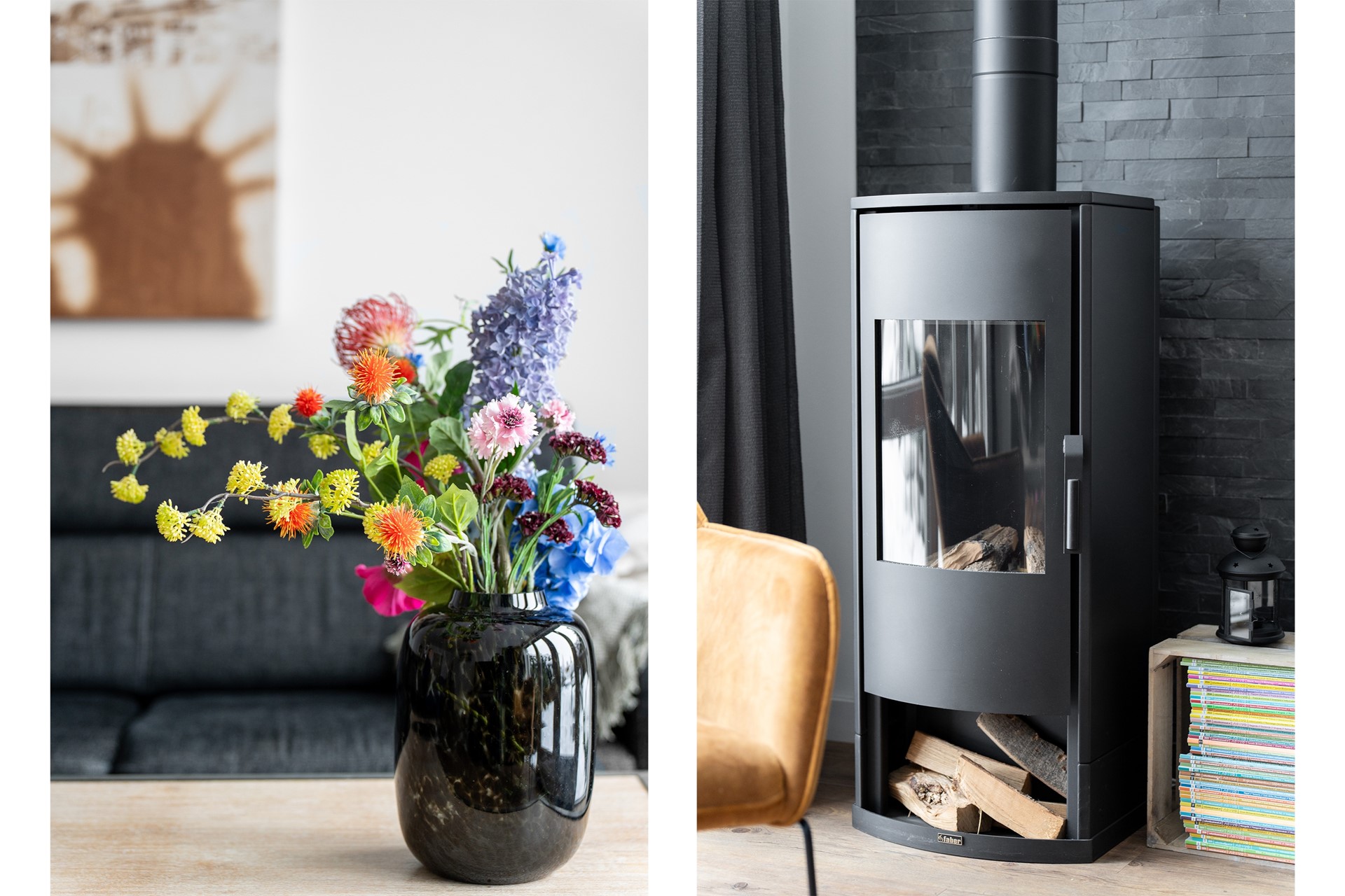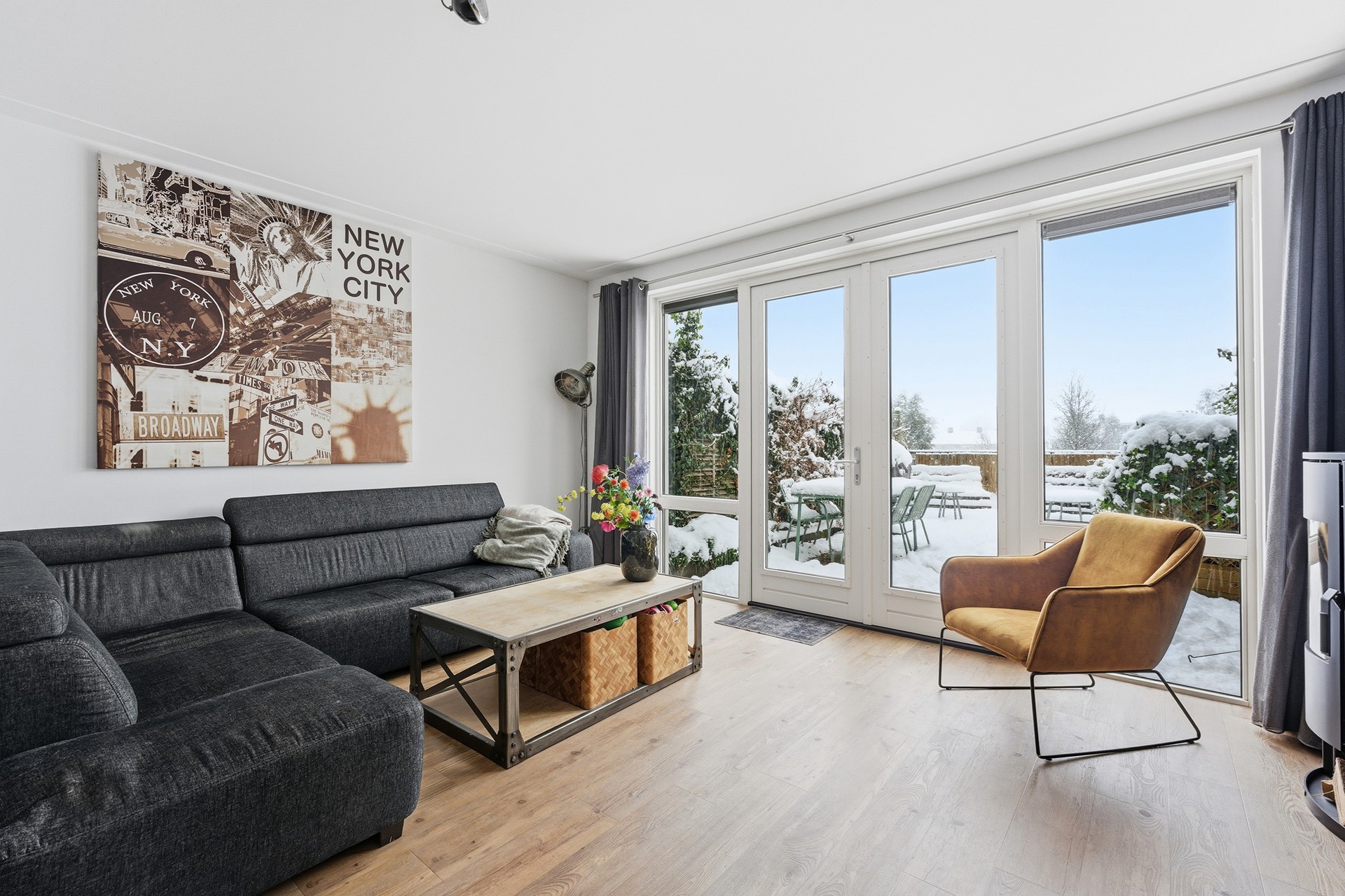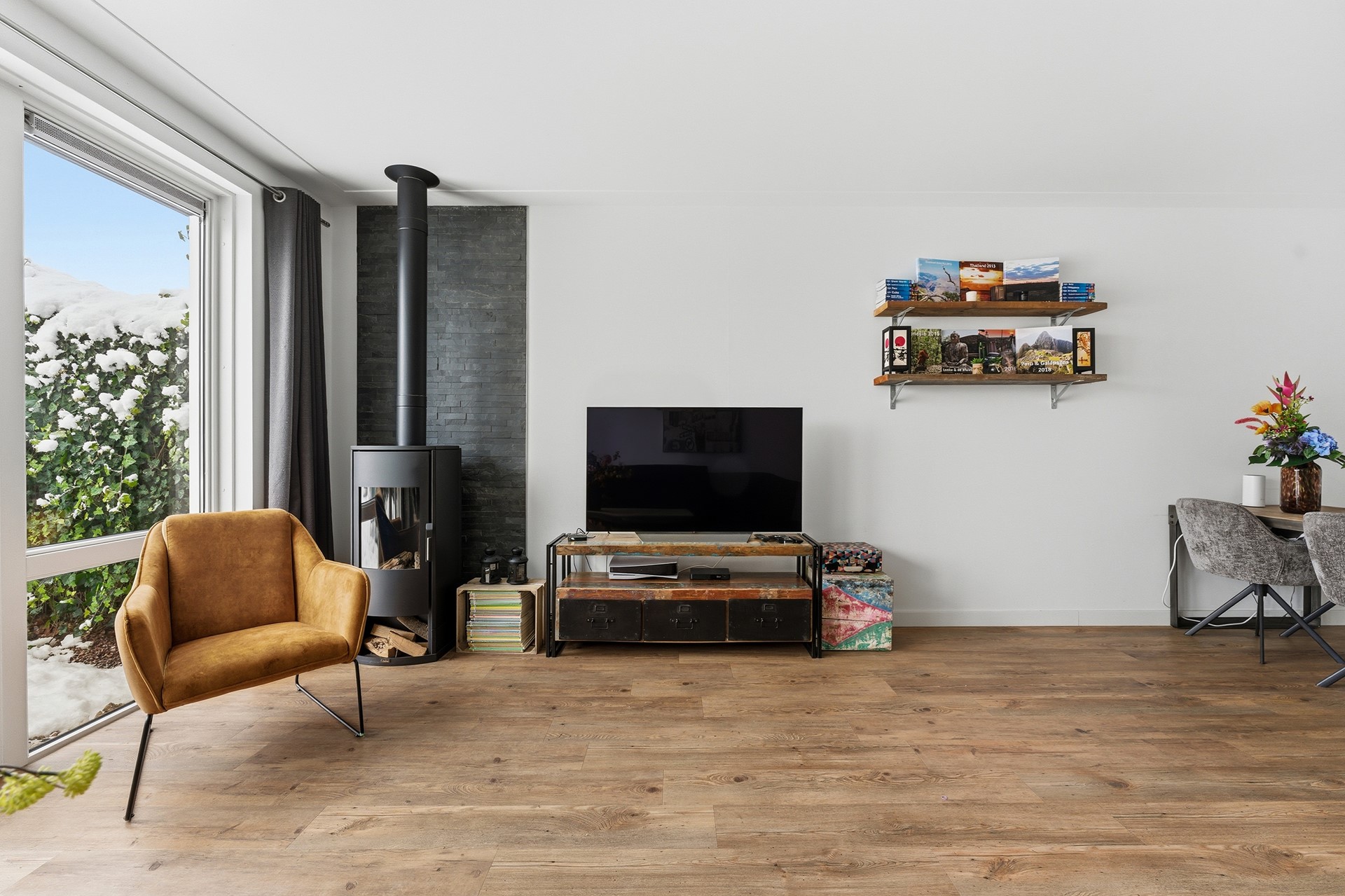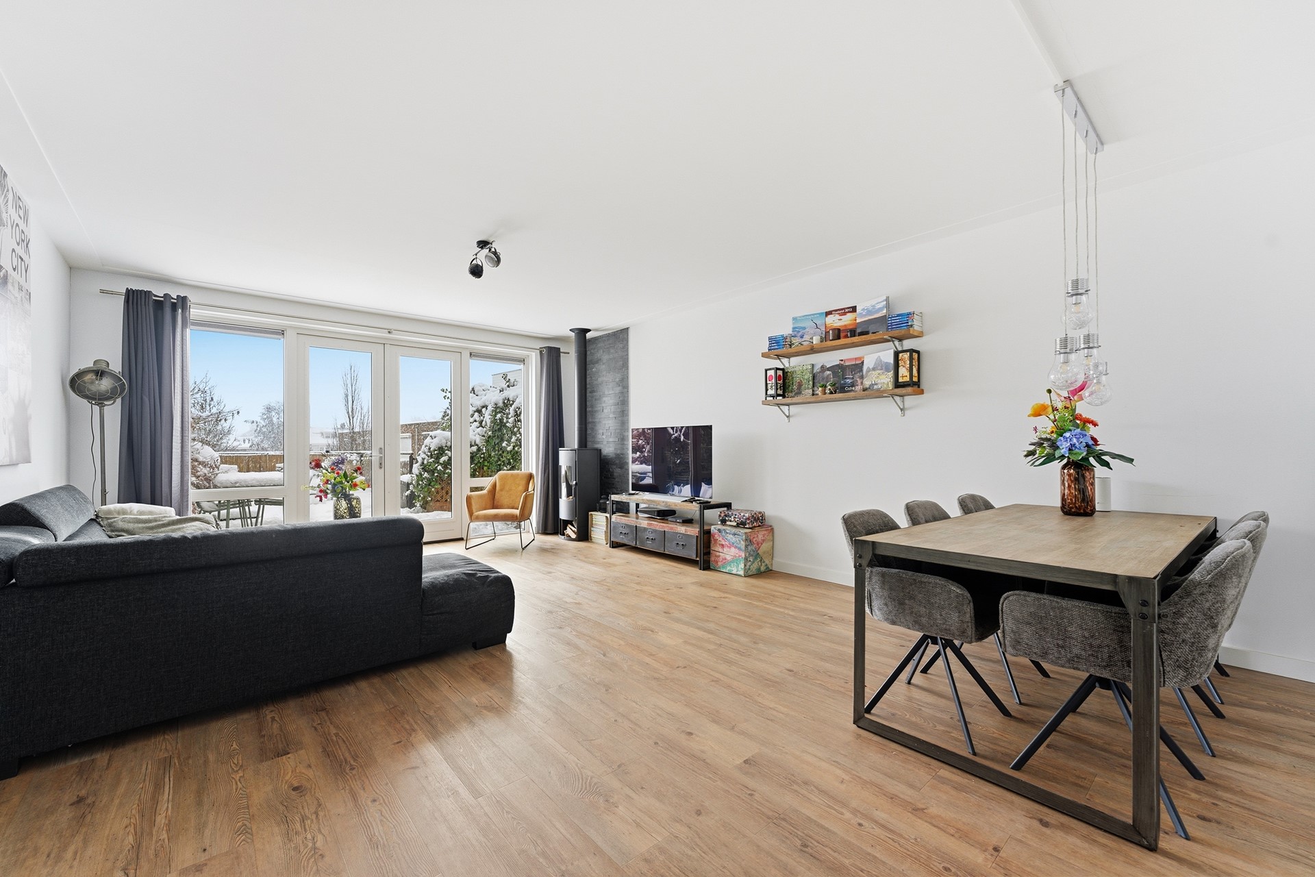 Woonkamer: De woonkamer ligt een trapje lager dan de hal en wordt overspoeld door natuurlijk licht dankzij de grote glazen pui die uitkijkt op de tuin. Hier staat een sfeervolle gashaard en de vloerverwarming zorgt voor extra comfort. Door de split levels krijgen de ruimtes een ruimtelijk en speels gevoel. Vanuit de woonkamer stap je zo de tuin in, waardoor binnen en buiten naadloos in elkaar overlopen.