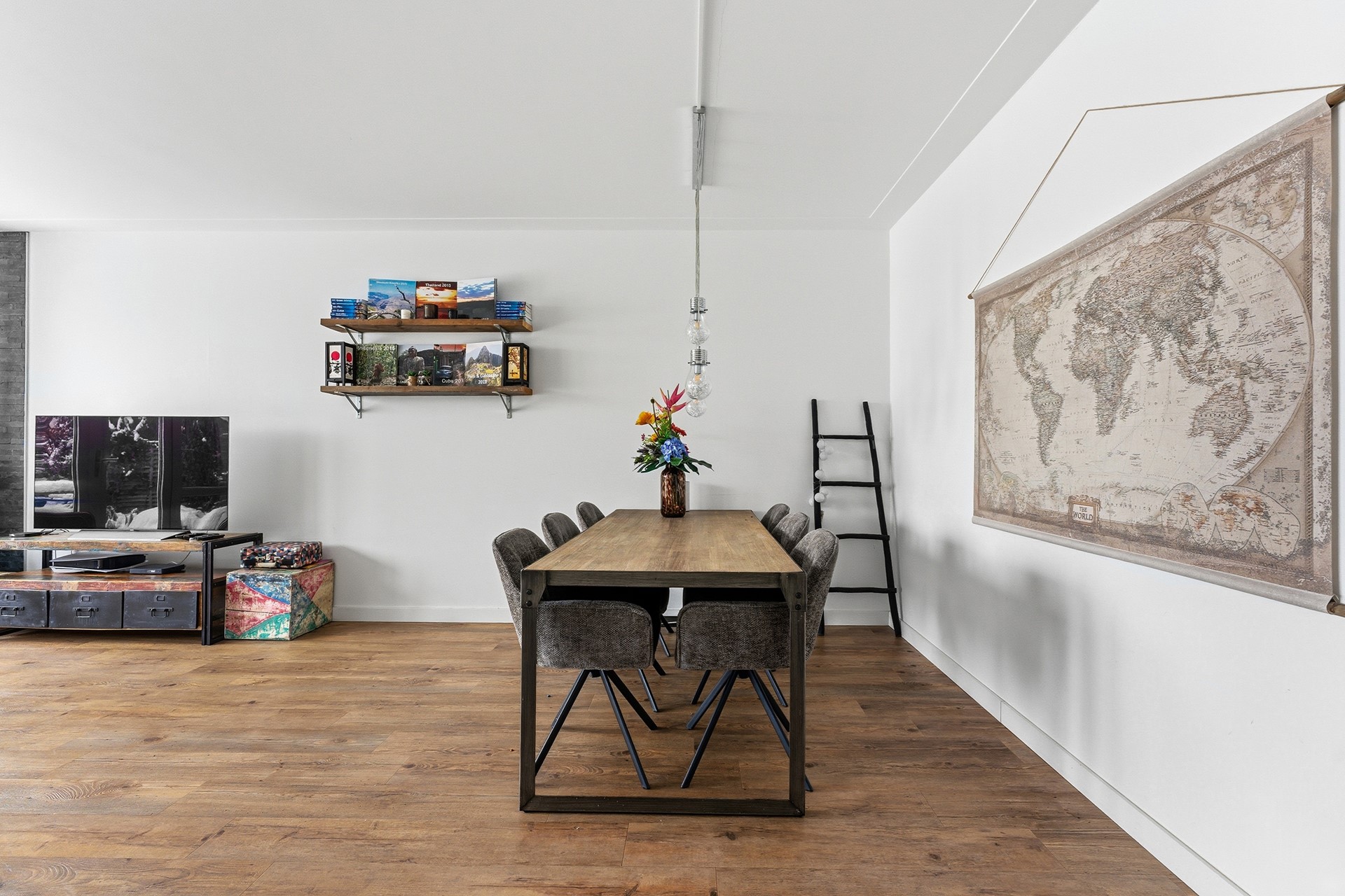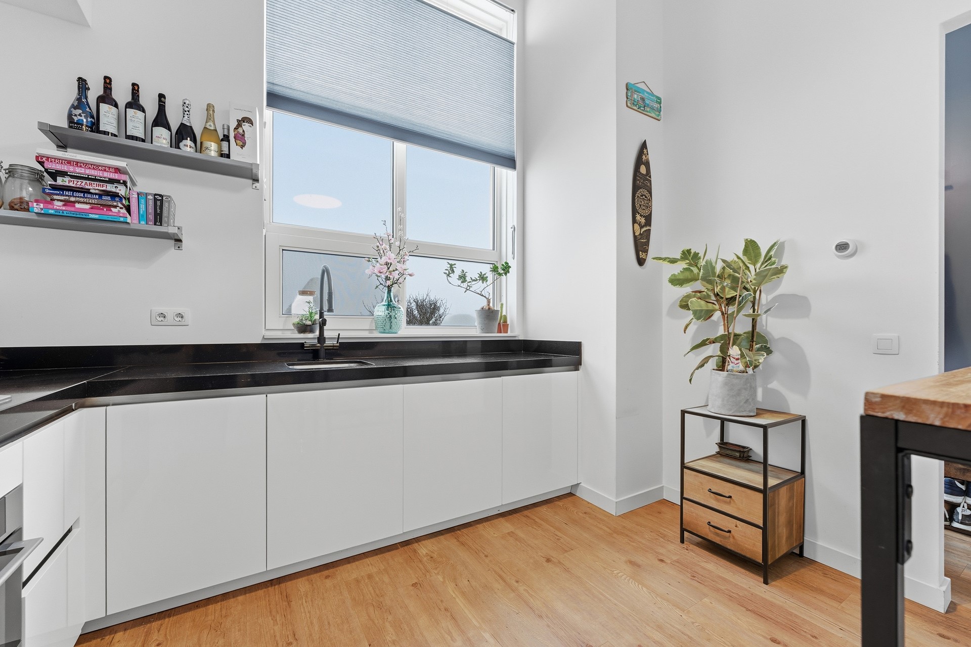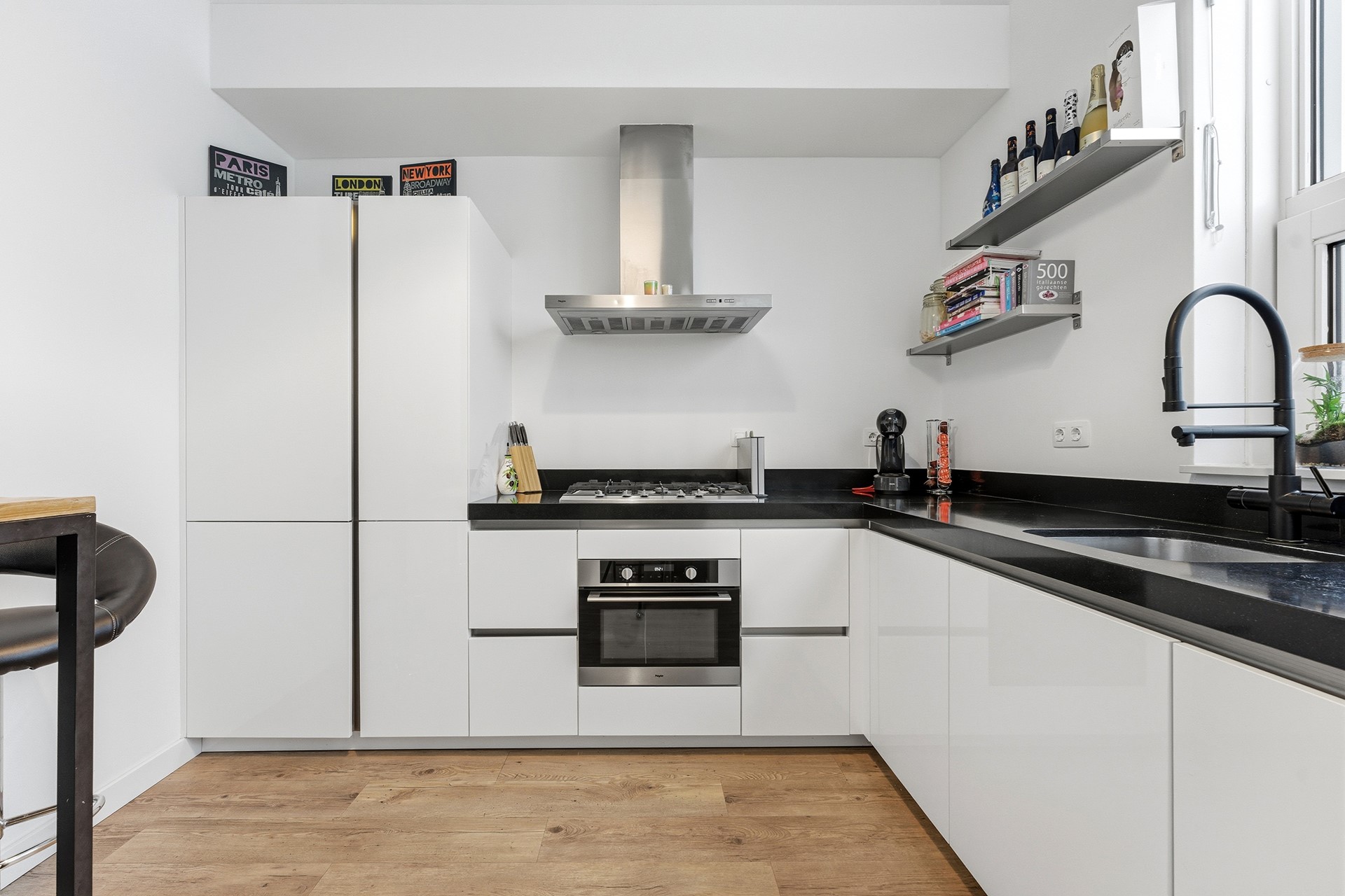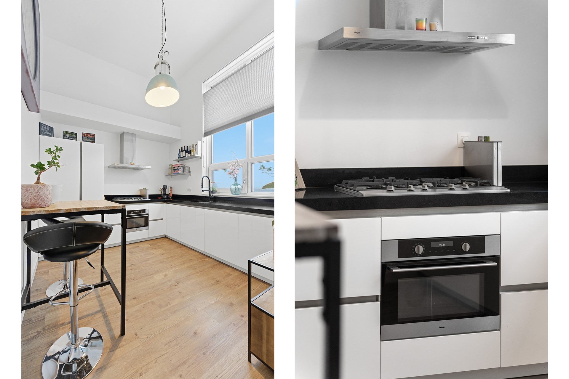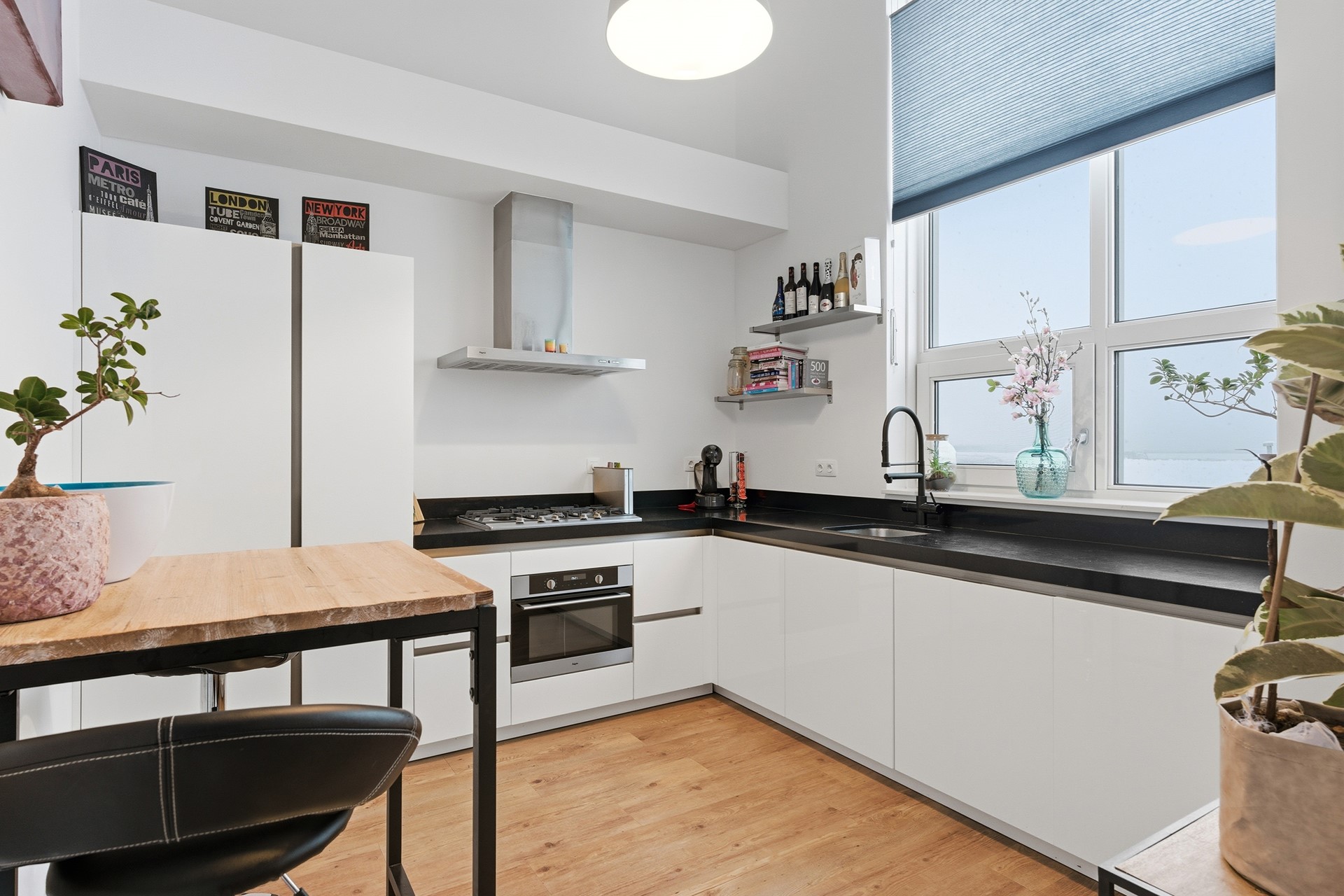 Keuken: De deels open keuken is hoog en ruim opgezet, met plek voor een gezellige hoge (bar)tafel. Je vindt hier alle moderne voorzieningen: een oven, een 5-pits gasstel met afzuigkap, kokend waterkraan, een koel-/vriescombinatie en een vaatwasser. Tijdens het koken heb je een prachtig uitzicht over de rivier de Noord en het voorbijvarende verkeer. De slimme indeling biedt veel werkruimte en dankzij de grote ramen valt er volop natuurlijk licht naar binnen, wat het koken nog prettiger maakt.