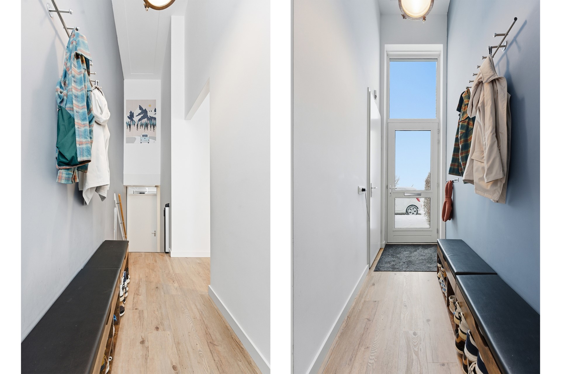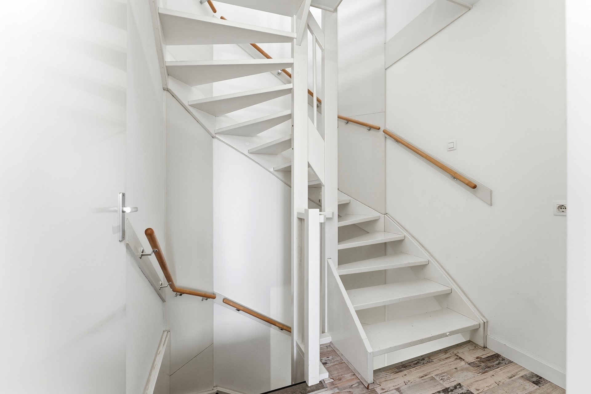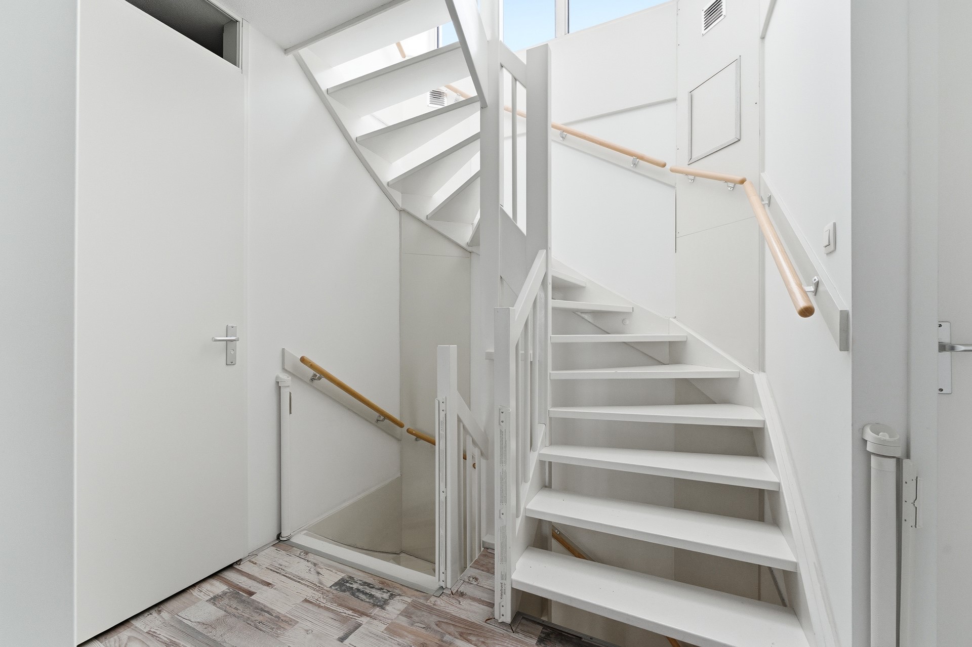 Entree: Via de hal op dijkniveau betreed je de woning. De ruimte heeft een zeer hoog plafond, wat direct een gevoel van openheid geeft. Vanuit de hal heb je toegang tot de keuken, de trap naar de woonkamer en de meterkast. De hal biedt voldoende ruimte voor een garderobe en is netjes afgewerkt met gestuukte wanden en plafond. De PVC-vloer met vloerverwarming ligt in de gehele woning.