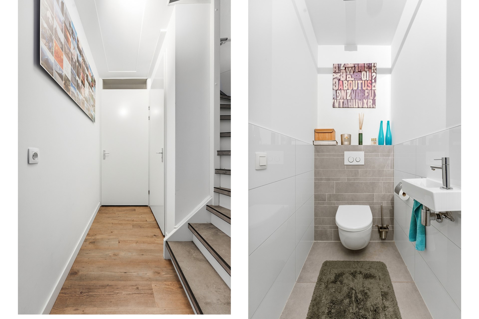 Toilet: De keurige toiletruimte is deels betegeld en voorzien van een zwevend toilet, fonteintje en mechanische ventilatie.