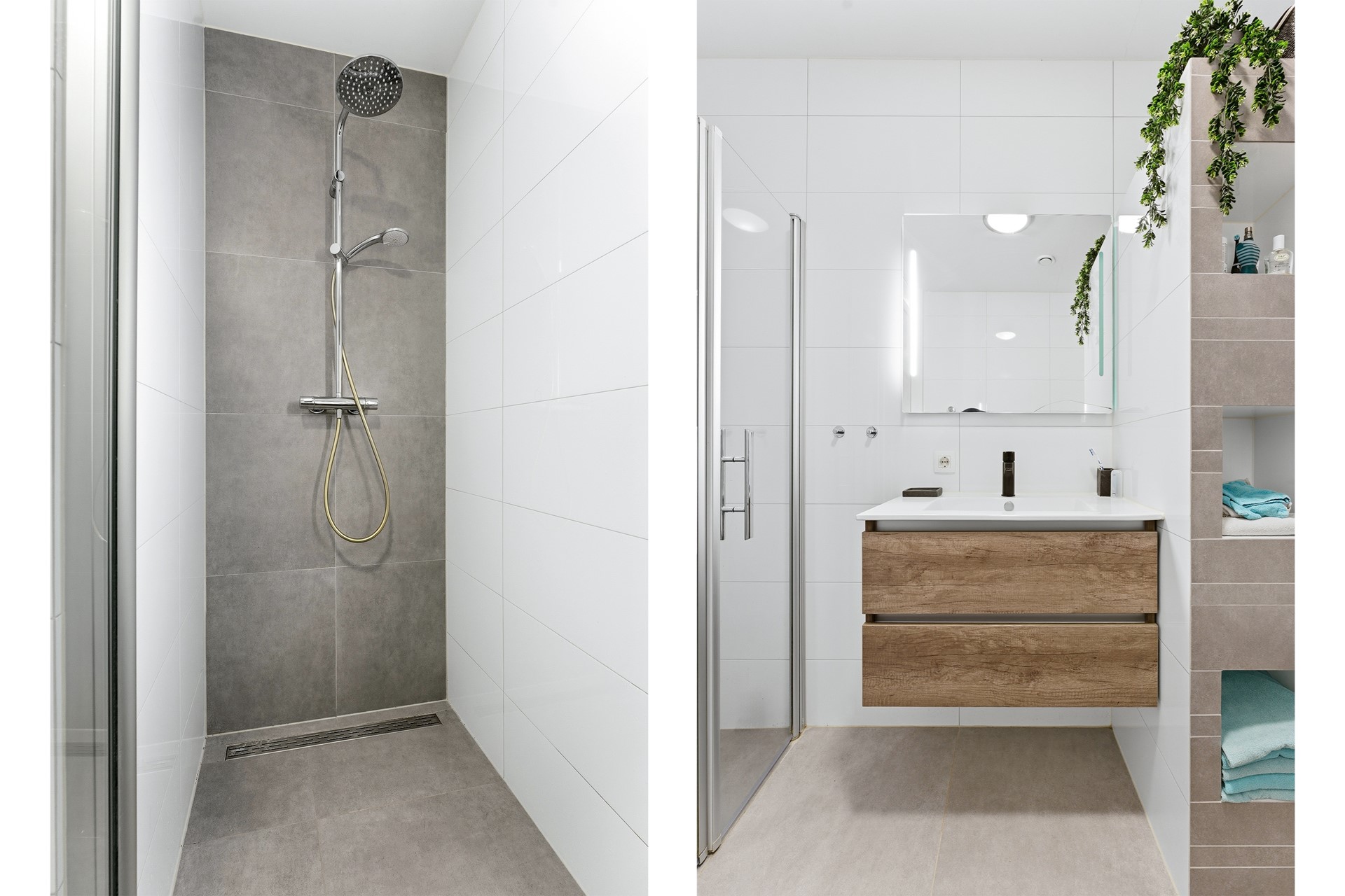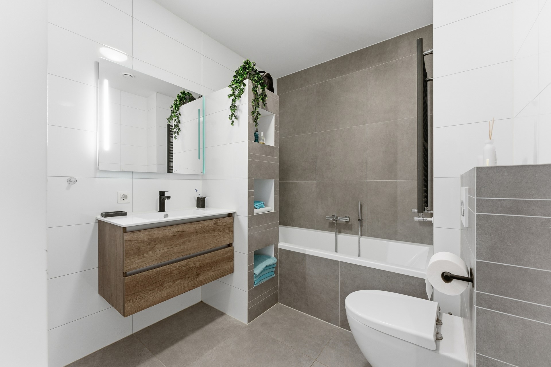 Badkamer 1: De keurige, inpandige badkamer is volledig betegeld en beschikt over een ligbad, douchecabine, toilet, designradiator en mechanische ventilatie. Er is voldoende ruimte om comfortabel te baden of douchen, en de handige nisjes bieden praktische opbergruimte voor handdoeken en accessoires.