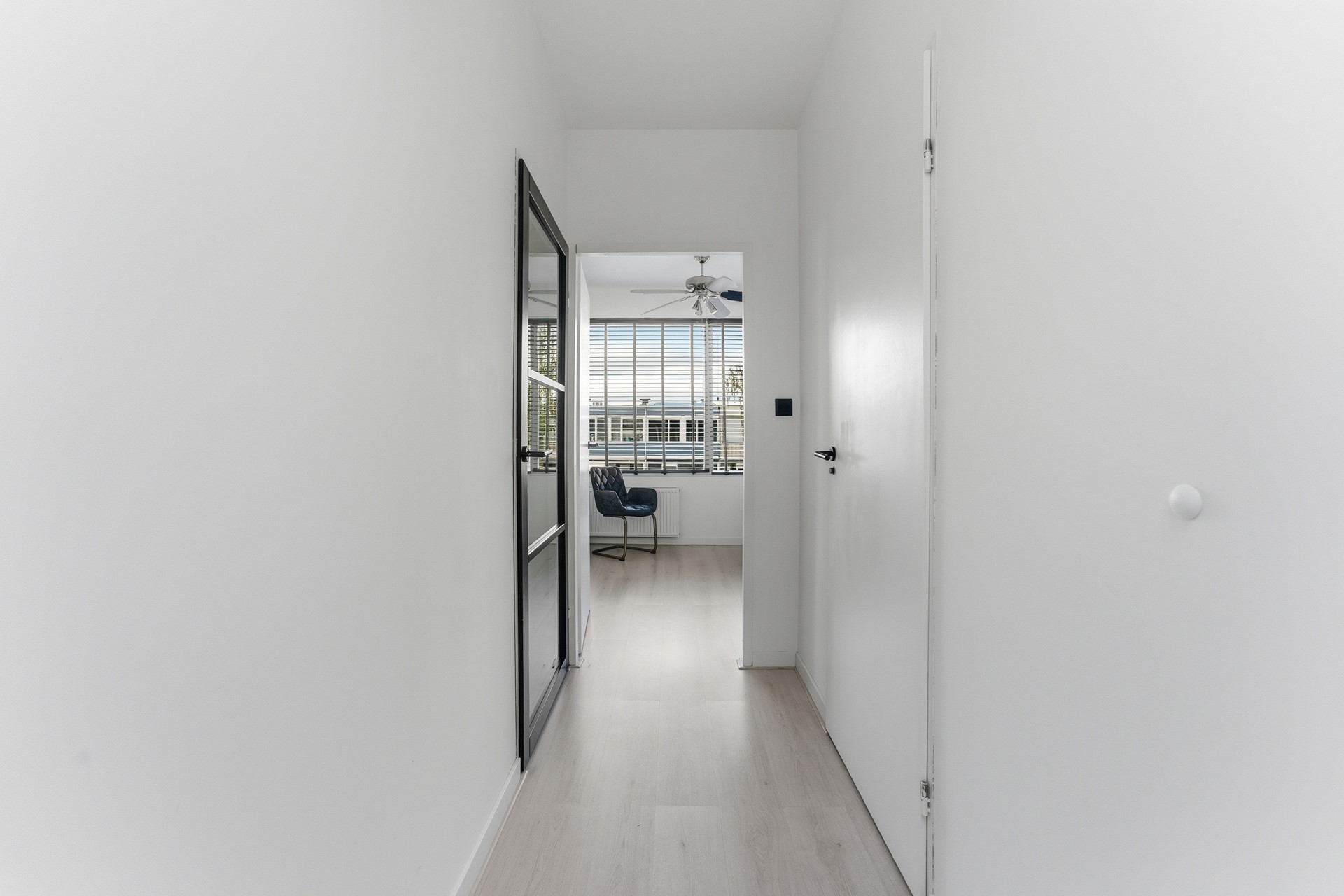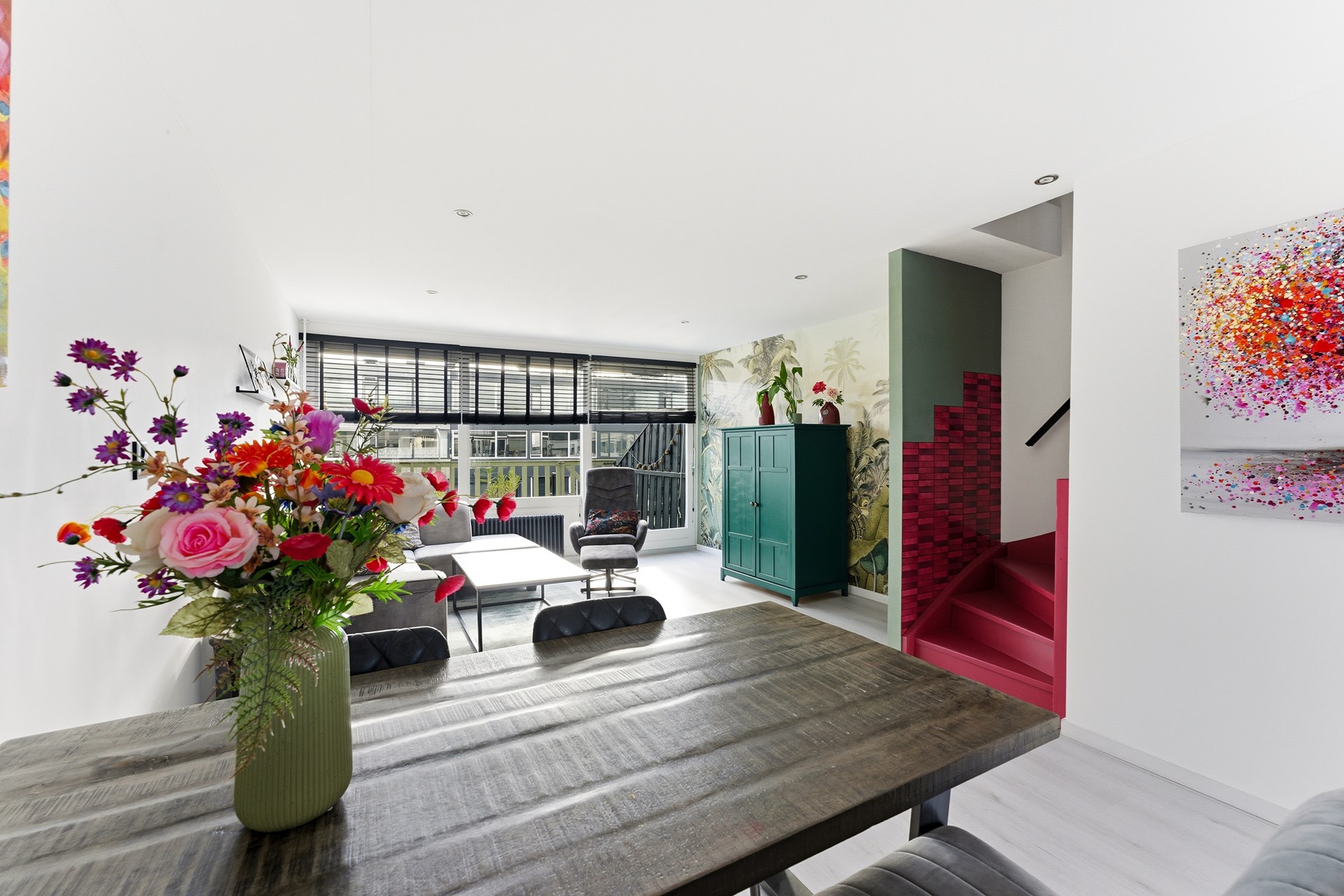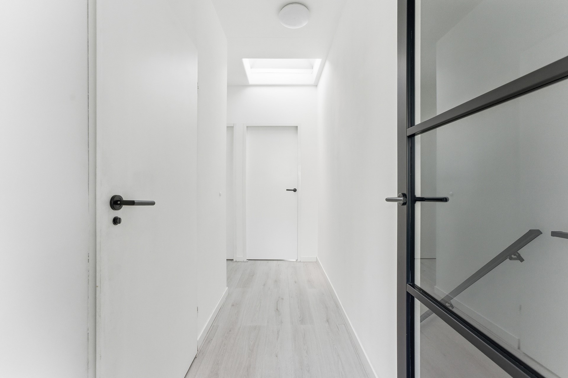 Woonkamer: De ruime woonkamer ligt op de eerste verdieping en biedt veel licht dankzij de grote schuifpui aan de achterzijde. Via deze schuifpui stap je het balkon op, met een trap die leidt naar de tuin. De woonkamer is verzorgd afgewerkt en beschikt over een praktische inbouwkast. De trap naar de tweede verdieping bevindt zich in de woonkamer. De afwerking bestaat uit laminaat, behang en glasvliesbehang, met een gips plafond.