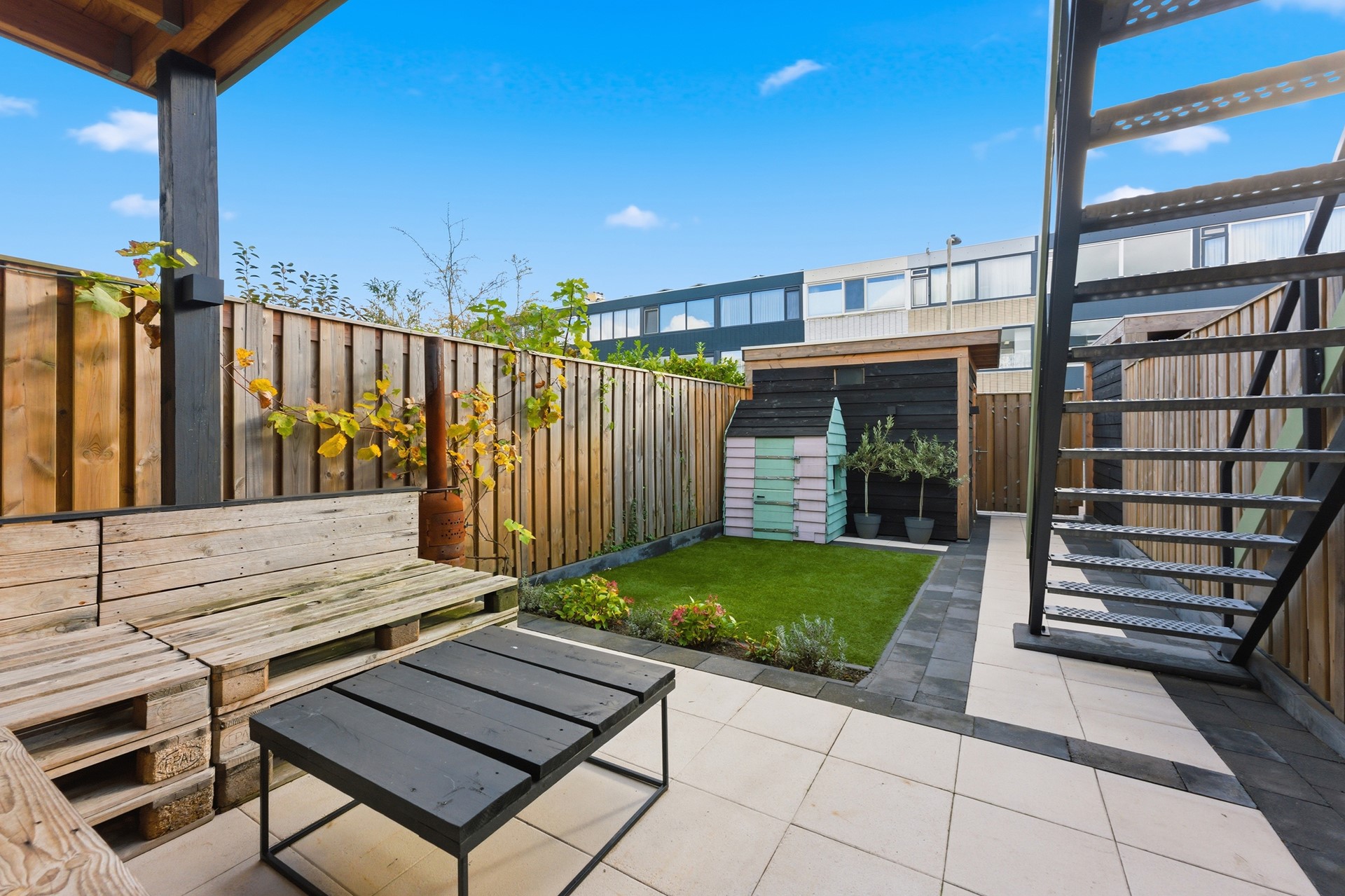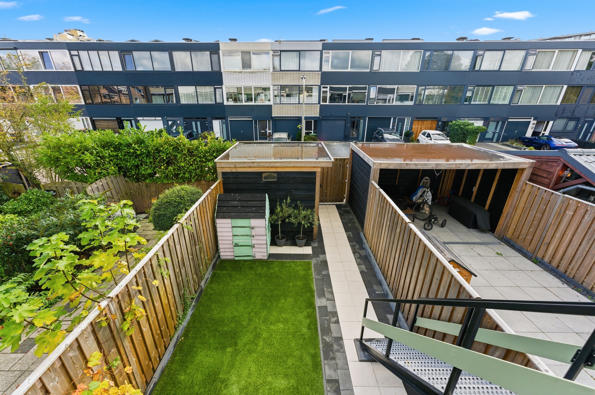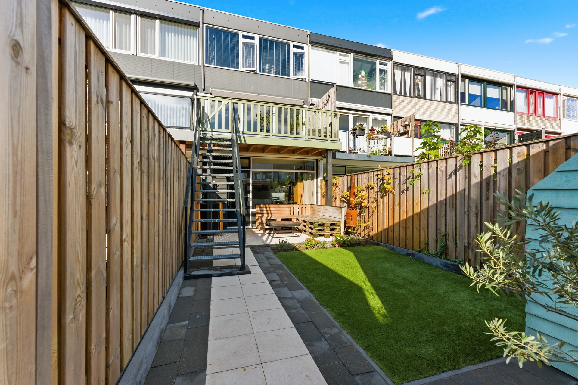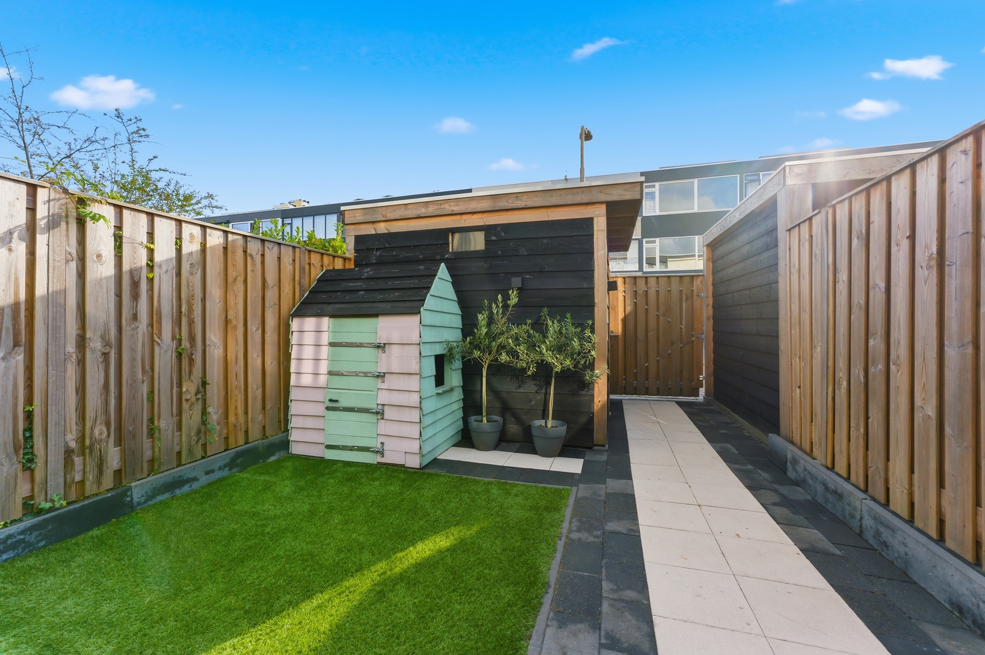 Achtertuin: De verzorgde achtertuin, met een diepte van ruim 11 meter en gelegen op het zuiden, biedt volop zon en ruimte. Er ligt een goed onderhouden gazon, er staat een keurige houten schuur en sfeervolle buitenverlichting maakt de tuin ook ’s avonds aantrekkelijk. Daarnaast is de tuin voorzien van zowel water als elektra aansluiting. Vanuit de tuin is direct toegang tot de multifunctionele ruimte en via een trap bereik je het balkon/terras bij de woonkamer.