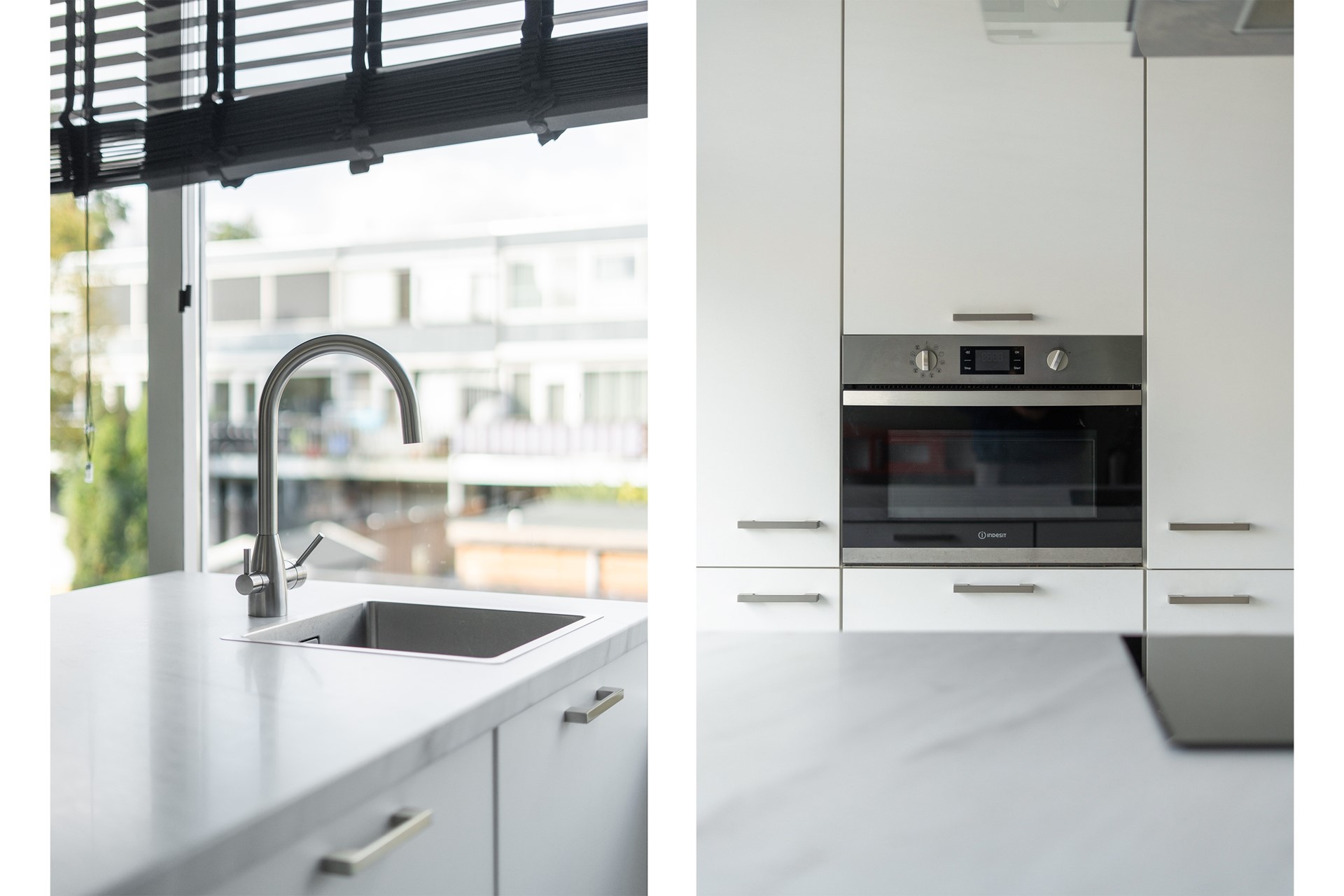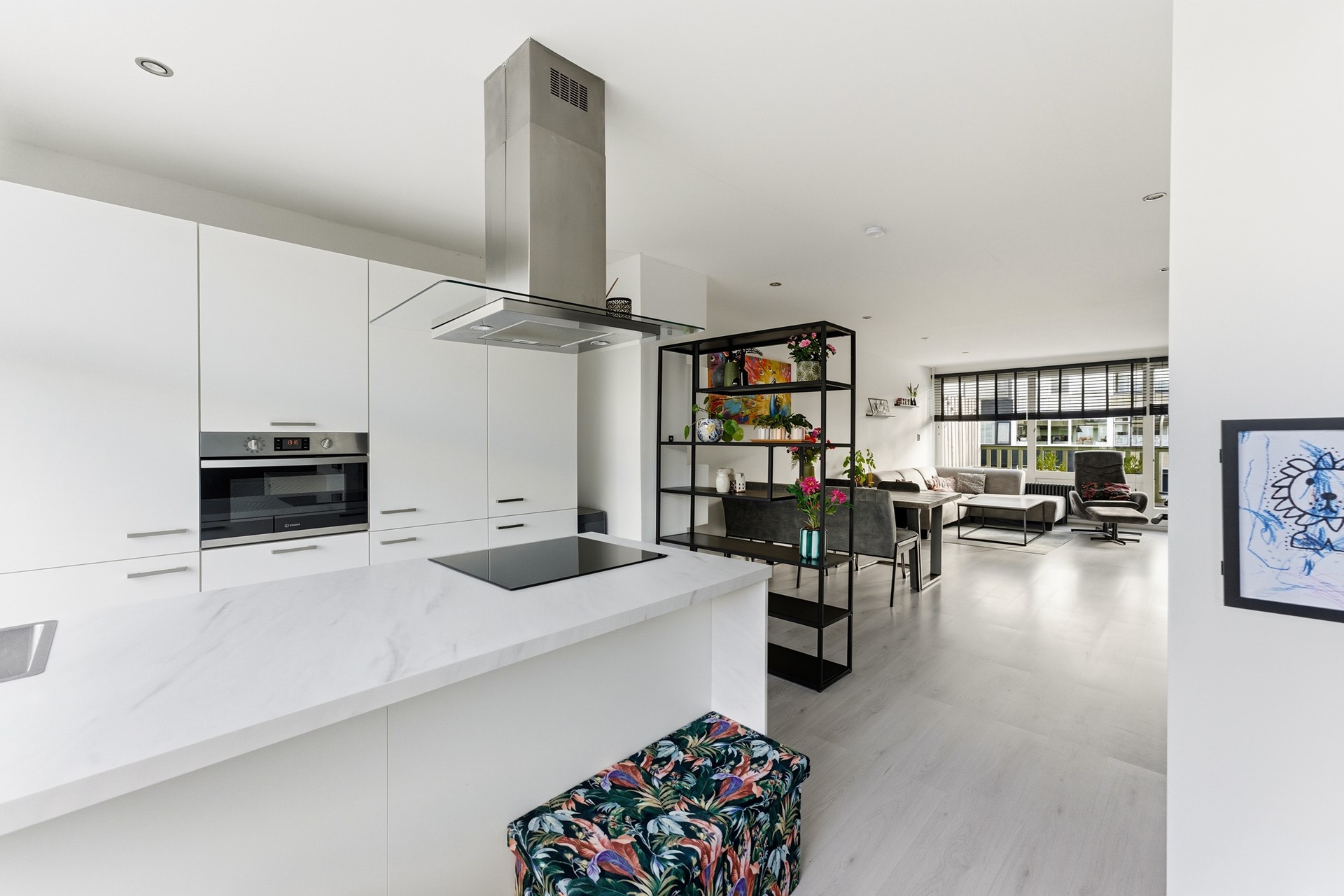Keuken: Aan de voorzijde bevindt zich de open keuken. Deze is modern en netjes uitgevoerd met een oven/magnetroncombinatie, inductiekookplaat, afzuigkap, koel-/vriescombinatie, vaatwasser en waterfilter voor gezuiverd water. Door het raam aan de voorzijde kijk je leuk de straat in. De afwerking is keurig met laminaat, structuur- en glasvliesbehang en een gips plafond.