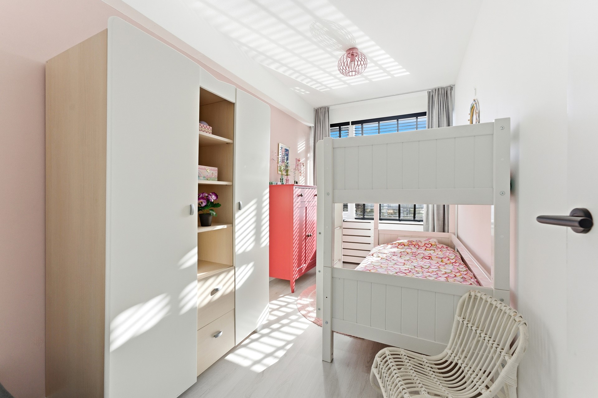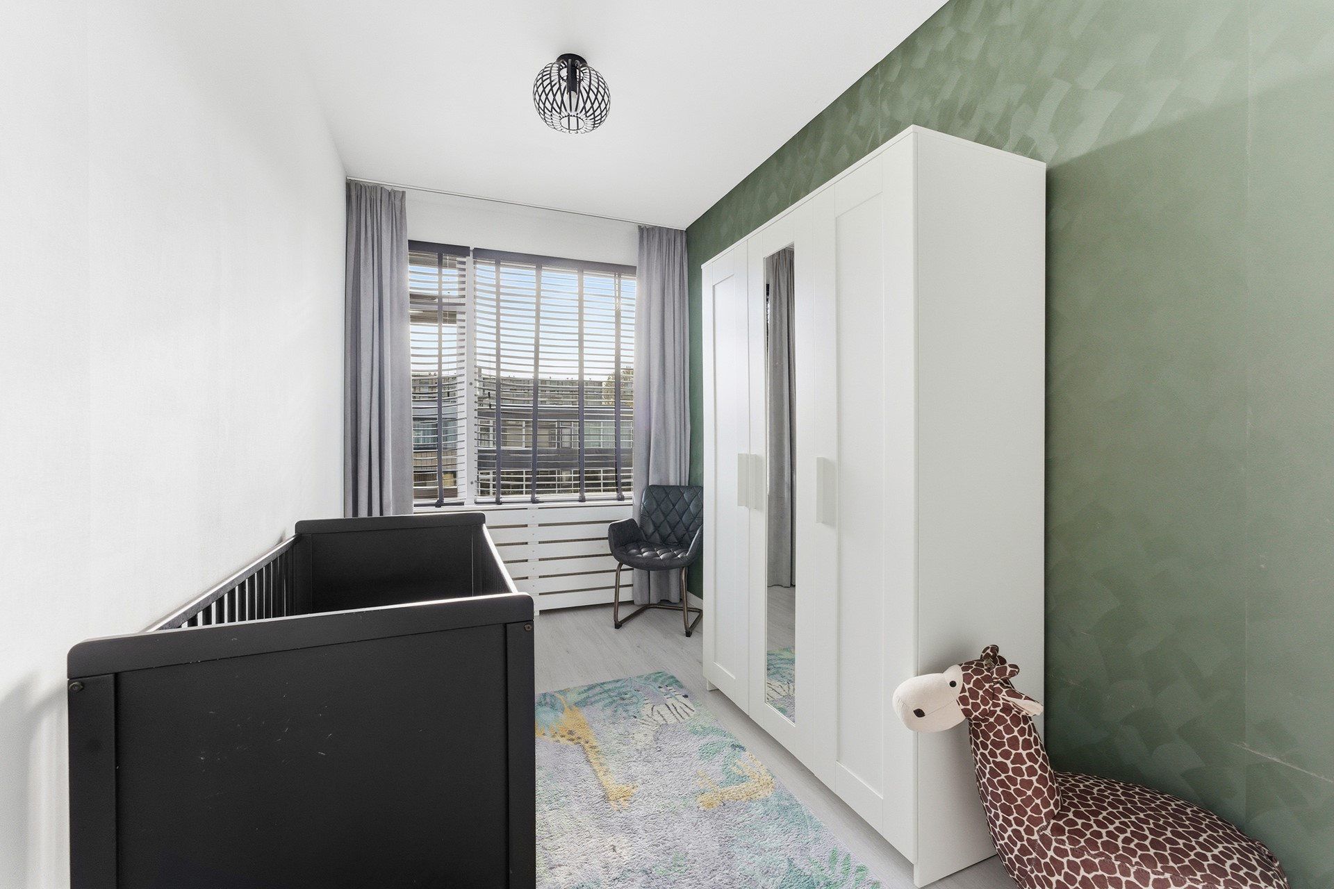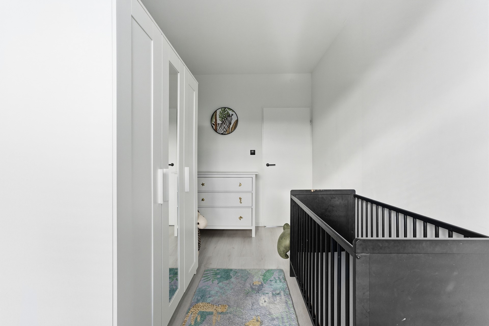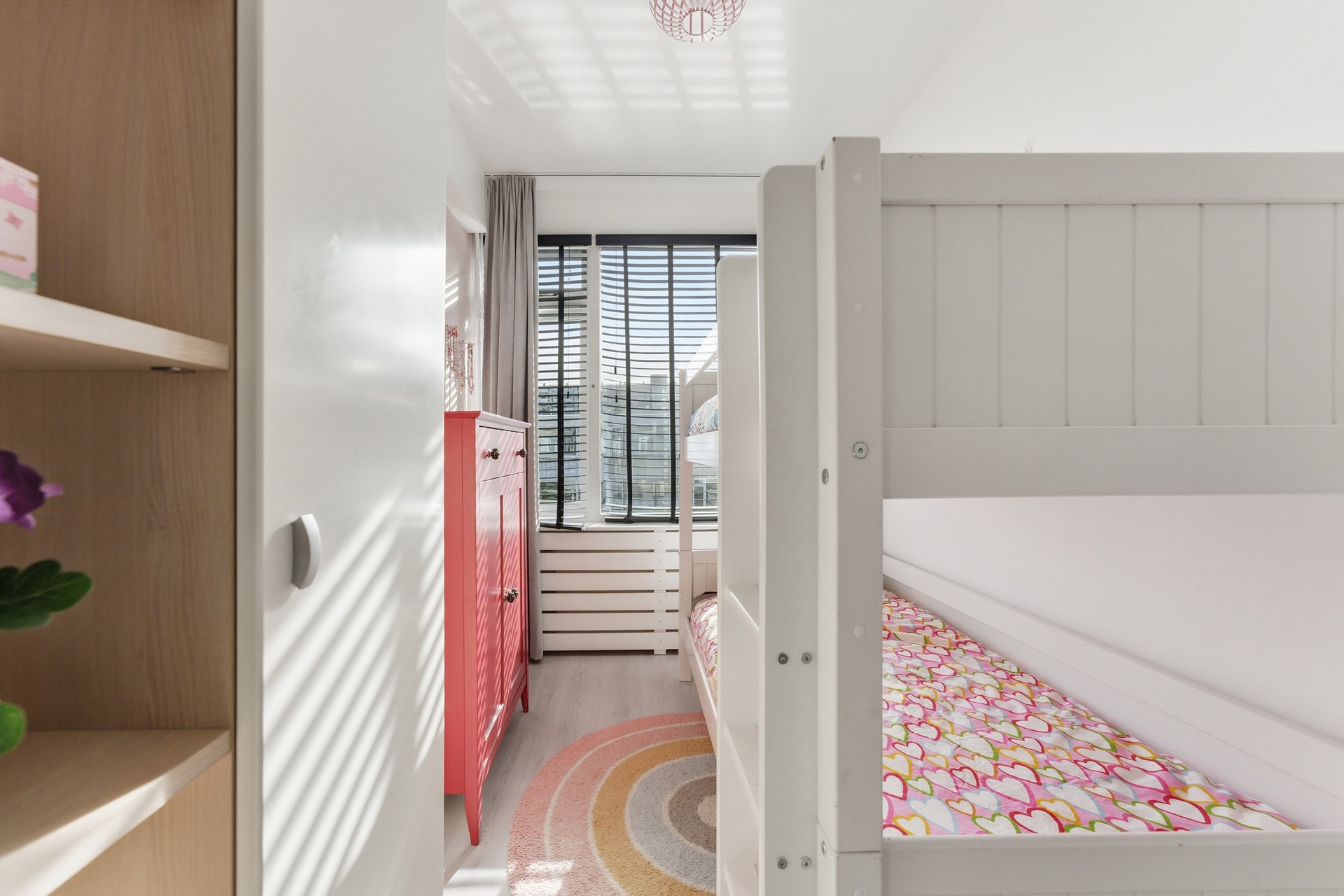 Slaapkamer 2: Een sfeervolle slaapkamer met uitzicht op de tuin. Momenteel ingericht als kinderslaapkamer, maar uiteraard ook prima te gebruiken als werk- of logeerkamer. Dankzij het raam komt er veel licht naar binnen, waardoor de kamer fris en uitnodigend aanvoelt. De kamer is voorzien van dubbelglas en een hor, en afgewerkt met laminaat, glasvliesbehang en een spuitwerk plafond.