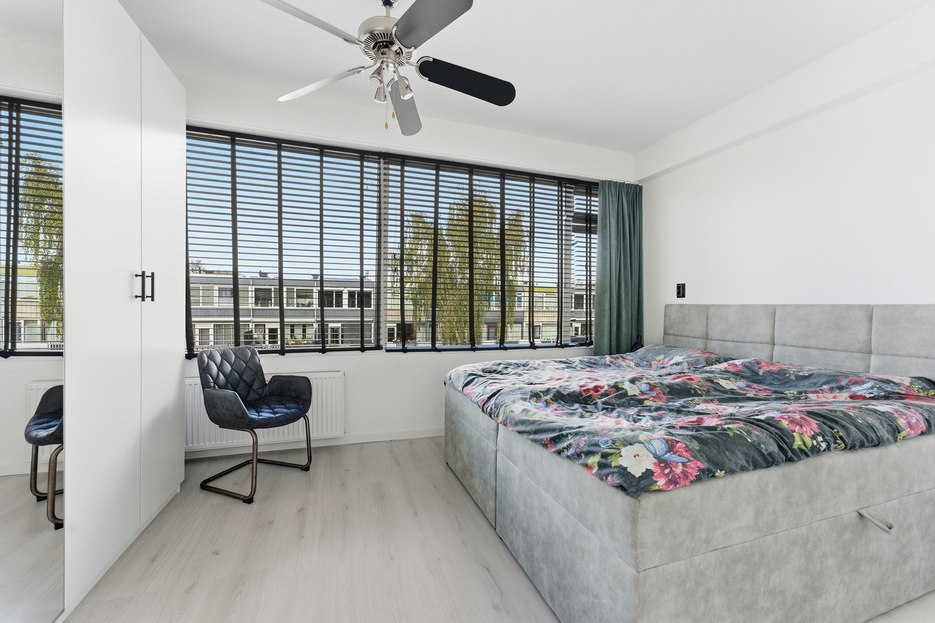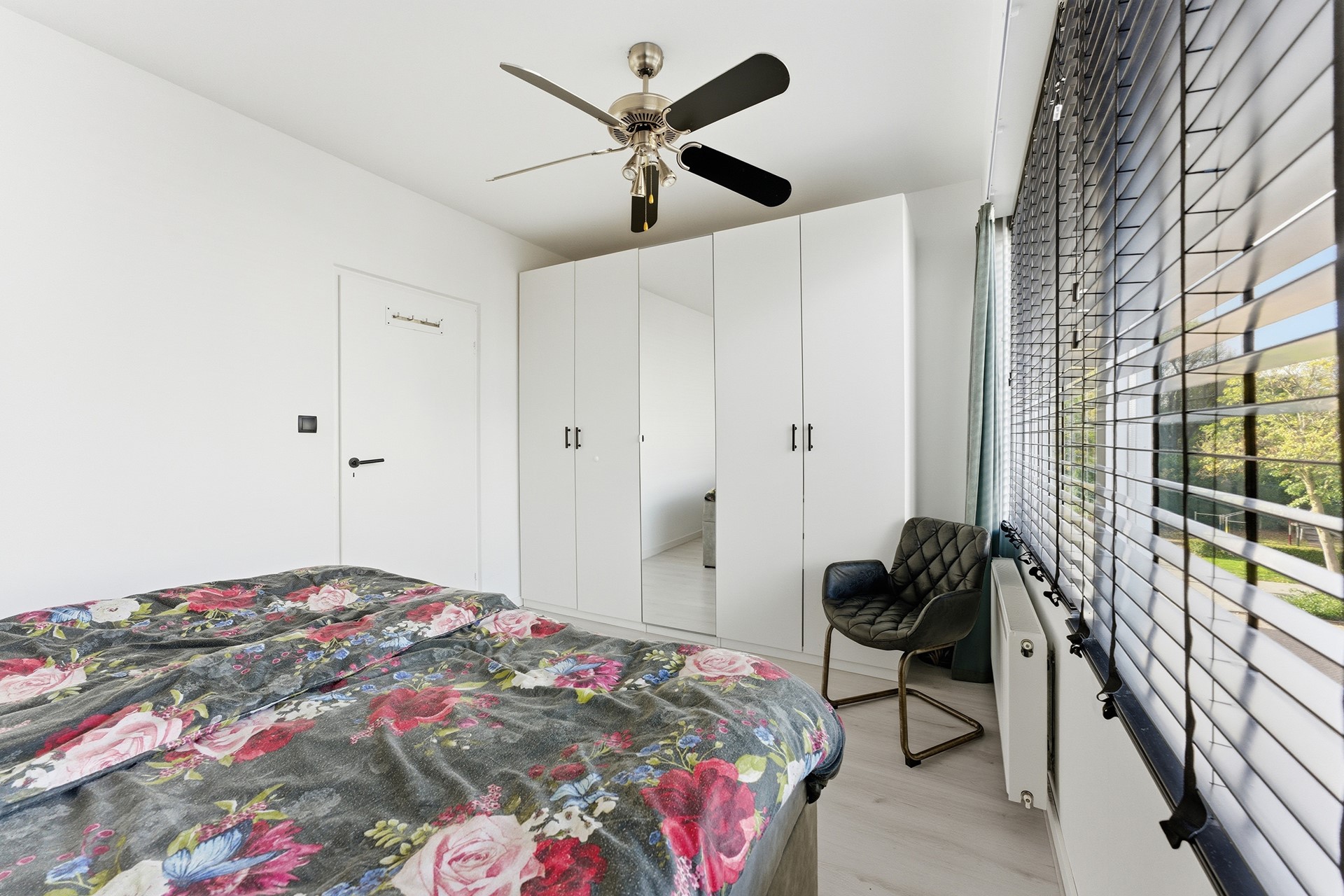 Slaapkamer 1: De slaapkamer aan de voorzijde is ruim en licht, met grote ramen en een plafondlamp met ventilator. De buizen zijn netjes weggewerkt in een koof, wat zorgt voor een strak geheel. Hier is ruimte genoeg voor een groot bed, een kast en eventueel een bureau of een gezellige leeshoek. De kamer is afgewerkt met een laminaatvloer, gestuukte wanden en een spuitwerk plafond.