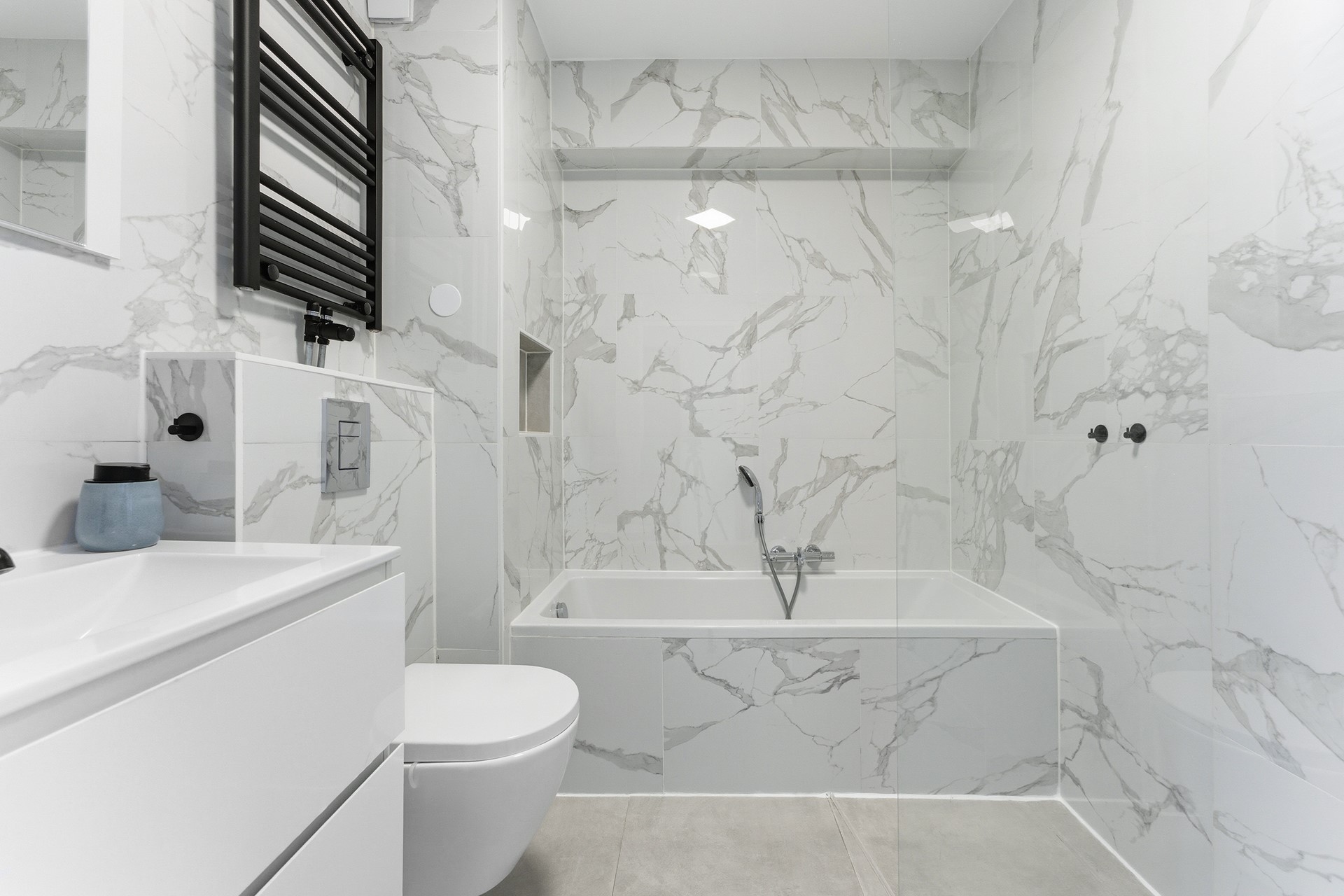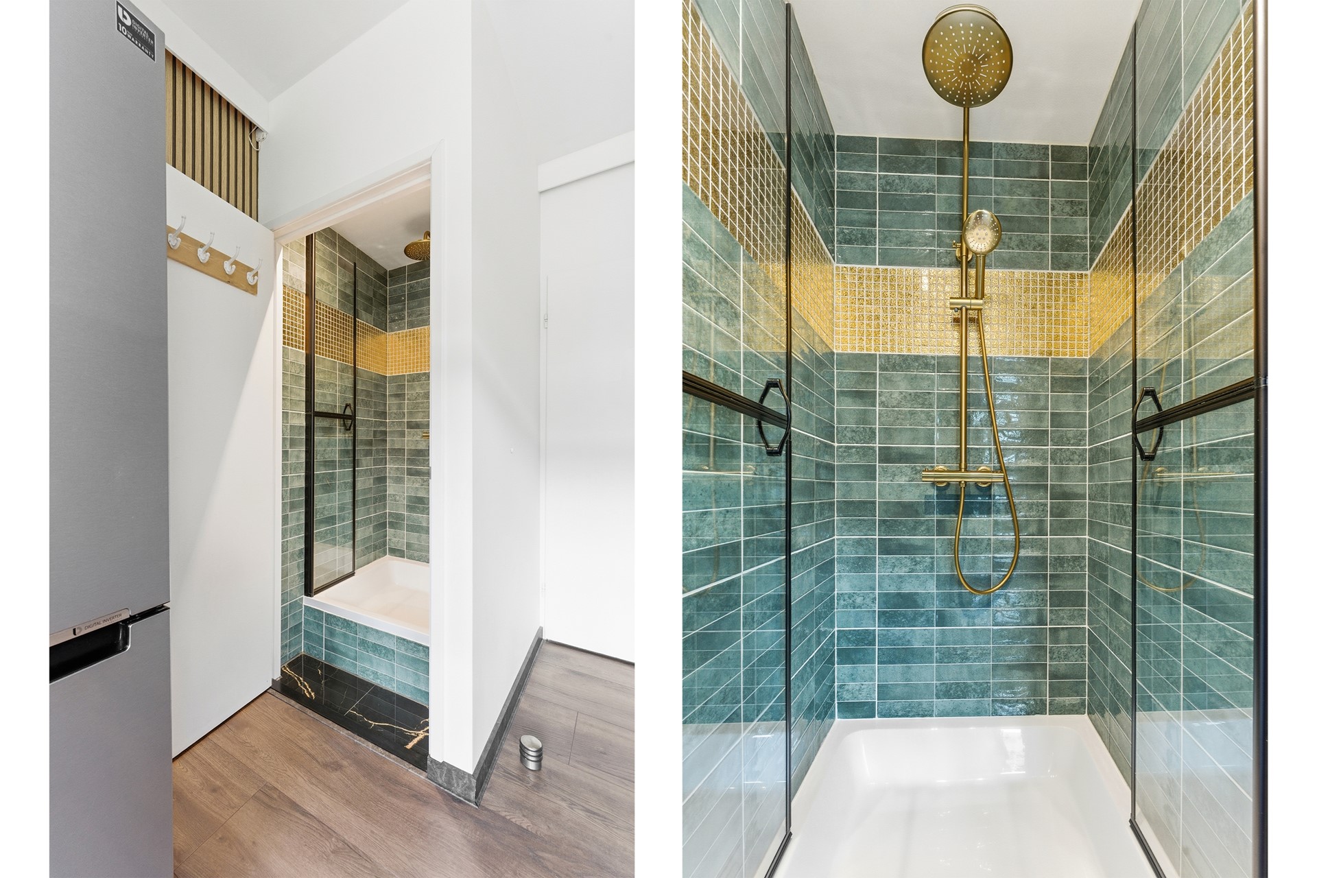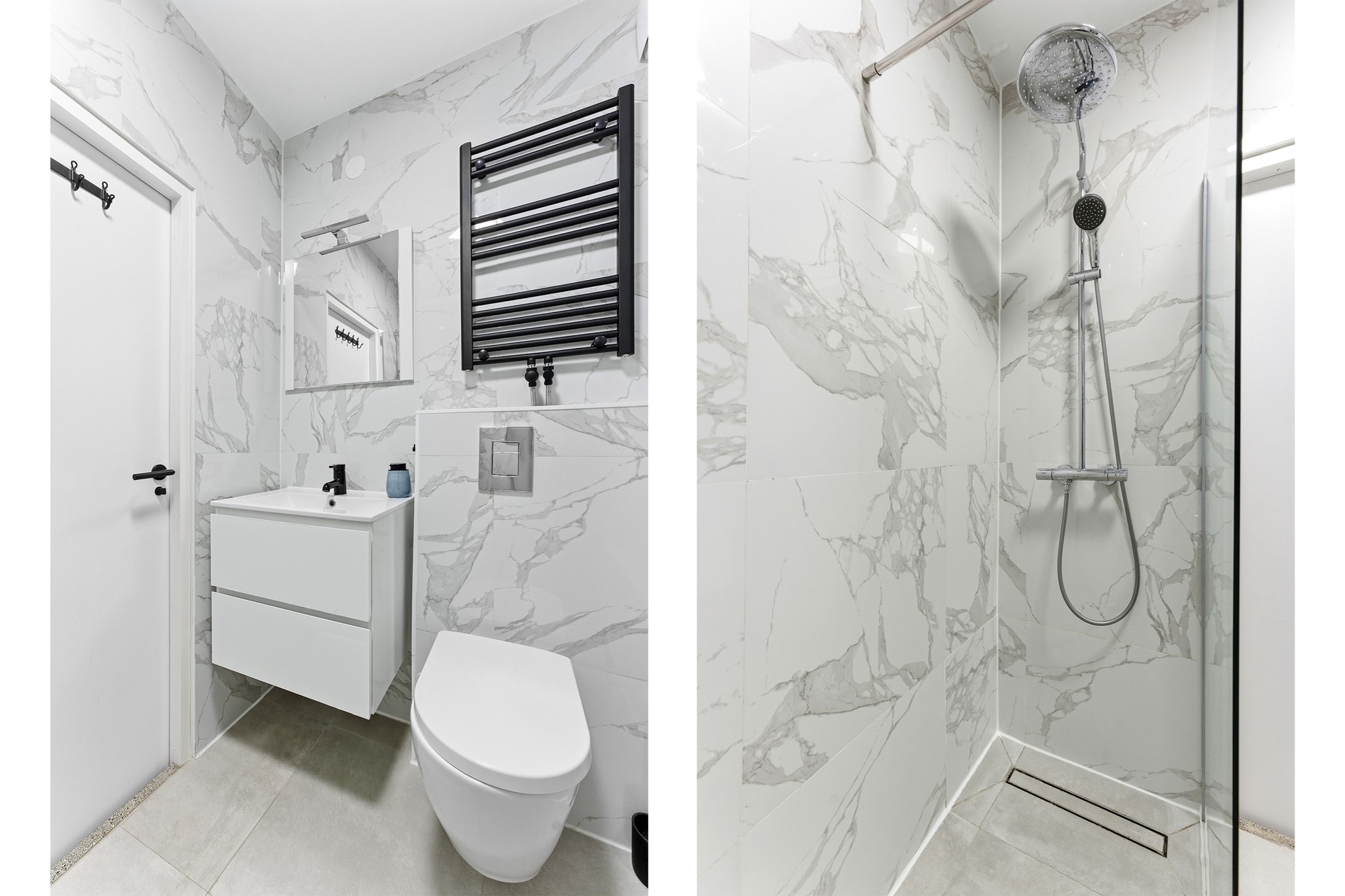 Badkamer: De badkamer is netjes en volledig betegeld in marmerlook. Hier heb je alle ruimte om je dag ontspannen te beginnen of juist af te sluiten. De badkamer is voorzien van een ligbad, inloopdouche, zwevend toilet, designradiator en een meubel met geïntegreerde wastafel. De combinatie van lichte tegels en moderne voorzieningen zorgt voor een frisse, verzorgde uitstraling.