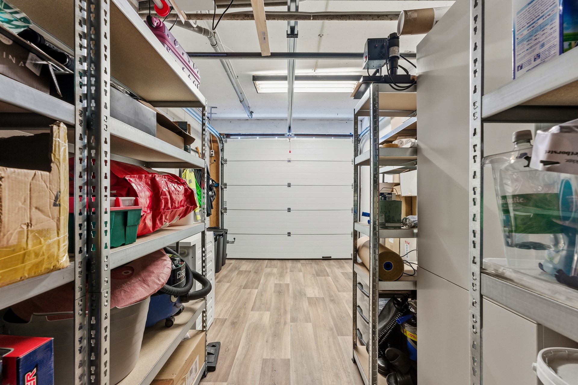 Garage: Inpandige garage met elektrisch bedienbare deur, voorzien van water en elektra, en een aansluiting voor de wasmachine. Er is een praktische vliering gemaakt voor extra bergruimte. De garage is ook vanuit de hal bereikbaar.