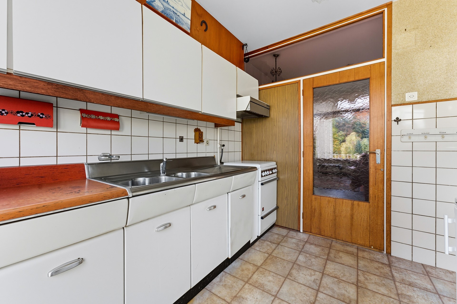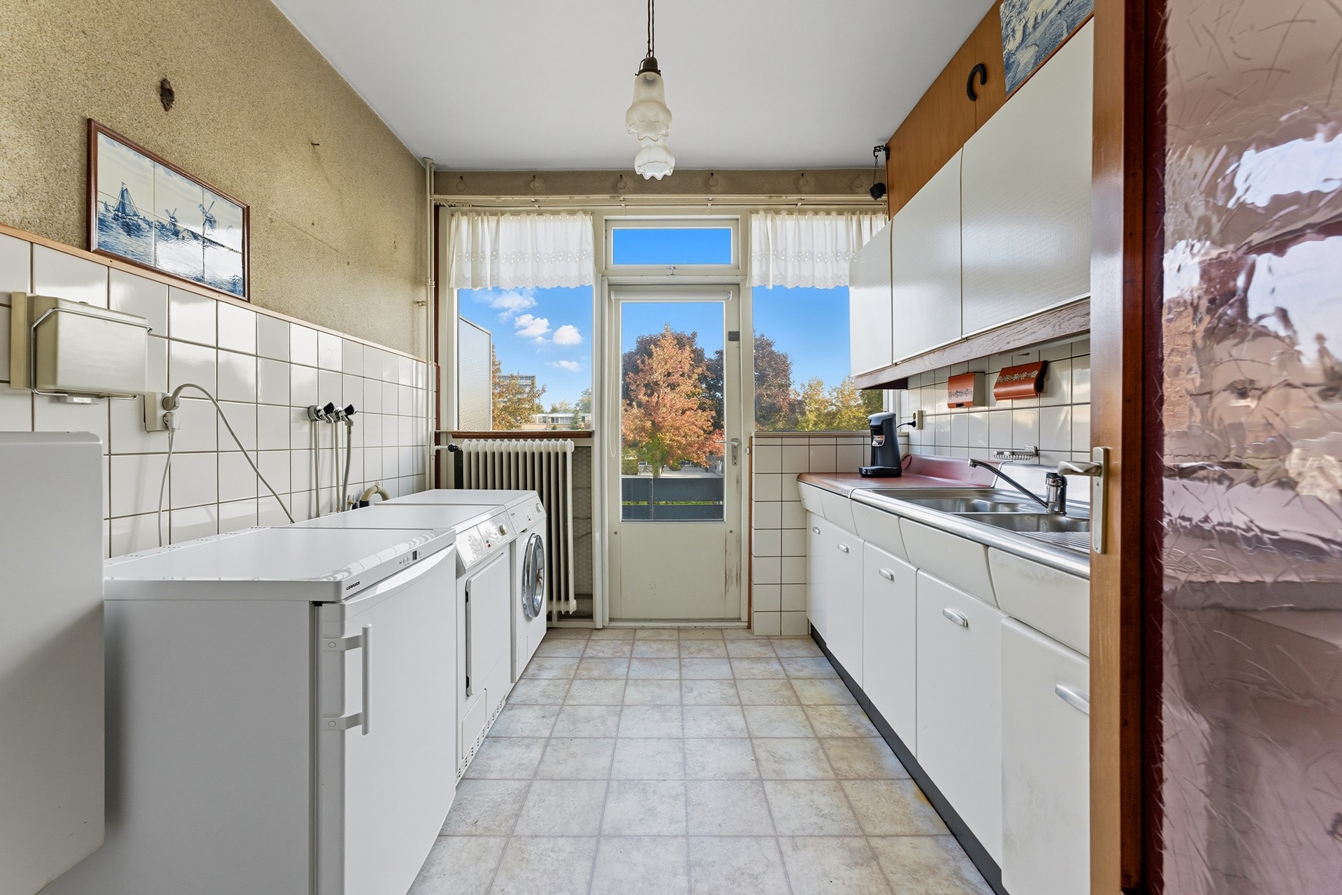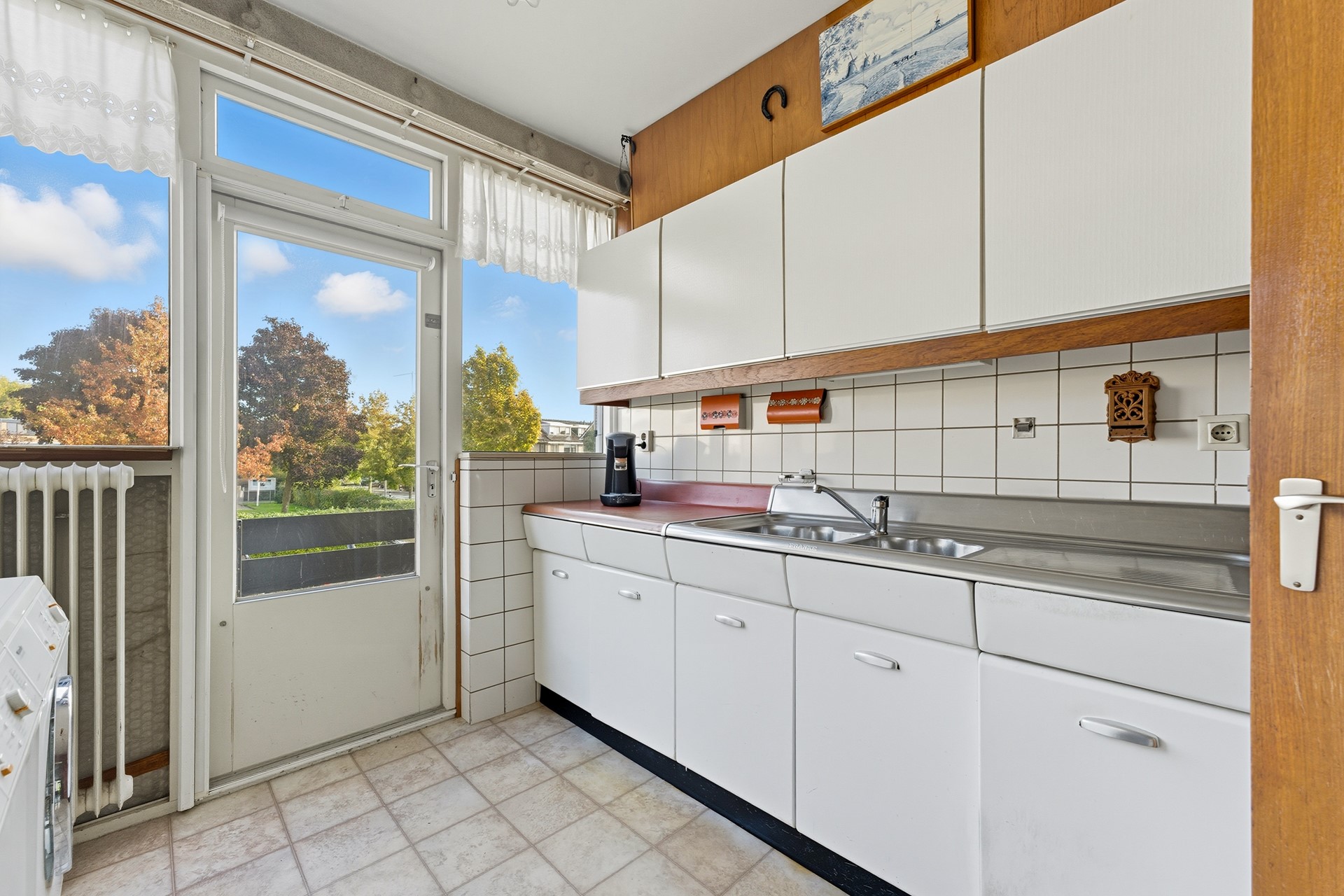 Keuken: De keuken is op dit moment gedateerd en toe aan vernieuwing. Een perfecte kans om er helemaal je eigen droomkeuken van te maken. Ons advies is om de keuken open te maken naar de woonkamer, zodat er een moderne, lichte leefruimte ontstaat. De huidige keuken is voorzien van een oven en een 4-pits gasstel. Pak je Pinterest-bord er dus maar bij, want hier kun je echt iets moois van maken! De keuken geeft toegang tot het balkon aan de voorzijde. De ruimte is afgewerkt met een zeilvloer, tegelwanden en een gestuukt plafond.