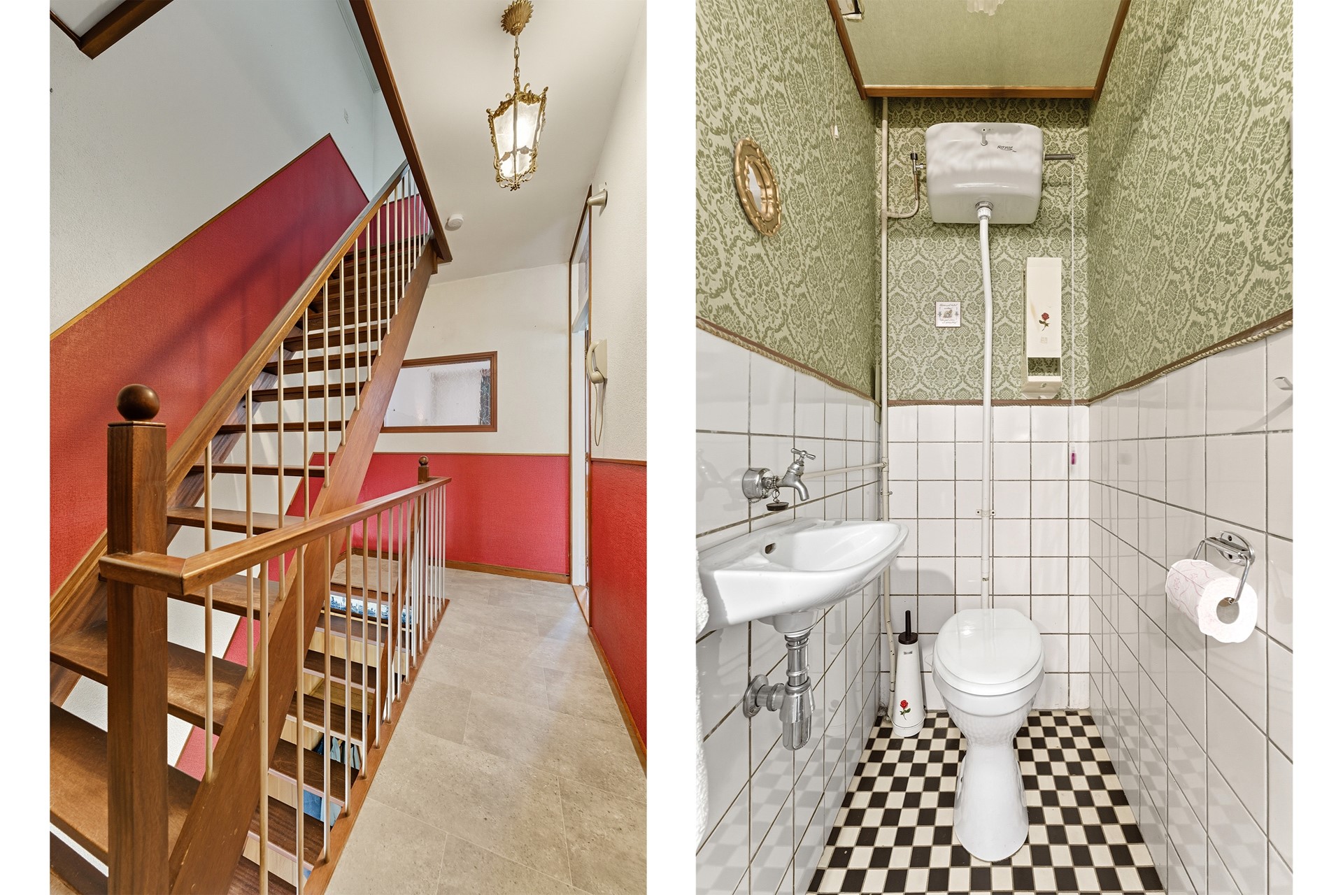 Toilet: Gedateerde toiletruimte, deels betegeld en voorzien van een staand closet en fonteintje.