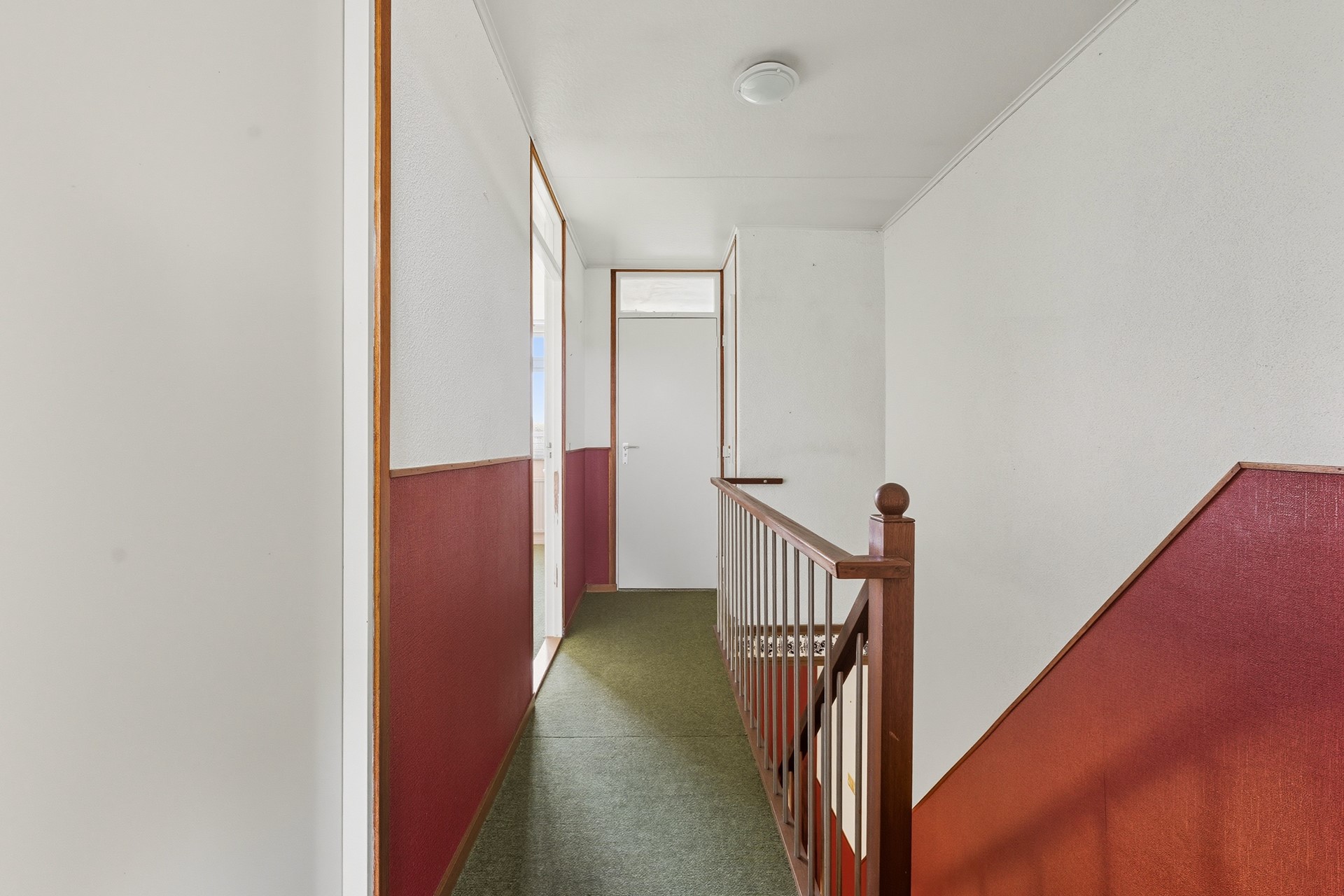 Overloop: De grote overloop in L-vorm geeft toegang tot de slaapkamers, badkamer en een inbouwkast. Deze inbouwkast dient als opstelplaats van de Cv-ketel. De ruimte is afgewerkt met vloerbedekking, structuurwanden en een zachtboard plafond.