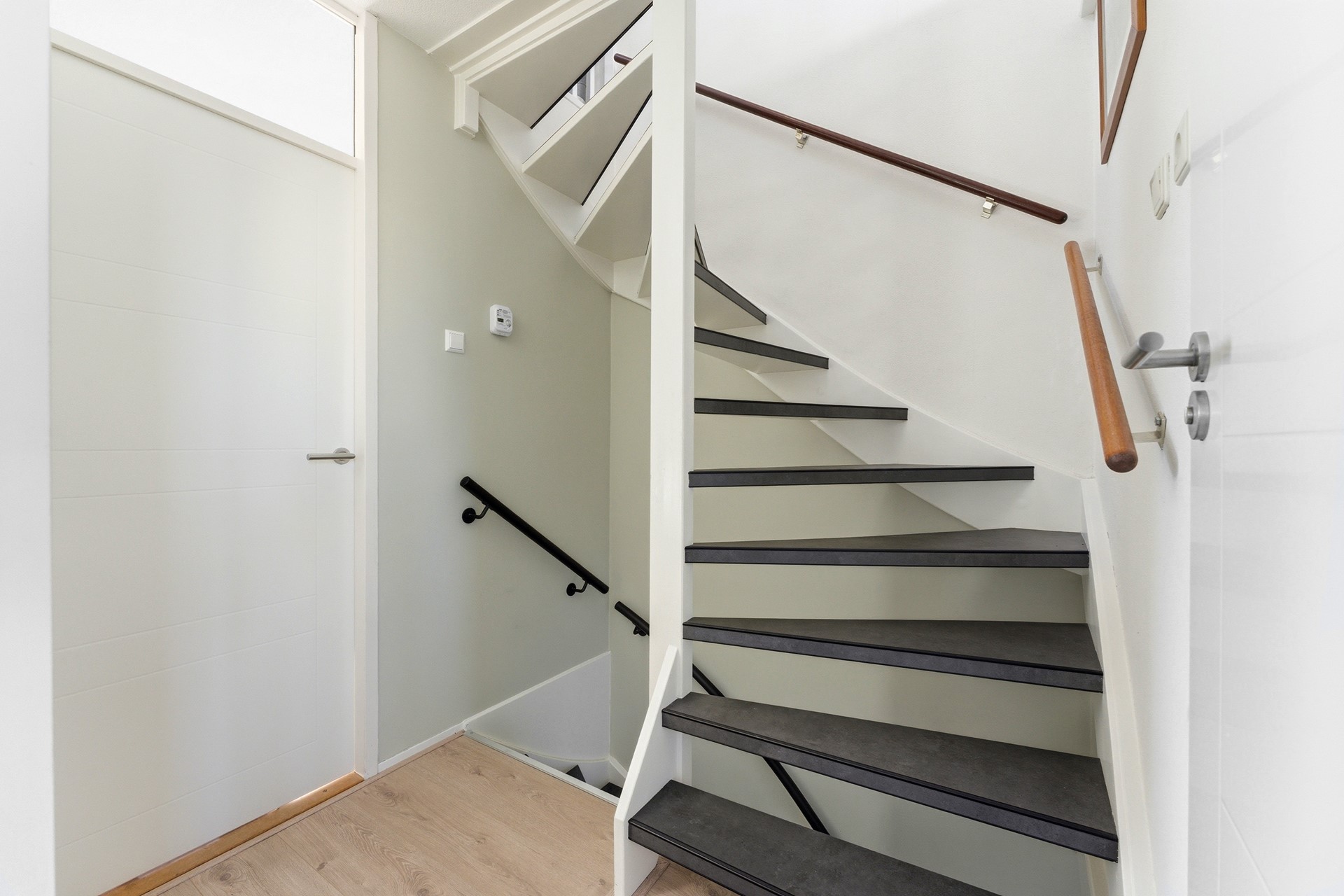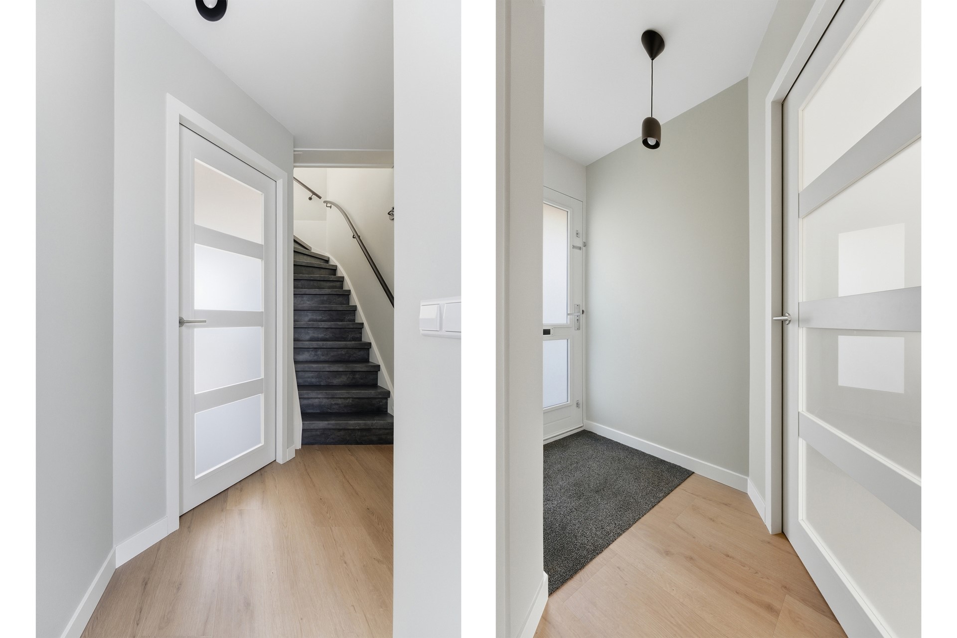 Entree: Bij binnenkomst in de hal ervaar je direct de frisse, moderne uitstraling. Vanuit de hal heb je toegang tot de toilet, meterkast, woonkamer en trapopgang naar de eerste verdieping. Deze ruimte is strak afgewerkt met een PVC-vloer, glad gestuukte wanden en een spuitwerkplafond.