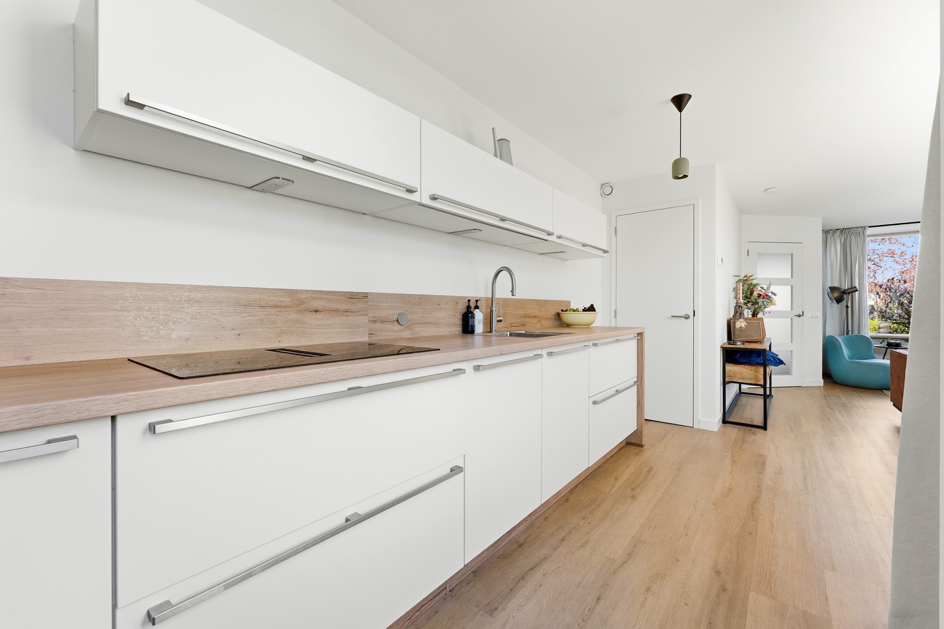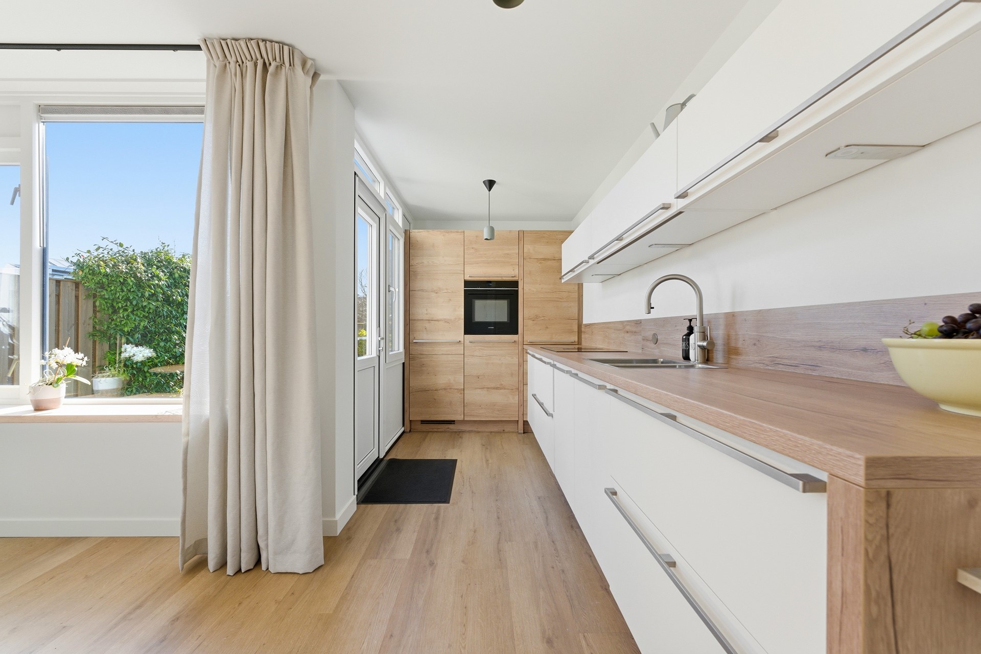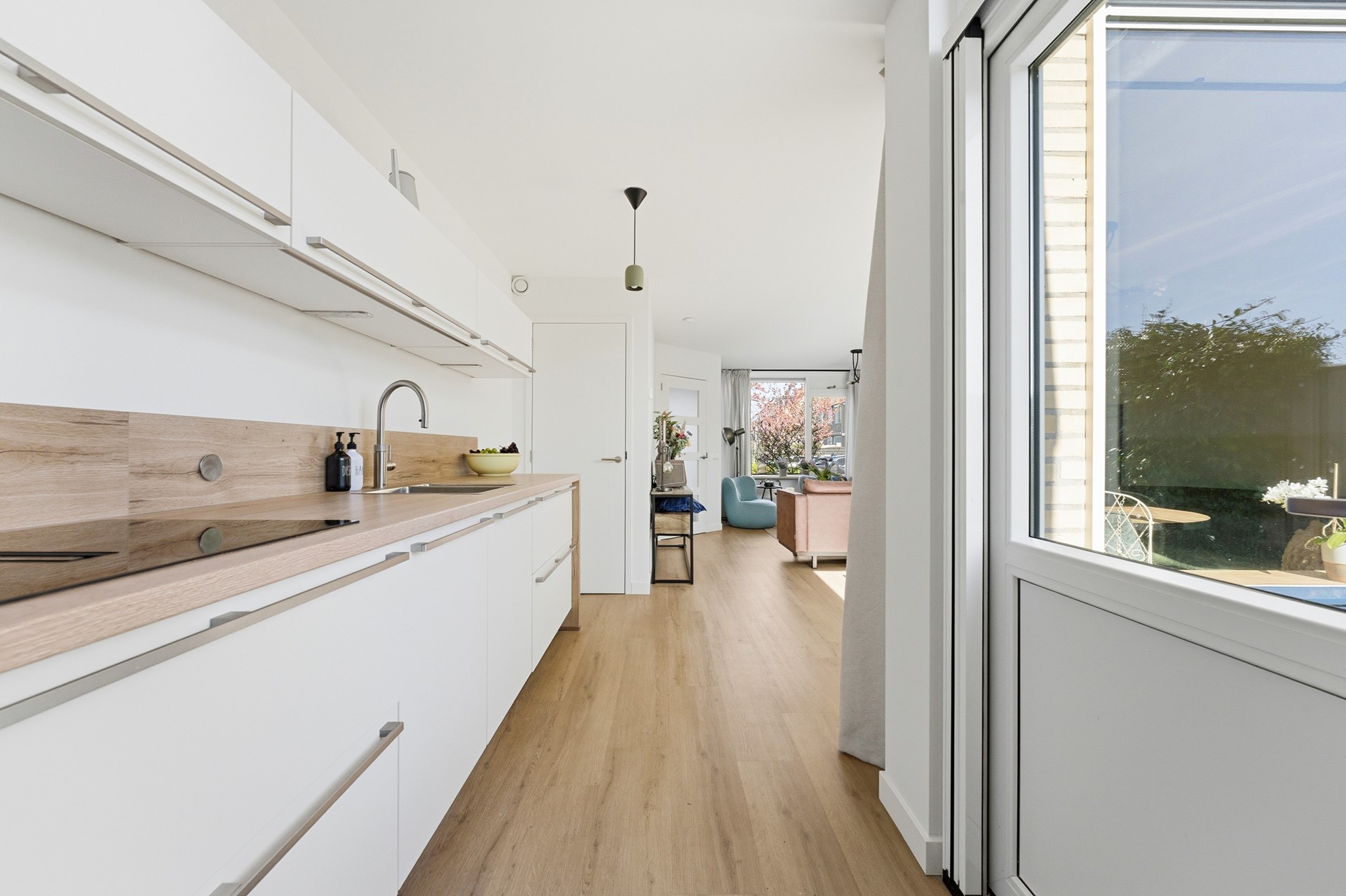 Keuken: In de open keuken uit 2024 komen design en functionaliteit samen. Deze strakke ruimte is uitgevoerd in een tijdloze, neutrale kleurstelling en nodigt direct uit tot uitgebreid koken. Je beschikt hier over topapparatuur, waaronder een inductiekookplaat met geïntegreerde afzuiging, een Quooker en een moderne oven. De koelkast, vriezer en vaatwasser zijn naadloos ingebouwd. Via de achterdeur betrek je de tuin eenvoudig bij je leefruimte.